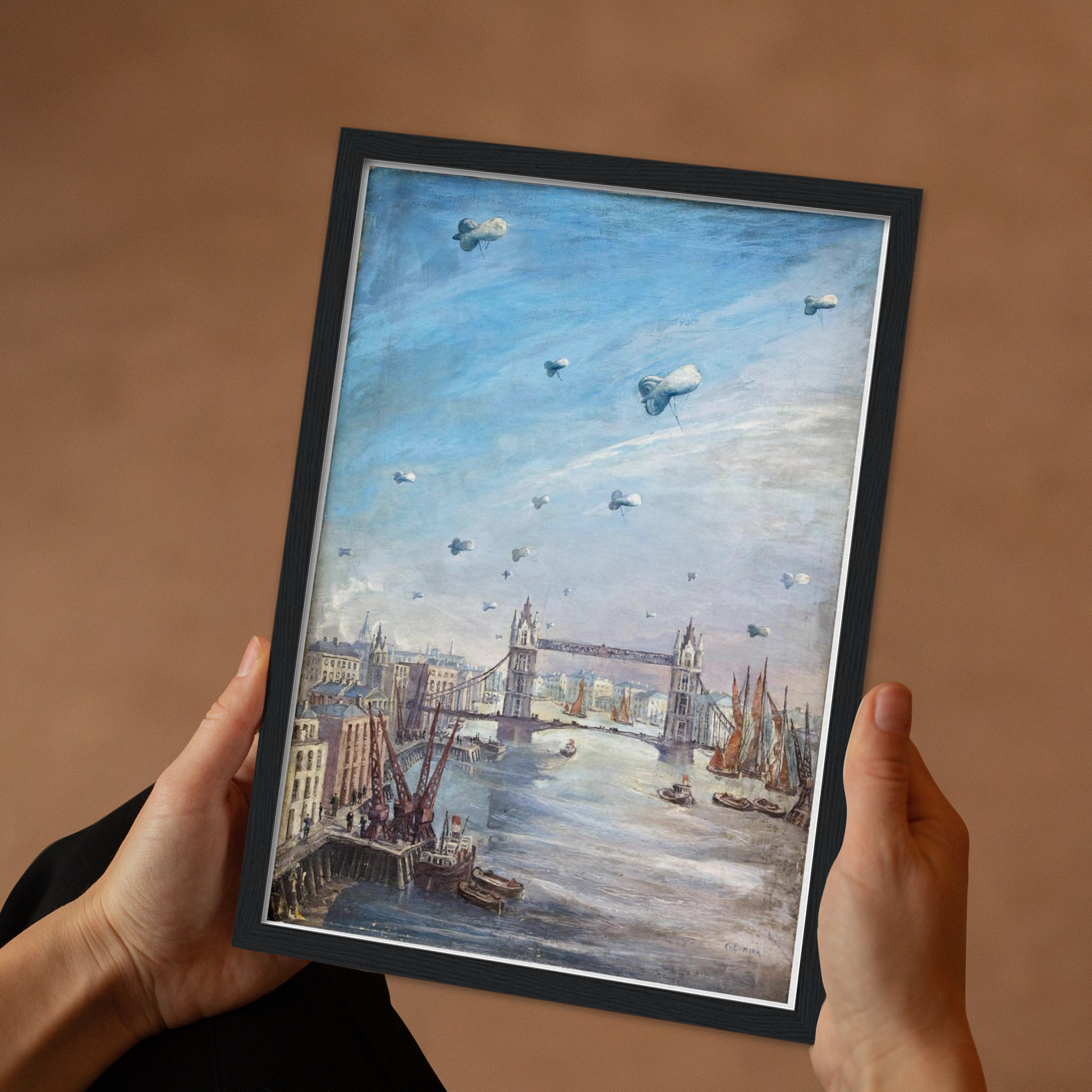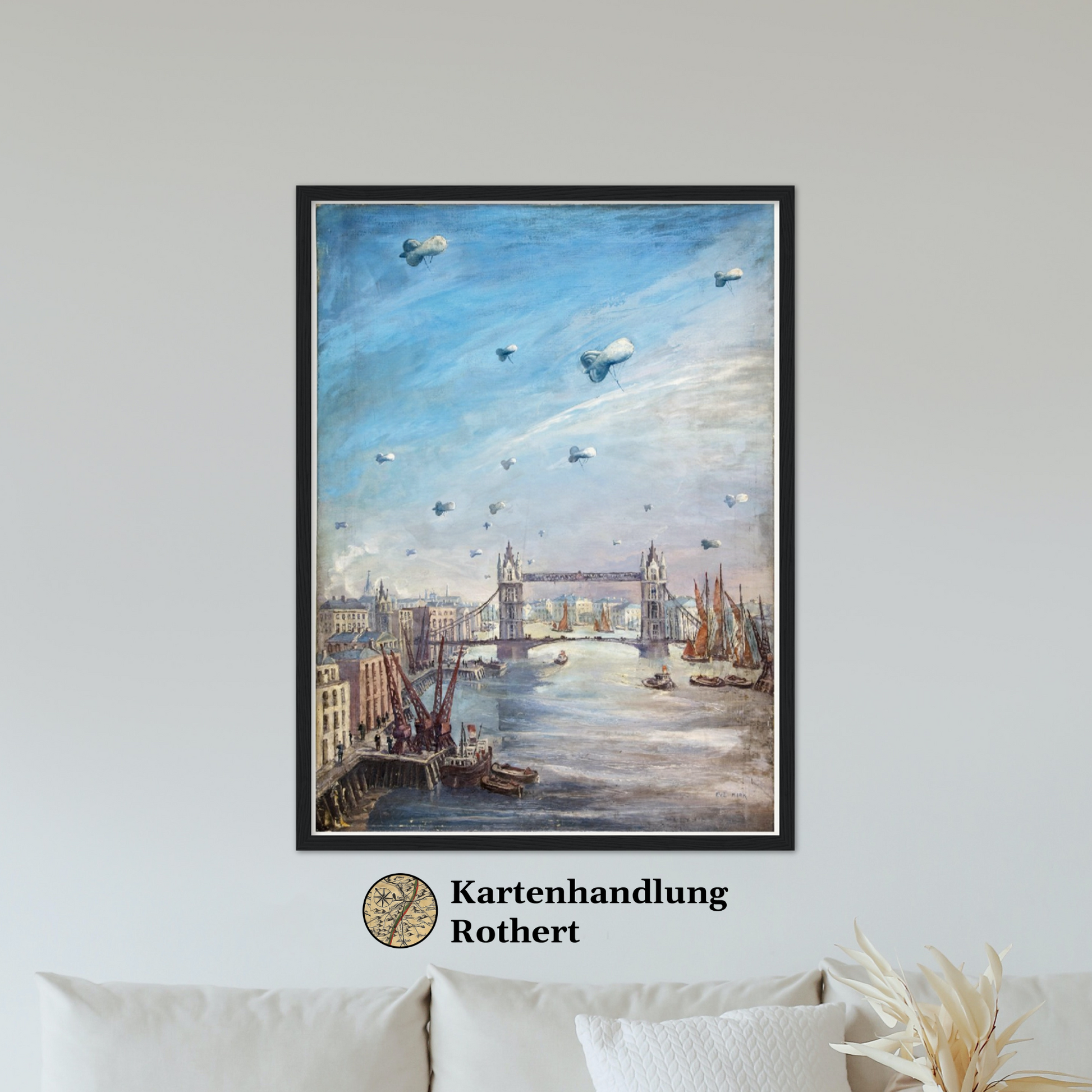 Diese historische Ansicht der London Tower Bridge aus dem Jahr 1939 entführt Sie in eine Zeit, in der die Welt im Wandel war. Die Brücke, ein Meisterwerk der Ingenieurskunst, steht nicht nur als Symbol für die Verbindung zwischen den Ufern der Themse, sondern auch zwischen Tradition und Moderne. Die feinen Linien des Drucks und die akkurate Darstellung der Umgebung fangen die Atmosphäre dieser legendären Metropole eindrucksvoll ein. Während Sie sich in das Bild vertiefen, spüren Sie beinahe den Herzschlag Londons, eine Stadt, die trotz der Herausforderungen ihrer Zeit unermüdlich weiterlebte.