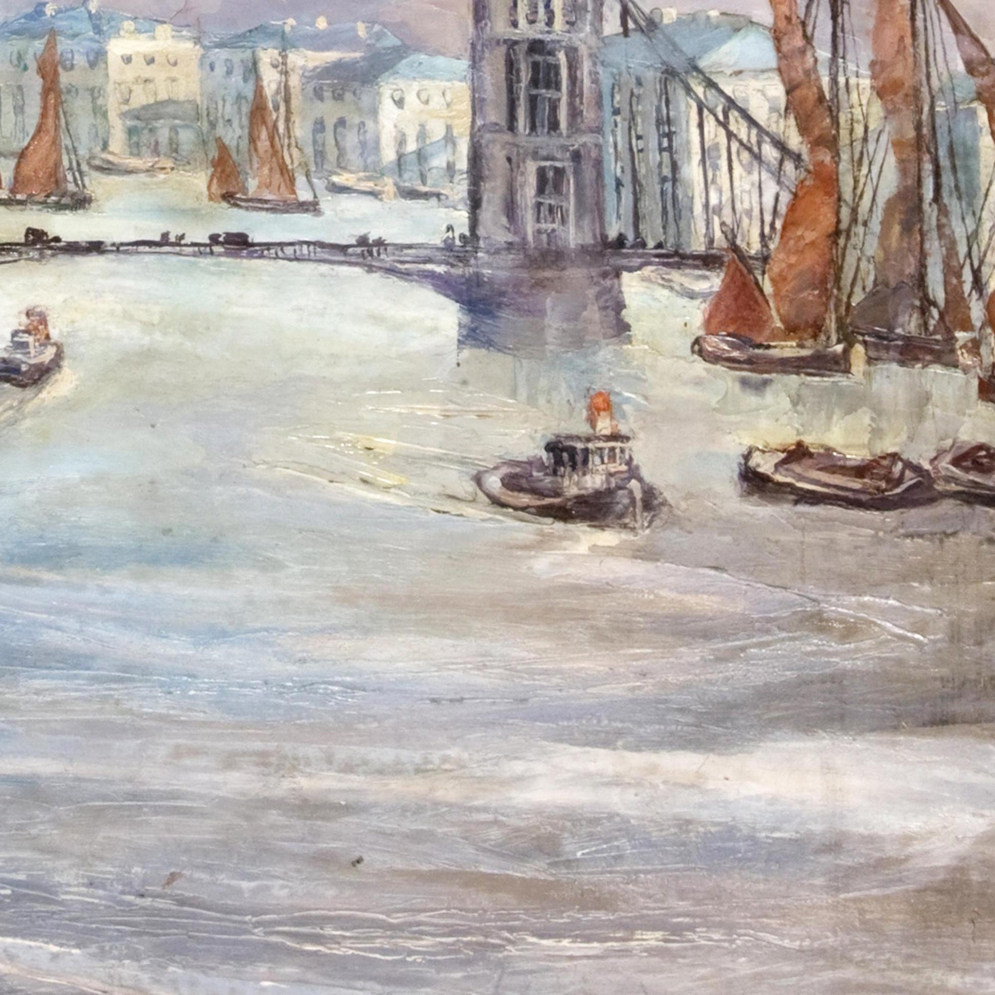 Die Aufnahme, auf der diese Karte basiert, stammt aus einer Zeit, als London, unter den drohenden Schatten des Zweiten Weltkriegs, seine Widerstandsfähigkeit demonstrierte. Die Tower Bridge, die 1894 eröffnet wurde und eine der bekanntesten Sehenswürdigkeiten Londons ist, hob und senkte ihre majestätischen Klappen weiterhin, um dem Schiffsverkehr Platz zu machen. Kartographen und Künstler hatten in jener Zeit die Aufgabe, nicht nur Präzision, sondern auch eine gewisse künstlerische Eleganz in ihren Werken zu vereinen. Diese Karte spiegelt die Feinheit ihrer Handwerkskunst wider und zeigt die Brücke in all ihren Details vor dem Hintergrund einer Stadt, die sich nie hat unterkriegen lassen. Ein exquisites Beispiel für die Verbindung von Kunst und Kartographie, die bis heute kulturell von Bedeutung ist und die Entwicklung und Geschichte Londons reflektiert.