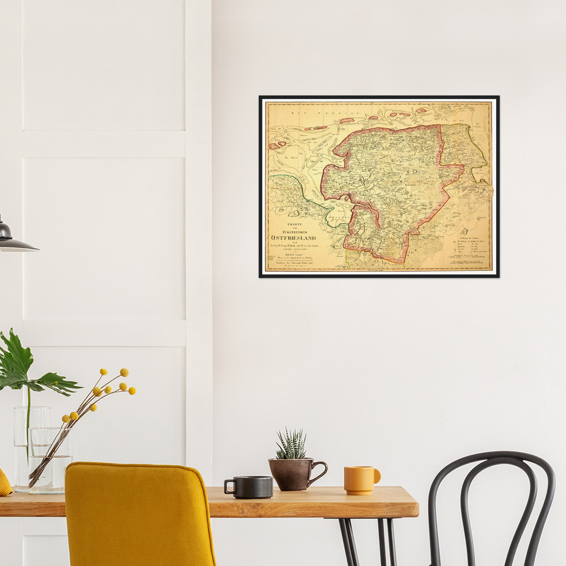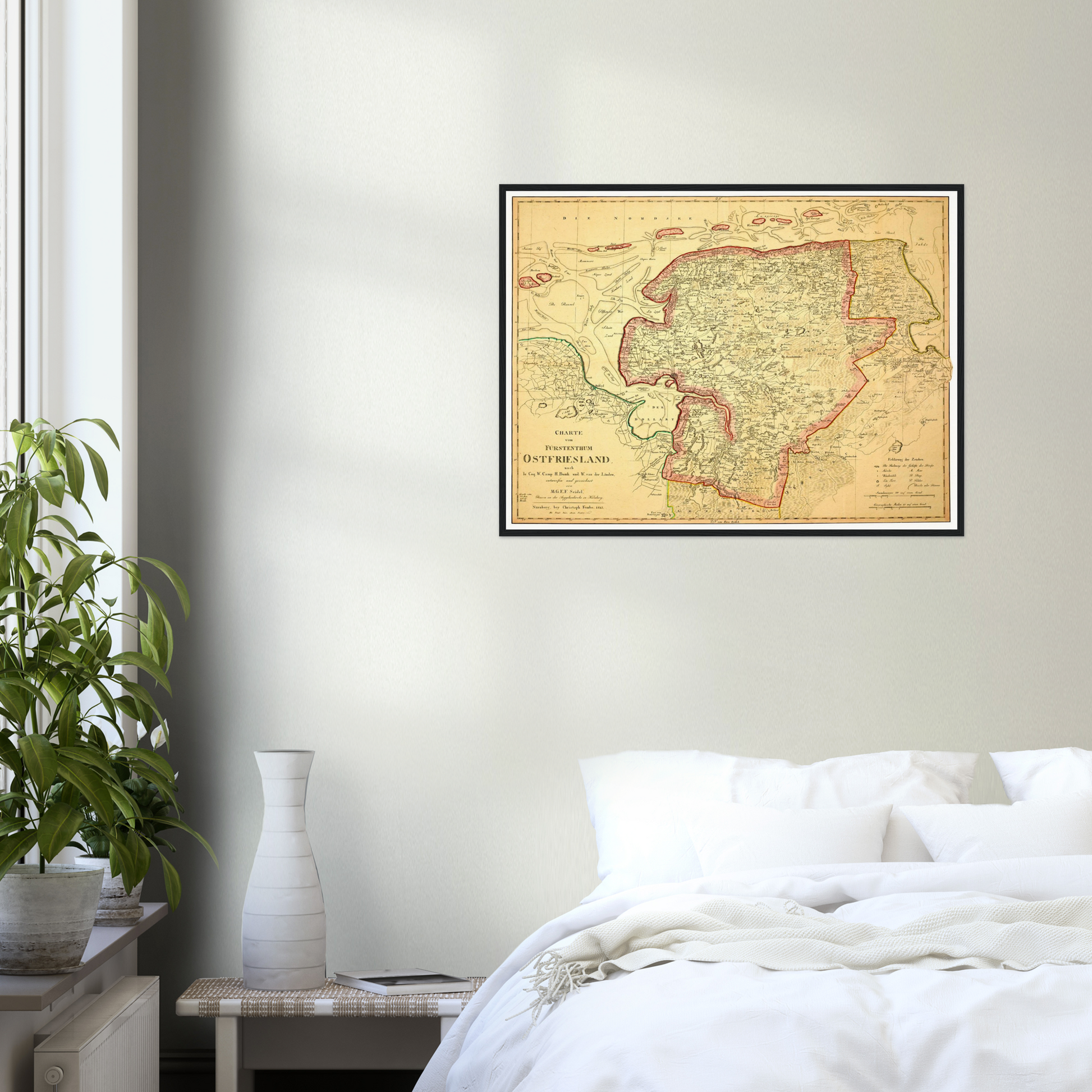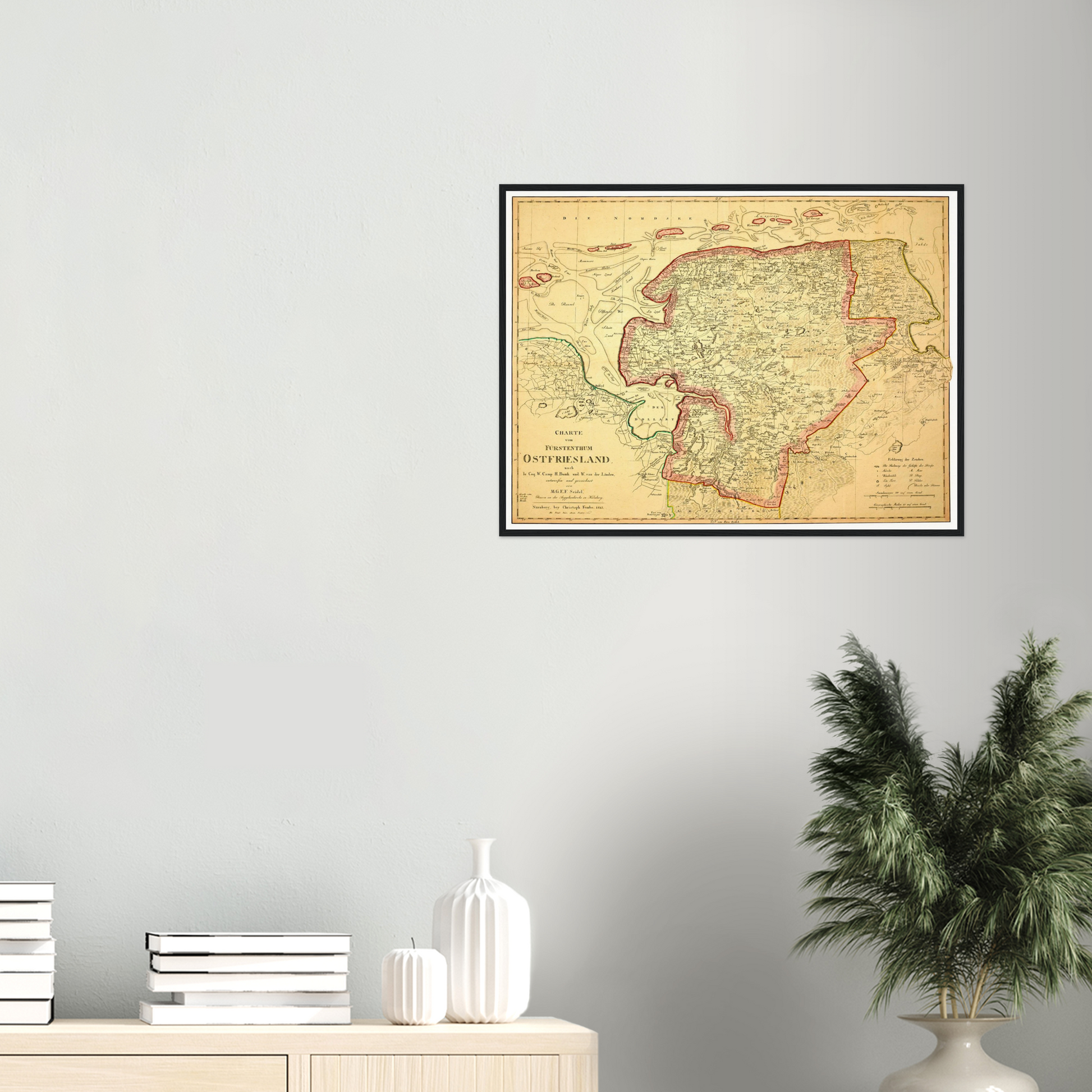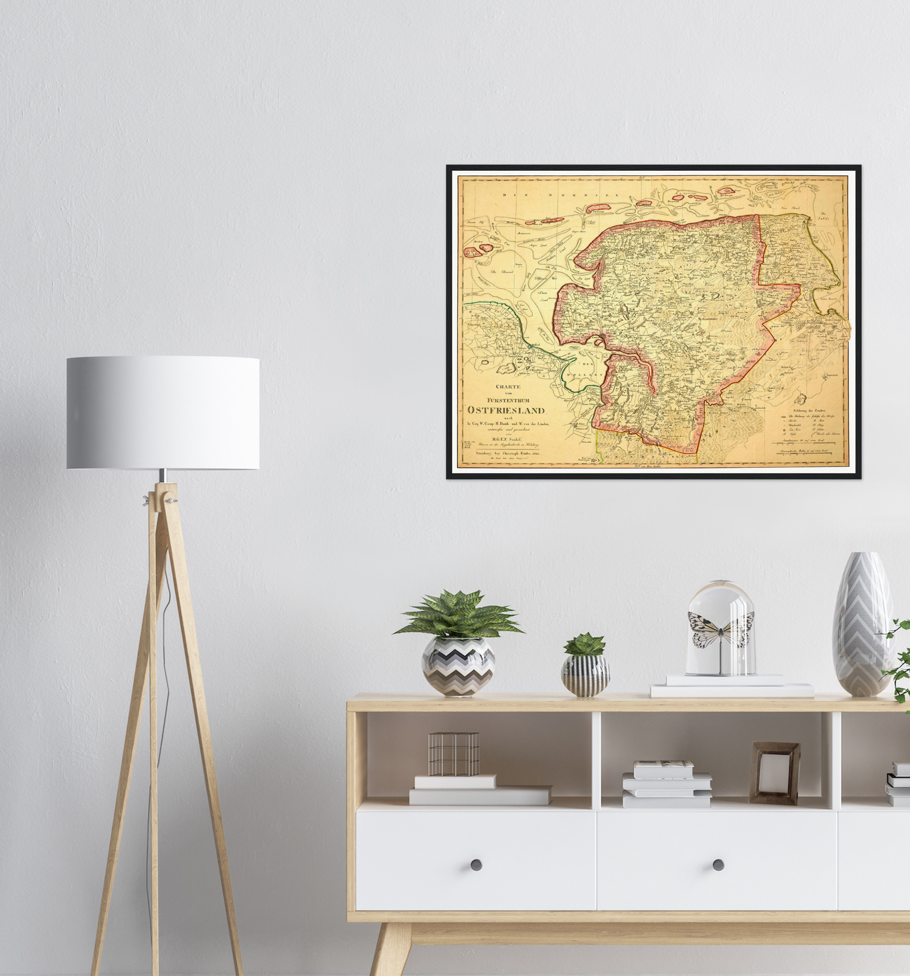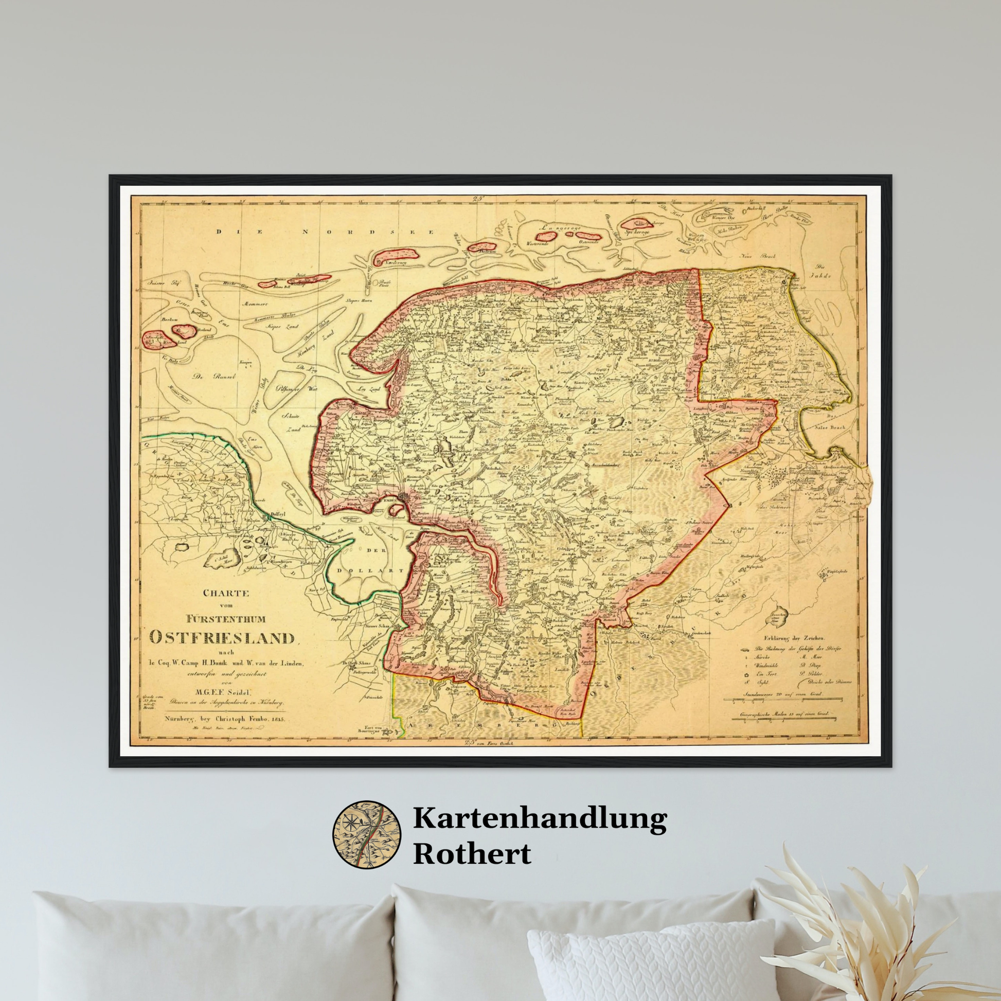 Unsere Nachdrucke entstehen in Archivqualität auf feinstem, mattem Papier (250 g/m²), das jedem Raum eine eindrucksvolle Note verleiht. Die hochauflösende Digitalisierung und farbgetreue Rekonstruktion garantieren, dass du ein Stück Geschichte in unvergleichlicher Schärfe und Brillanz erlebst. Jeder Druck wird auf Bestellung in Deutschland gefertigt und ist in 3 erlesenen Größen erhältlich: 40x30 - 80x60 cm. Zum Schutz wird jede Karte in einer stabilen Verpackung versandt. Optional kannst du zwischen natürlichen, dunkelbraunen oder schwarzen Holzrahmen sowie einem eleganten schwarzen Metallrahmen wählen, der mit bruchsicherem Plexiglas ausgestattet ist.