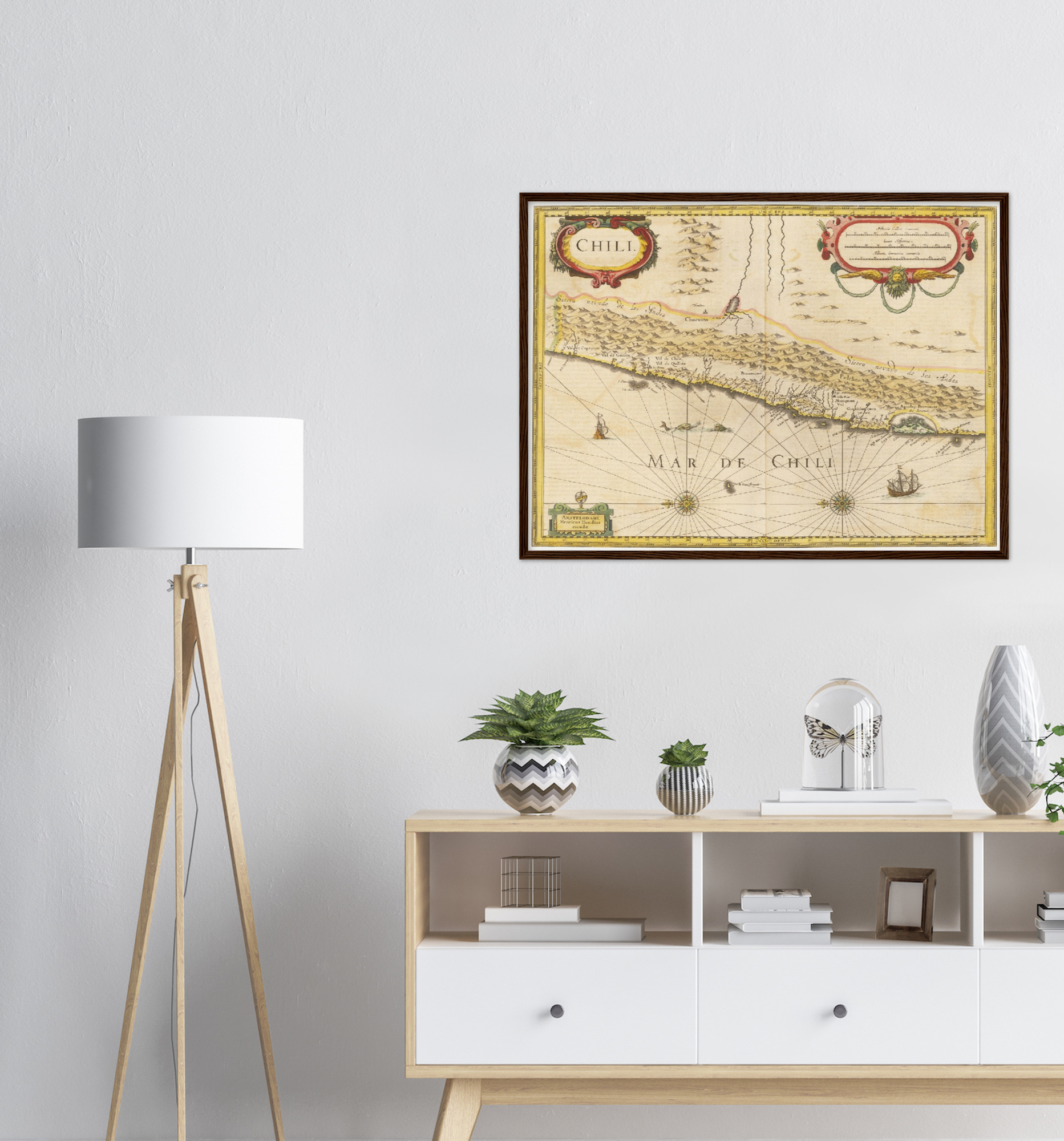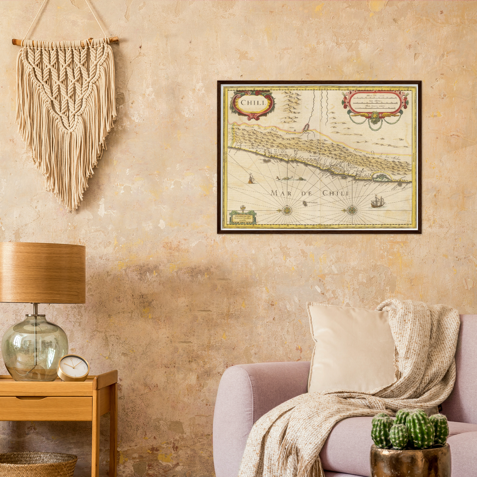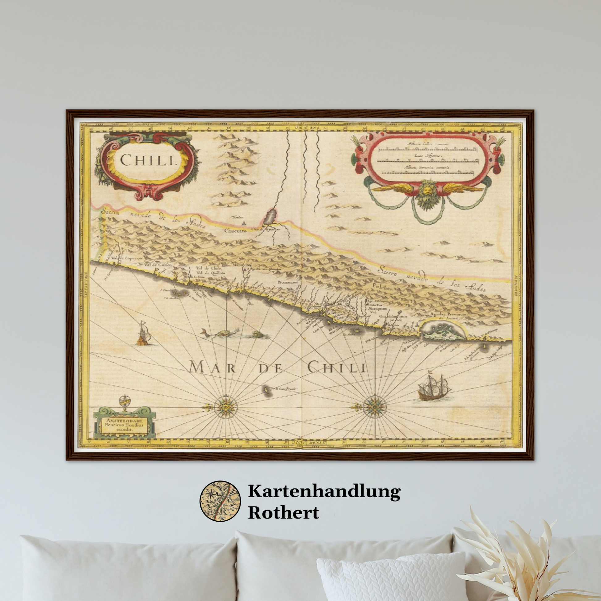 Tauchen Sie ein in die faszinierende Welt des 17. Jahrhunderts, als Entdecker und Kartographen die Konturen neuer Welten erkundeten. Die historische Landkarte von Chile aus dem Jahr 1638 entführt Sie in eine längst vergangene Epoche. Diese Karte fasziniert durch ihre präzisen Gravuren und vermittelt den Eindruck einer noch unentdeckten Wildnis. Die kunstvollen Linien und der historische Stil wecken die Neugier auf eine Zeit, in der die Geheimnisse des Südkontinents noch nicht vollständig gelüftet waren, und laden dazu ein, die Vergangenheit mit neuen Augen zu sehen.