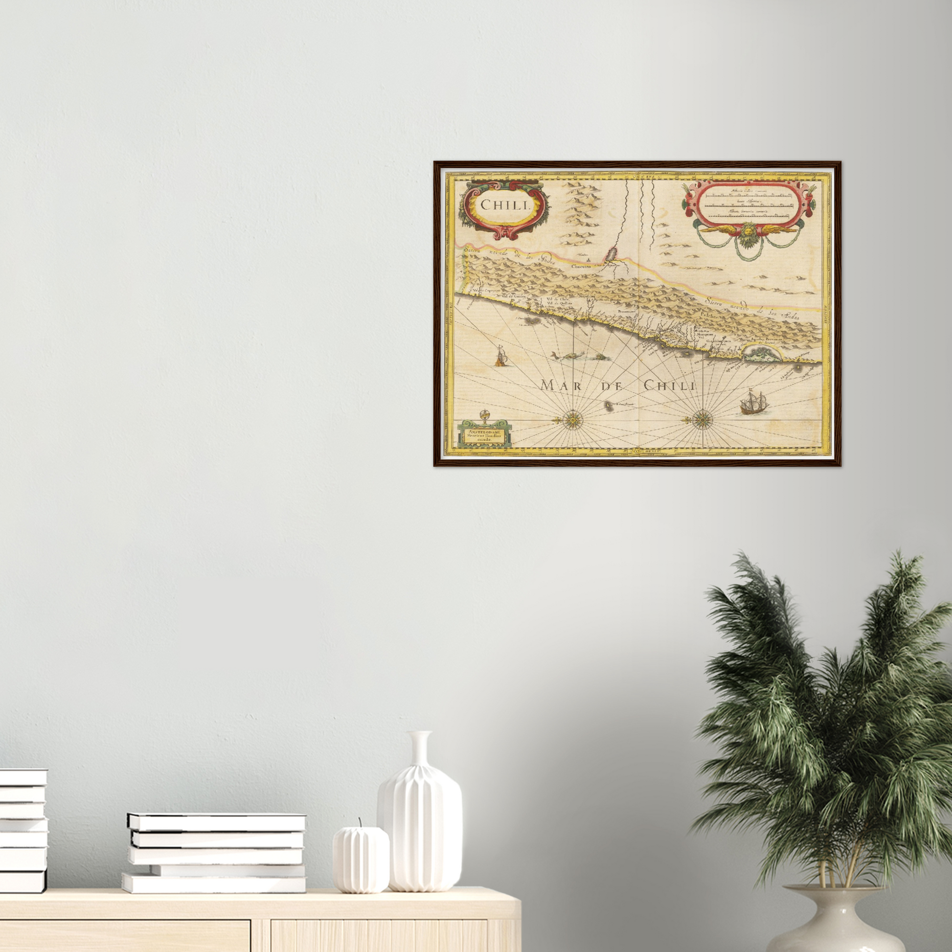 Lassen Sie sich auf eine Reise ins 17. Jahrhundert entführen mit dieser historischen Landkarte von Chile um 1638, die beeindruckende Details einer noch unberührten Welt zeigt.