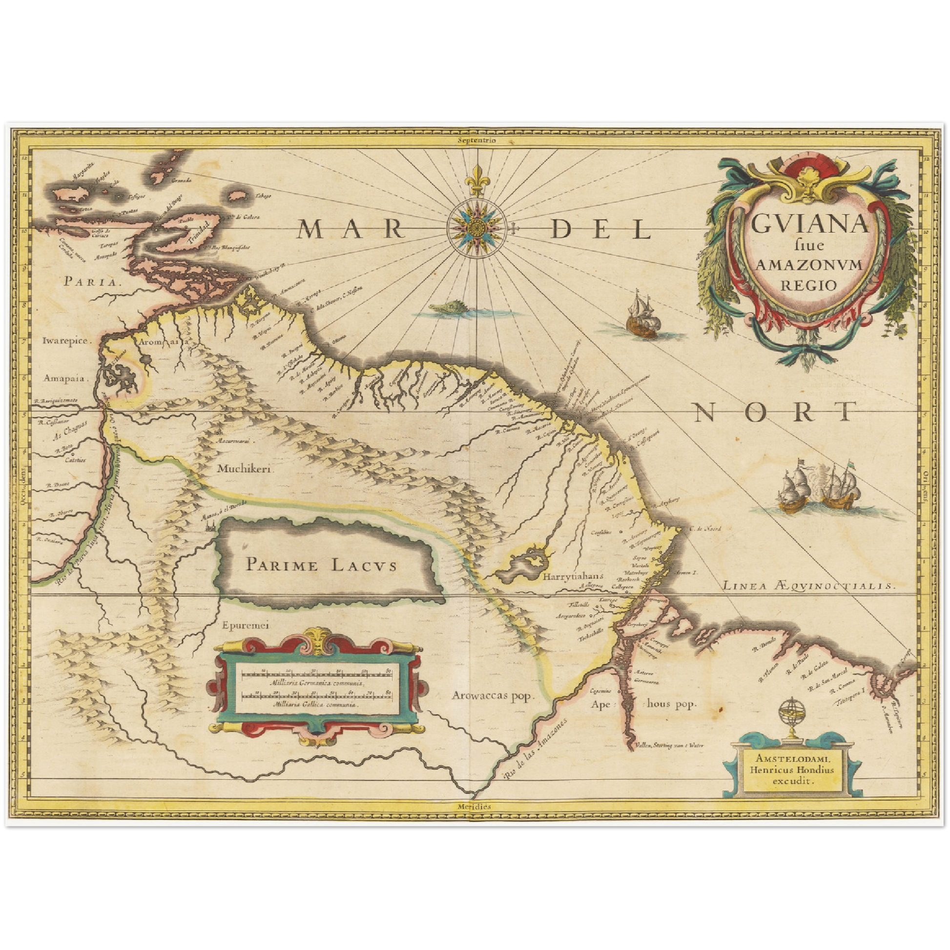 Im Jahr 1638 befand sich die Welt im Umbruch, geprägt von Entdeckungsreisen und kolonialem Eifer. Diese Karte von Guyana entstand in einer Zeit, als europäische Kartographen emsig daran arbeiteten, die unbekannten Skripte des südamerikanischen Kontinents zu erfassen. Sie ist ein Zeugnis der frühen kartographischen Kunst, meisterhaft geschaffen von einem noch unbekannten, aber offensichtlich erfahrenen Kartographen jener Zeit. Besonders bemerkenswert ist die Art und Weise, wie diese Landkarte die natürlichen Ressourcen, Flussläufe und topographischen Details präsentiert – ein Spiegel der damaligen Vorstellungen und Erwartungen. Ihre Rolle als Ort des Wunders und der Möglichkeiten ist in der akribischen Darstellung klar zu erkennen, und bis heute bleibt sie ein wertvolles Stück Kulturgut, das die Neugierde und den Wissensdurst der Menschen weckt.