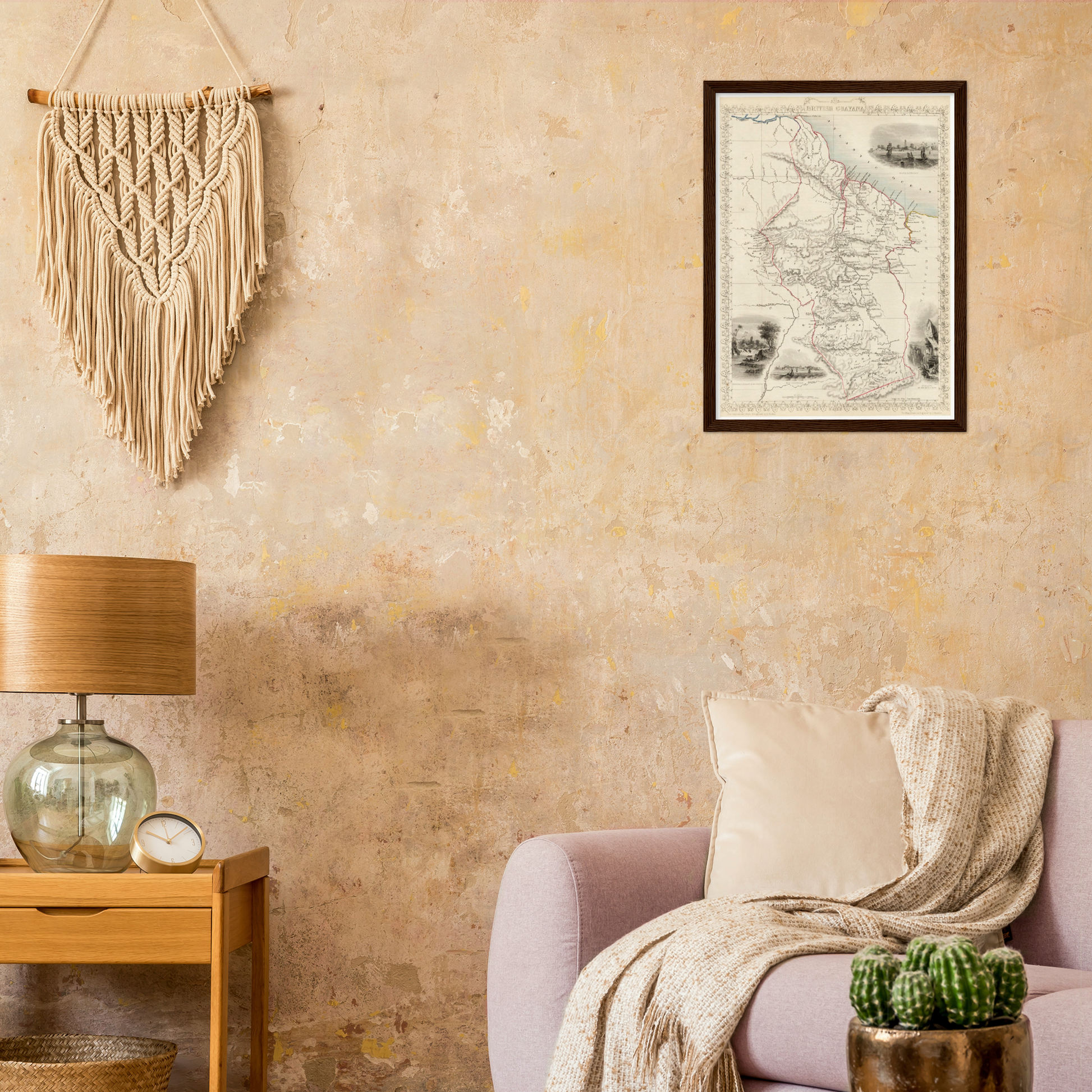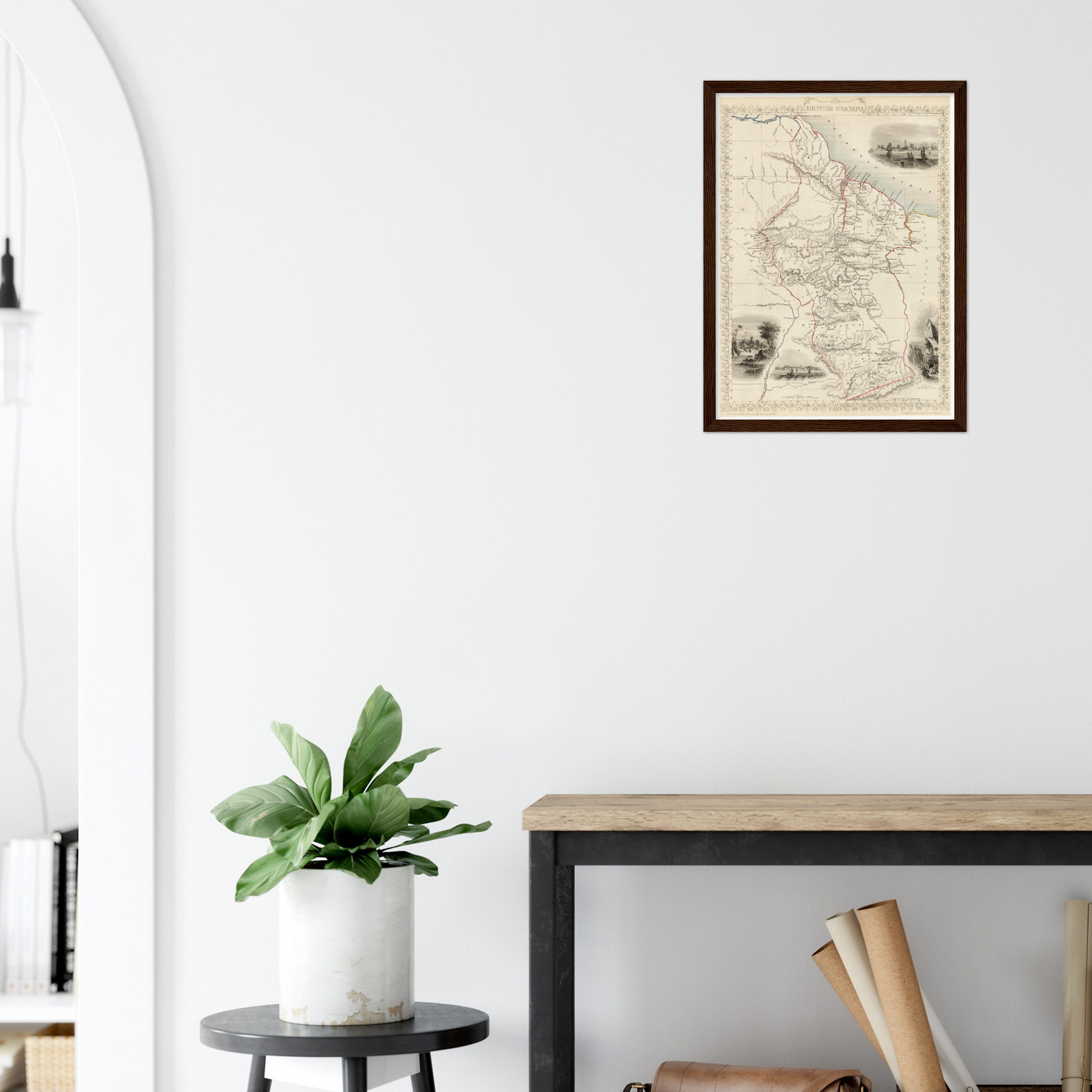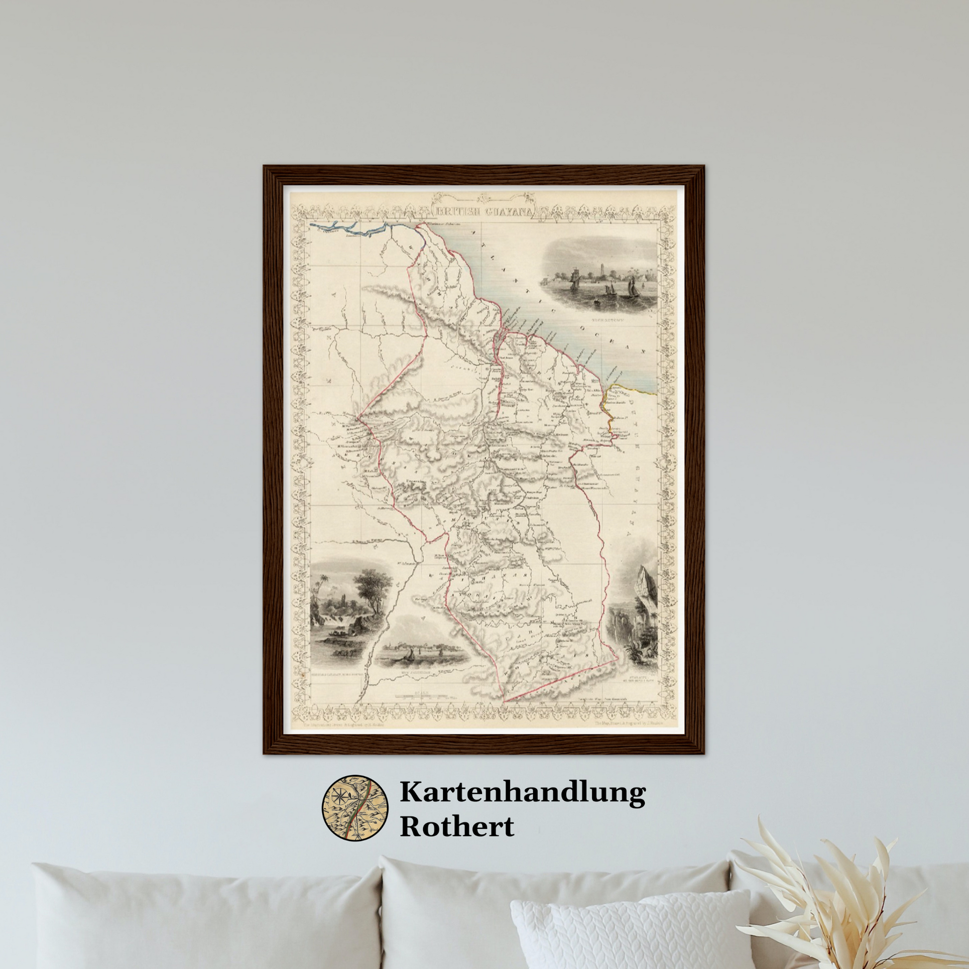 Stellen Sie sich vor, Sie könnten in eine Zeitmaschine steigen und in das Guyana des 19. Jahrhunderts reisen. Diese historische Landkarte von Guyana um 1850 bietet genau diese Möglichkeit auf eine faszinierende Art und Weise. Mit präzisen Linien und kunstvollen Gravuren fängt sie nicht nur die geografische Beschaffenheit der Region ein, sondern erzählt auch von der Entdeckung und Erkundung einer Welt, die damals voller Geheimnisse und unerforschter Gebiete war. Die feine künstlerische Arbeit und die Liebe zum Detail machen diese Karte zu einem ästhetischen Schmuckstück für jede Wand, die ein Gefühl von Abenteuer und Geschichte ausstrahlen soll.