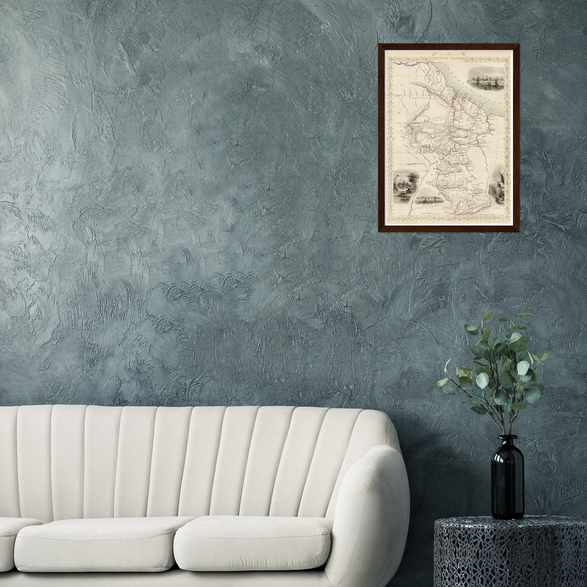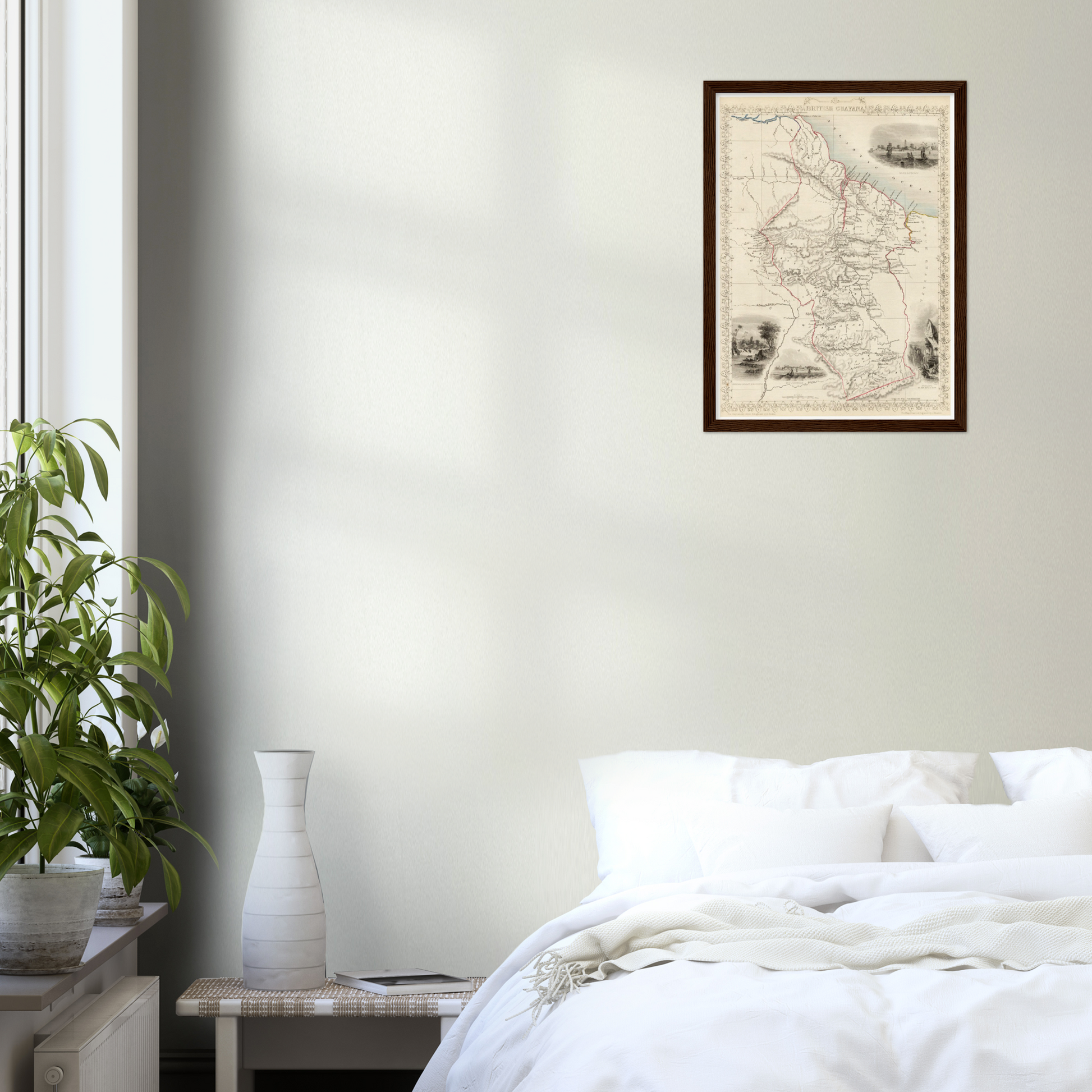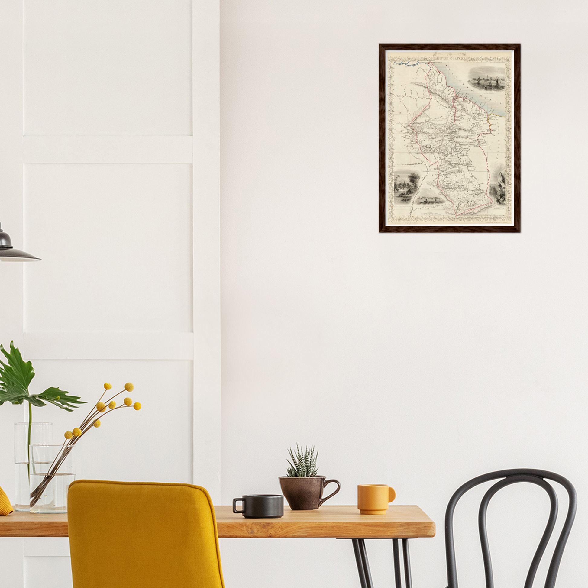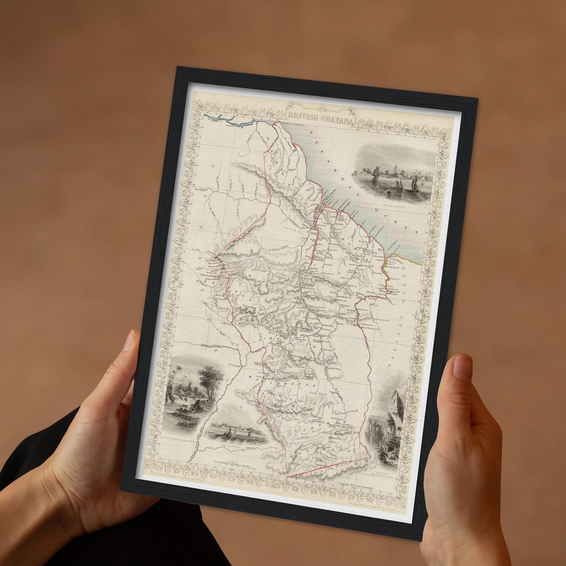 Stellen Sie sich vor, Sie könnten in eine Zeitmaschine steigen und in das Guyana des 19. Jahrhunderts reisen. Diese historische Landkarte von Guyana um 1850 bietet genau diese Möglichkeit auf eine faszinierende Art und Weise. Mit präzisen Linien und kunstvollen Gravuren fängt sie nicht nur die geografische Beschaffenheit der Region ein, sondern erzählt auch von der Entdeckung und Erkundung einer Welt, die damals voller Geheimnisse und unerforschter Gebiete war. Die feine künstlerische Arbeit und die Liebe zum Detail machen diese Karte zu einem ästhetischen Schmuckstück für jede Wand, die ein Gefühl von Abenteuer und Geschichte ausstrahlen soll.