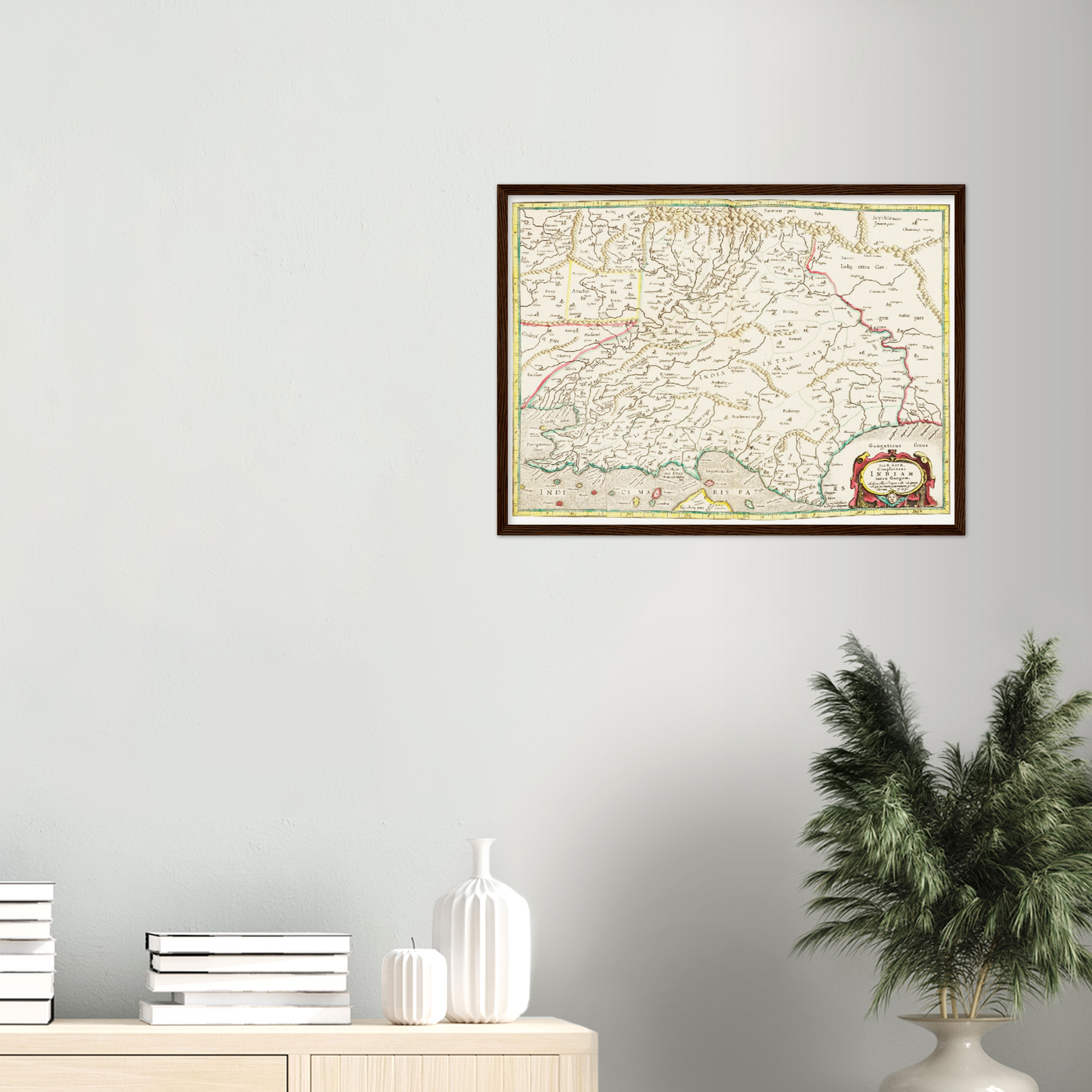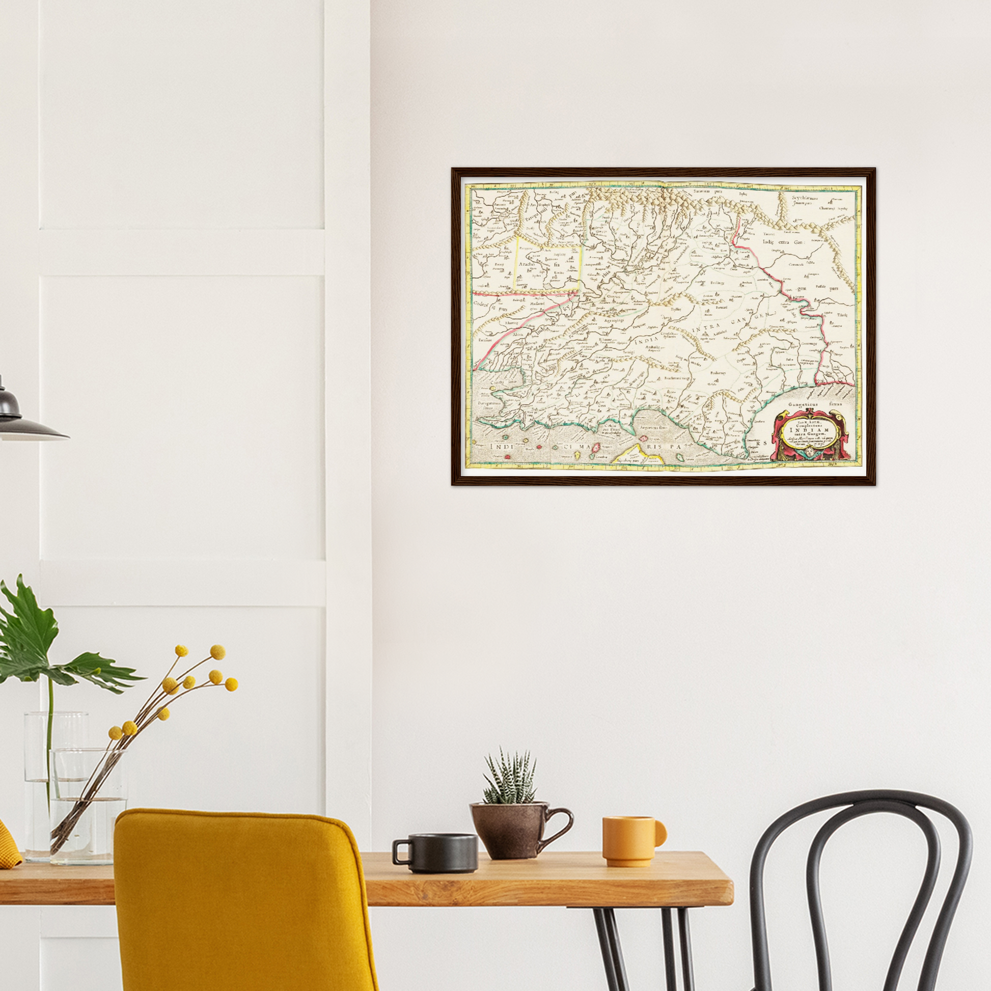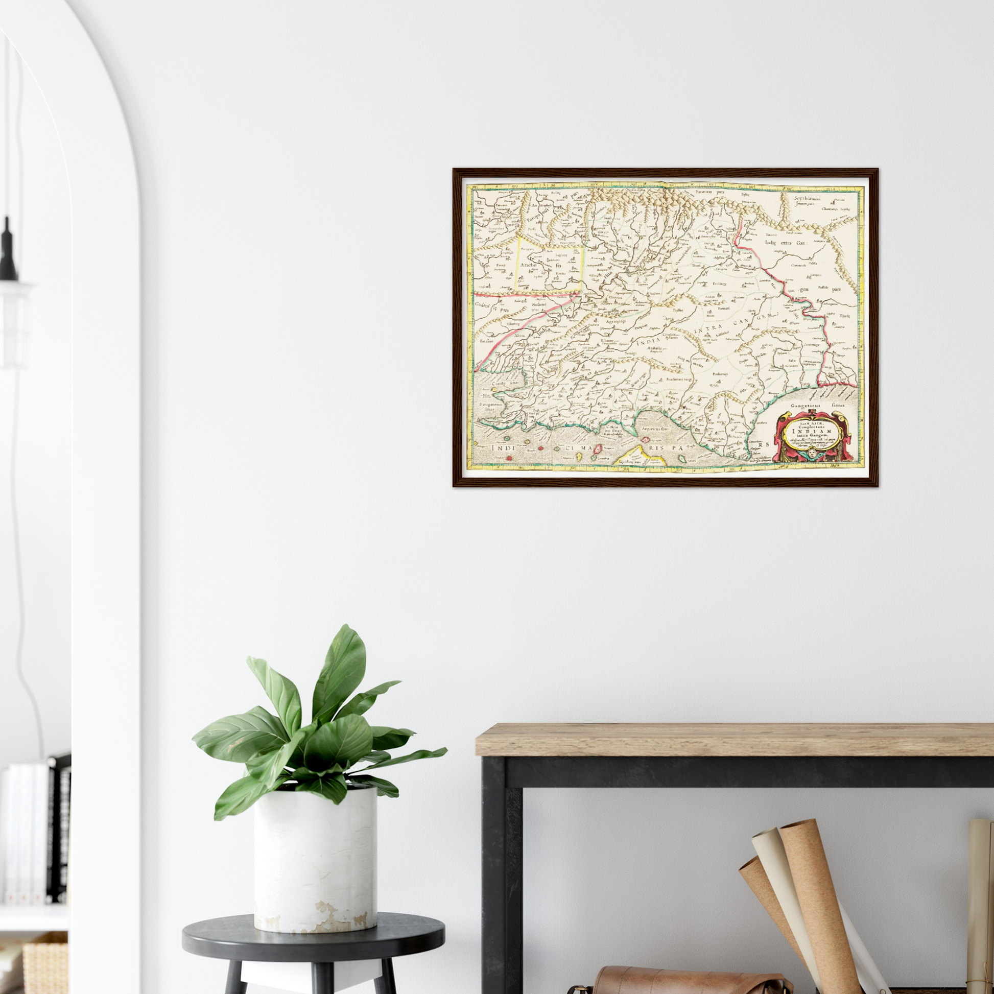 Unsere Nachdrucke entstehen in Archivqualität auf feinstem, mattem Papier (250 g/m²), das jedem Raum eine eindrucksvolle Note verleiht. Die hochauflösende Digitalisierung und farbgetreue Rekonstruktion garantieren, dass du ein Stück Geschichte in unvergleichlicher Schärfe und Brillanz erlebst. Jeder Druck wird auf Bestellung in Deutschland gefertigt und ist in 3 erlesenen Größen erhältlich: 40x30 - 60x45 cm. Zum Schutz wird jede Karte in einer stabilen Verpackung versandt. Optional kannst du zwischen natürlichen, dunkelbraunen oder schwarzen Holzrahmen sowie einem eleganten schwarzen Metallrahmen wählen, der mit bruchsicherem Plexiglas ausgestattet ist.