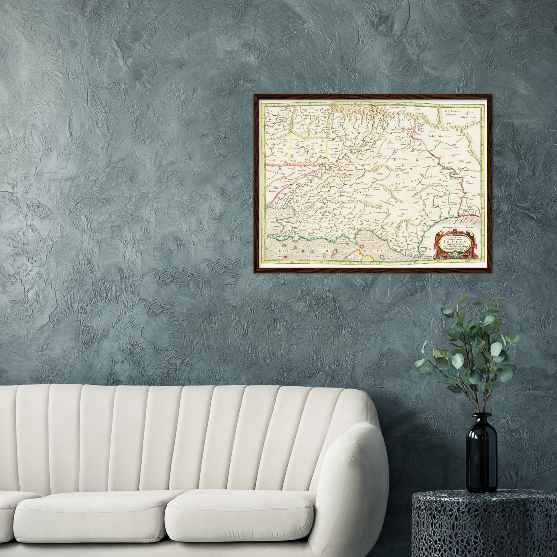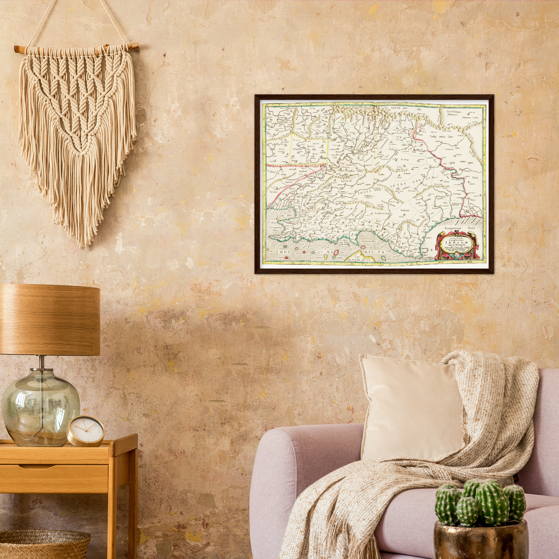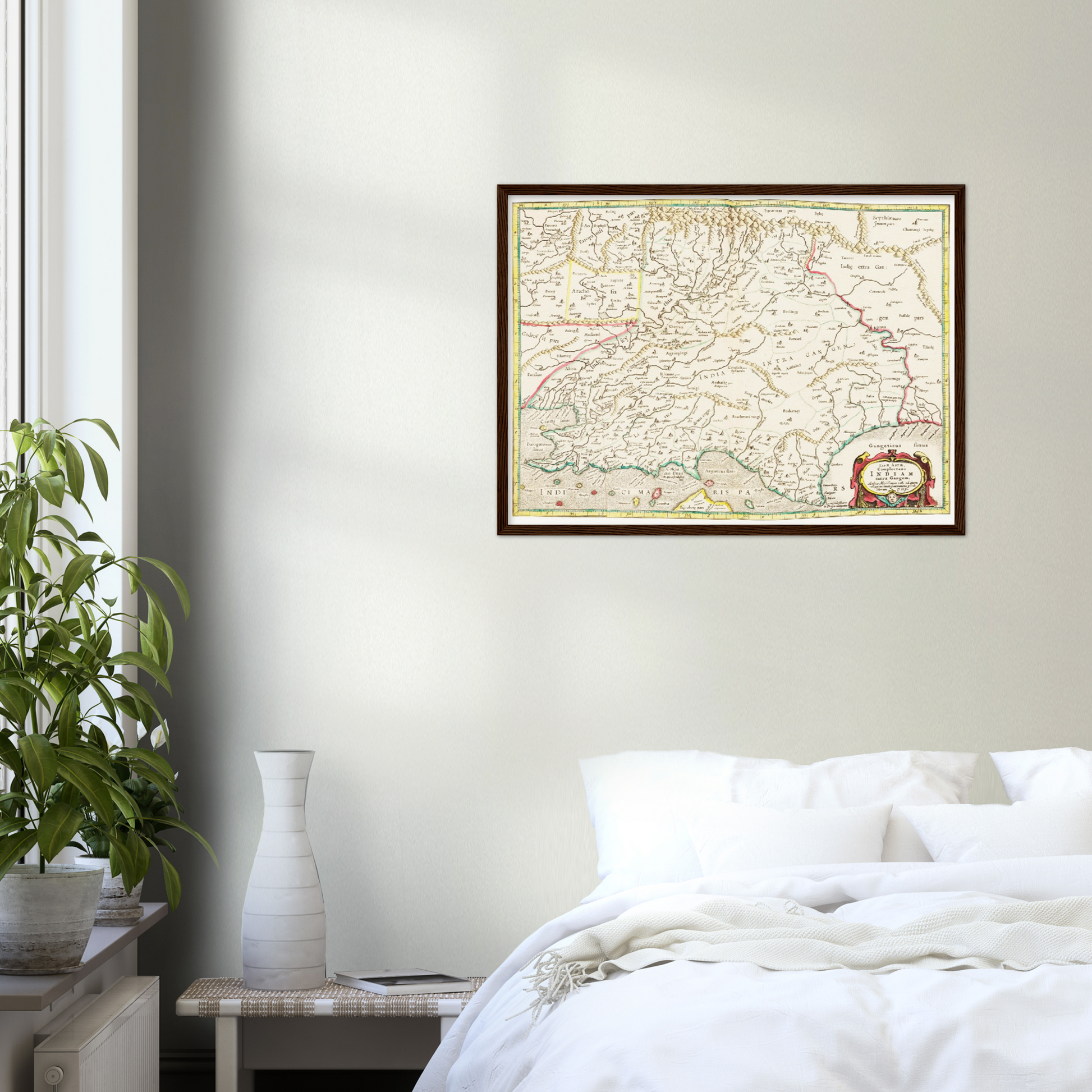Unsere Nachdrucke entstehen in Archivqualität auf feinstem, mattem Papier (250 g/m²), das jedem Raum eine eindrucksvolle Note verleiht. Die hochauflösende Digitalisierung und farbgetreue Rekonstruktion garantieren, dass du ein Stück Geschichte in unvergleichlicher Schärfe und Brillanz erlebst. Jeder Druck wird auf Bestellung in Deutschland gefertigt und ist in 3 erlesenen Größen erhältlich: 40x30 - 60x45 cm. Zum Schutz wird jede Karte in einer stabilen Verpackung versandt. Optional kannst du zwischen natürlichen, dunkelbraunen oder schwarzen Holzrahmen sowie einem eleganten schwarzen Metallrahmen wählen, der mit bruchsicherem Plexiglas ausgestattet ist.