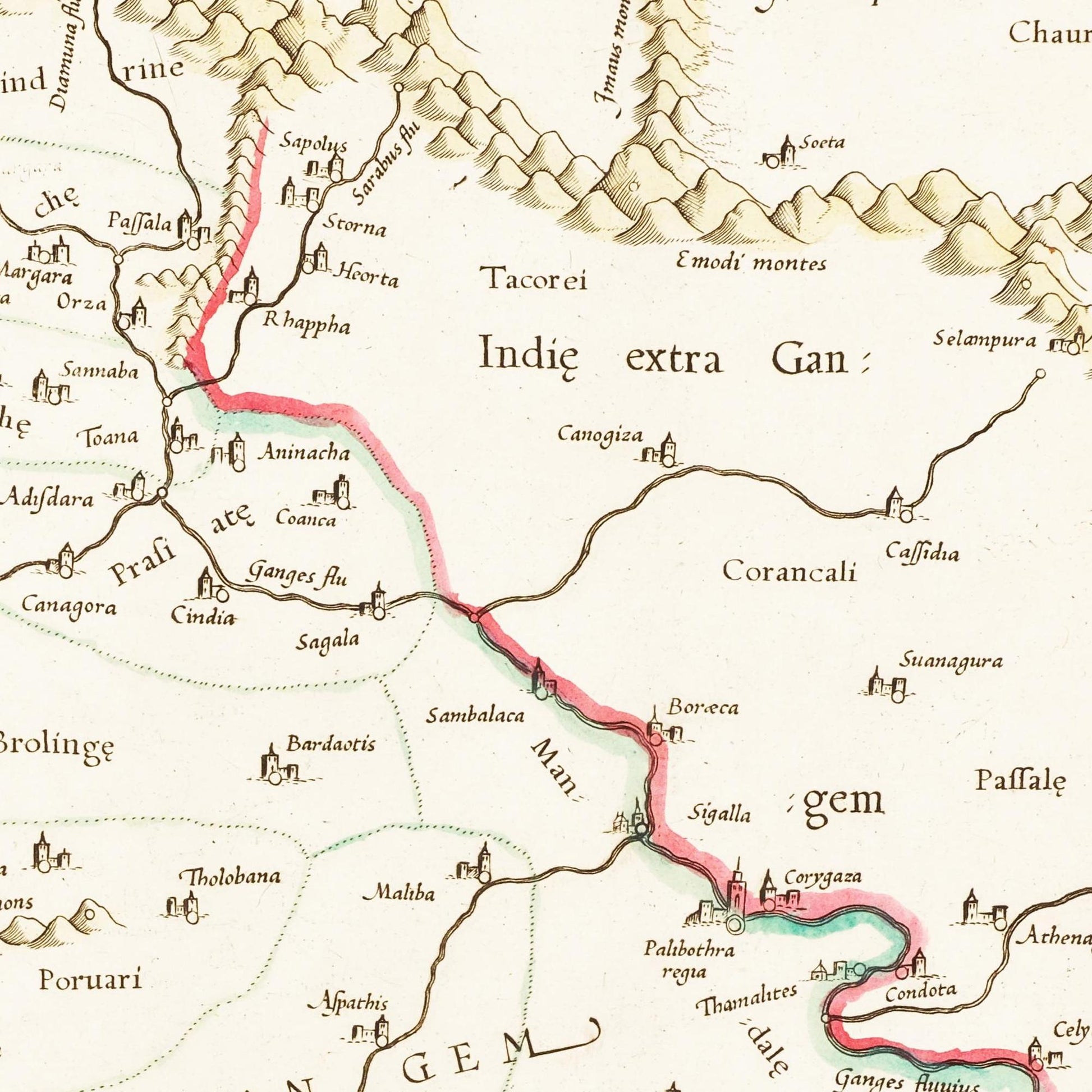 Im Jahr 1704 befand sich die Welt in einer Phase intensiver geographischer Erkundungen und kultureller Veränderungen. Indien, dargestellt in dieser Karte, war ein Land von immenser Bedeutung – ein wahrer Schmelztiegel von Kulturen, Gesetzen und Handelsrouten. Der Kartograph, dessen Name eng mit der akribischen Kunst der Kartographie verknüpft ist, nutzte Techniken, die für das frühe 18. Jahrhundert bahnbrechend waren. Besondere Merkmale dieser historischen Darstellung sind die feinen Linien und präzisen Symbole, die nicht nur topografische, sondern auch kulturelle und geopolitische Informationen transportieren. Diese Karte ist nicht nur ein geografisches Abbild, sondern ein kulturhistorisches Dokument, das die damalige Sichtweise auf die Welt und die Rolle Indiens darin widerspiegelt.