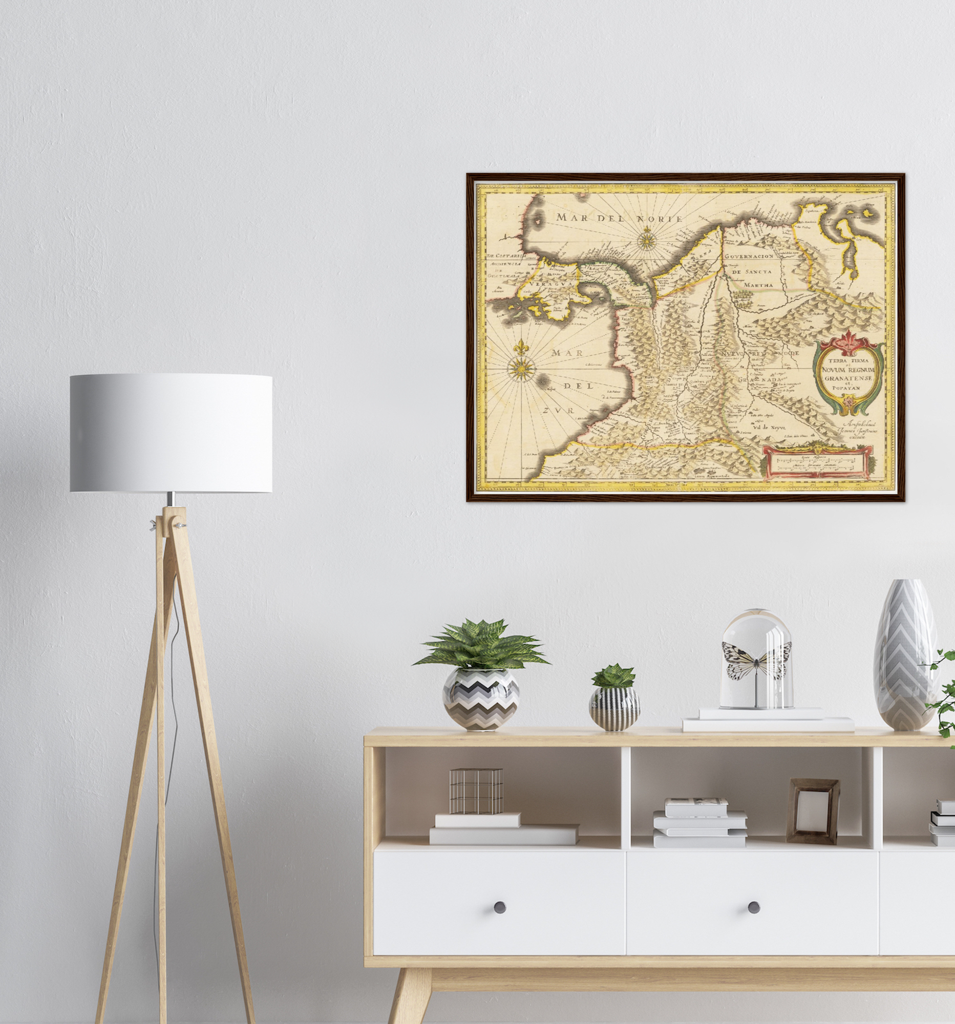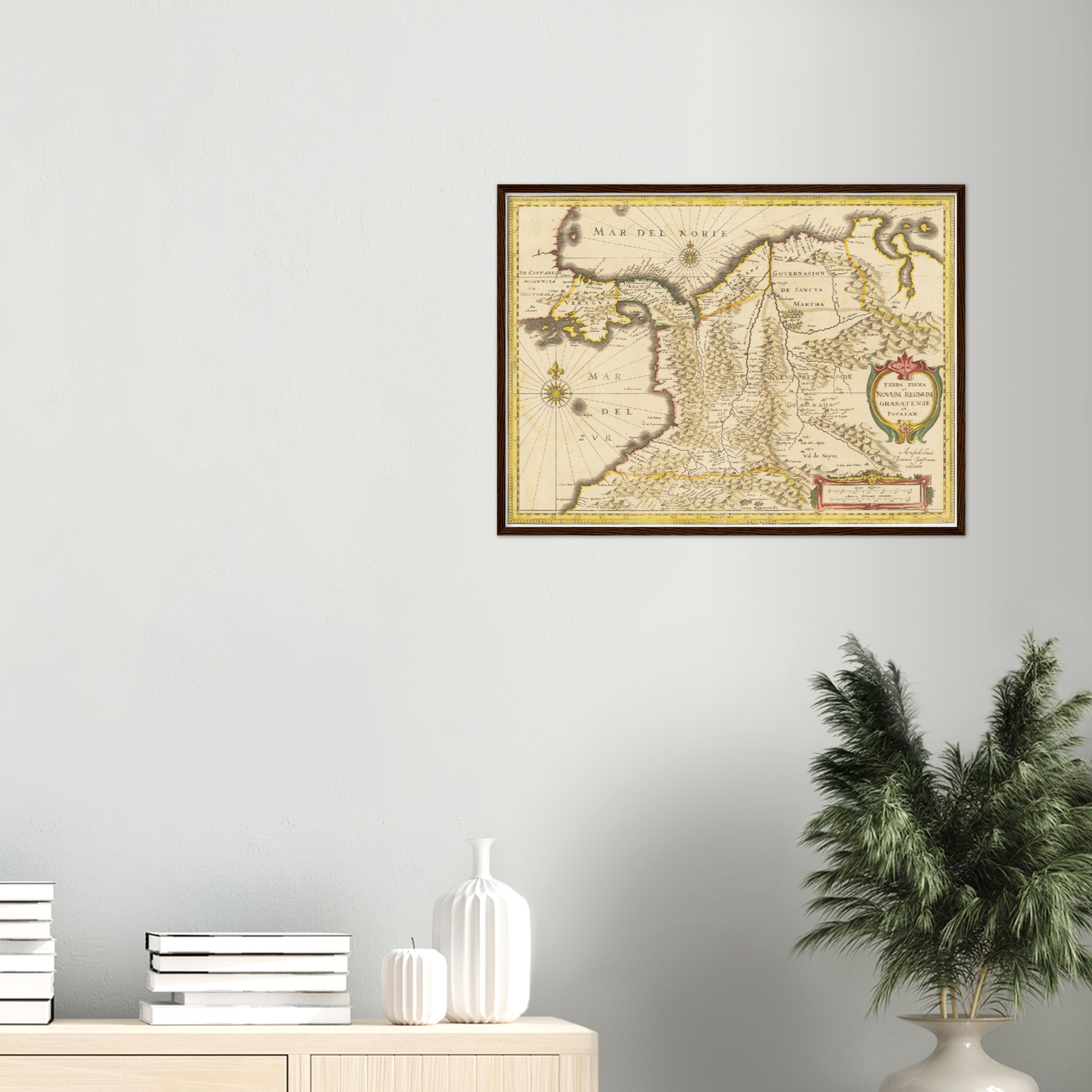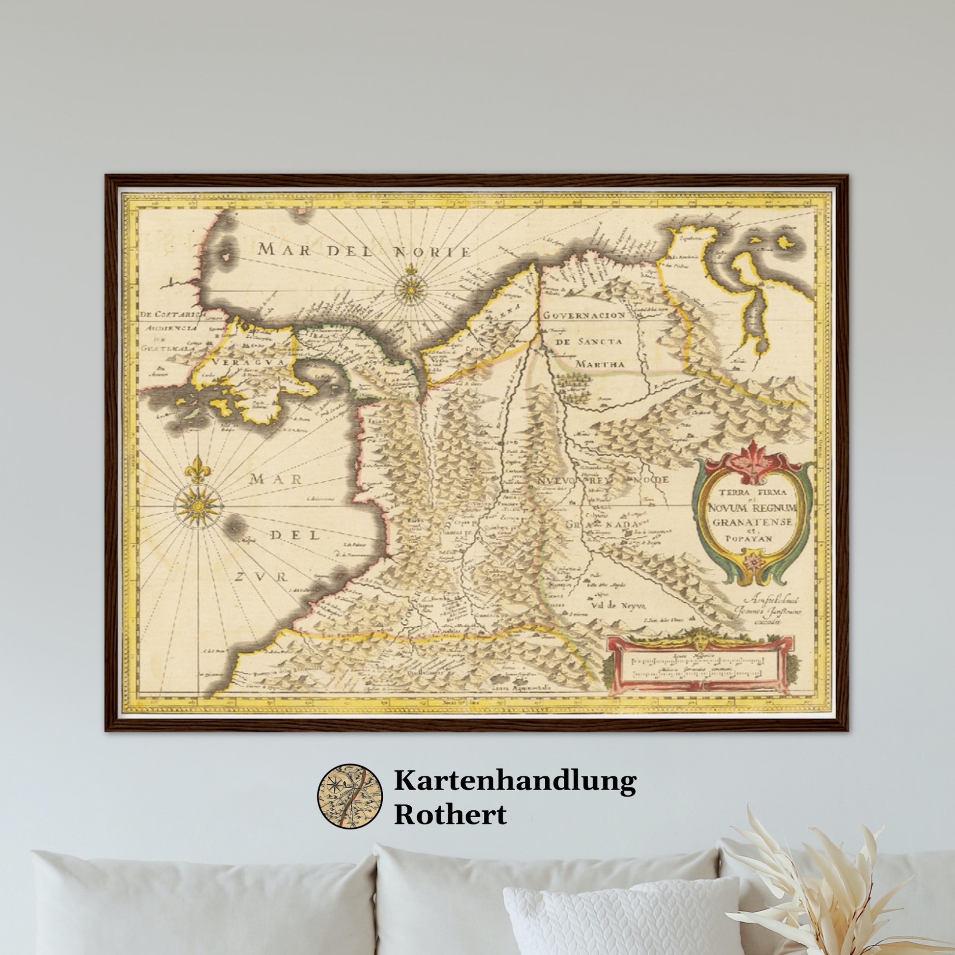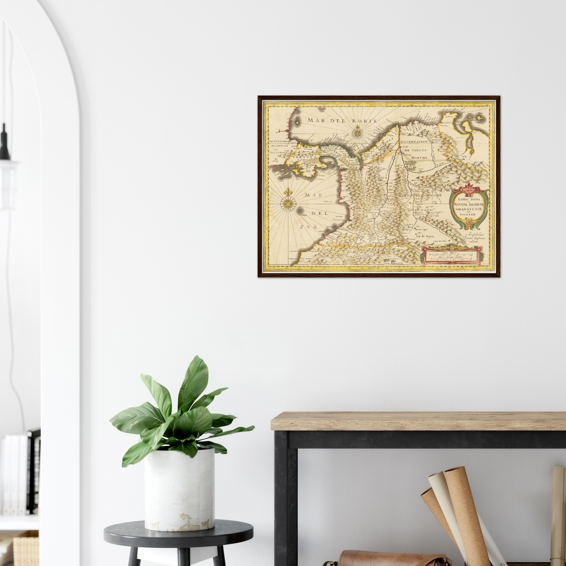 Erleben Sie die faszinierende Geschichte Kolumbiens durch eine historische Landkarte aus dem Jahr 1638, die Ihren Räumen einen Hauch von vergangener Eleganz verleiht.