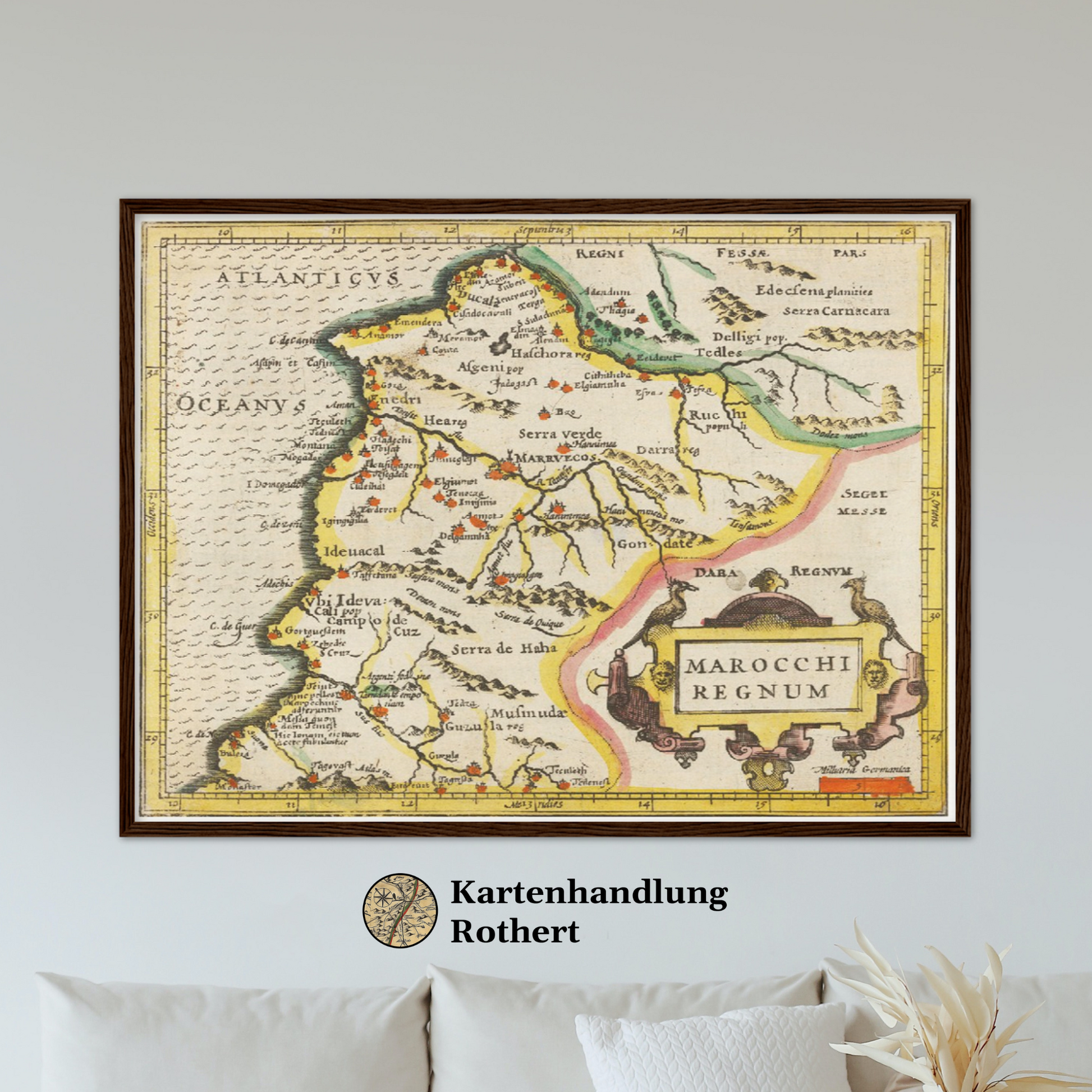 In einer Zeit, in der Karten nicht nur der Orientierung, sondern auch der Repräsentation von Macht und Wissen dienten, erhebt sich diese eindrucksvolle Karte von Marrakesch um 1609 zu einem wahren Meisterwerk. Die feinen Linienführungen und detaillierten Gravuren dieser Karte ziehen einen direkt in die Geheimnisse einer längst vergangenen Epoche. Marrakesch, als ein blühendes Zentrum der Kultur und des Handels, war ein Schmelztiegel der Zivilisation, und diese Karte fängt die Essenz dieser Zeit eindrucksvoll ein. Die altmeisterlichen Techniken und der präzise Druck auf hochwertigem, dickem, mattem Papier machen diesen Nachdruck zu einem geschätzten Kunstwerk für jeden Kenner klassischer Kartografie.