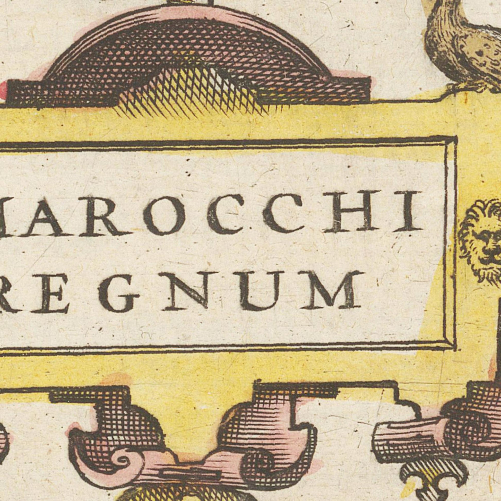 Im Jahr 1609 war Marrakesch, die Perle des Orients, ein bedeutender Knotenpunkt zwischen Atlantik und Wüste. Die Karte, die in dieser Zeit entstand, ist ein Zeugnis der präzisen Arbeit eines unbekannten, aber zweifellos herausragenden Kartografen jener Epoche. Mit einer feinen Kombination aus Kunst und Wissenschaft erschuf er eine Darstellung, die nicht nur geografische Genauigkeit, sondern auch die kulturelle Vielfalt der Region widerspiegelt. Die sorgfältig eingezeichneten Handelswege und die symbolisch dargestellten Gebäude stellen eine wertvolle Quelle für Historiker und Kunstliebhaber dar. Diese Karte ist nicht nur ein herausragendes Beispiel der damaligen Kartografie, sondern auch ein kultureller Schatz, der über die Jahrhunderte hinweg seine Bedeutung bewahrt hat und heute eine Brücke zur Vergangenheit schlägt.
