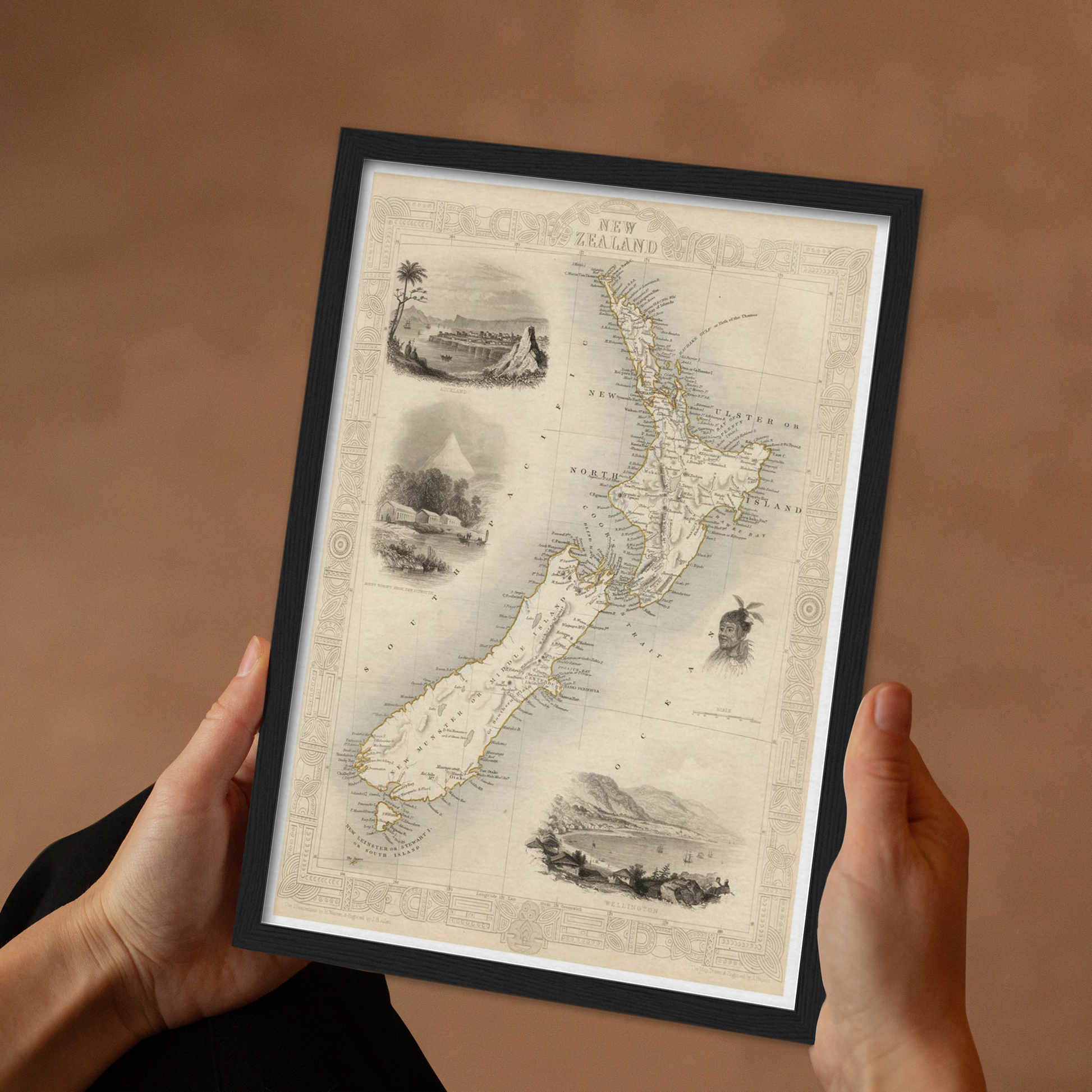Tauchen Sie ein in die Geschichte, als Neuseeland noch ein Geheimnis am Ende der Welt war, und lassen Sie sich von dieser exquisiten Landkarte der Region im Jahre 1850 verzaubern. Diese Karte, ein Fenster in die Vergangenheit, fängt die rohe Schönheit und den Entdeckergeist jener Tage ein. Mit feinen Linien und detailreichen Gravuren ist sie nicht nur ein Zeugnis der frühen Kartographie, sondern auch ein Meisterwerk der Kunst. Das Spiel der Konturen und die Anmut der Darstellung laden dazu ein, sich auf eine gedankliche Reise zu begeben, während man das geheimnisvolle und unberührte Land ergründet. Mit dieser Karte bringen Sie ein Stück Geschichte in Ihr Zuhause – ein Element, das sowohl Neugierde als auch Staunen hervorruft.