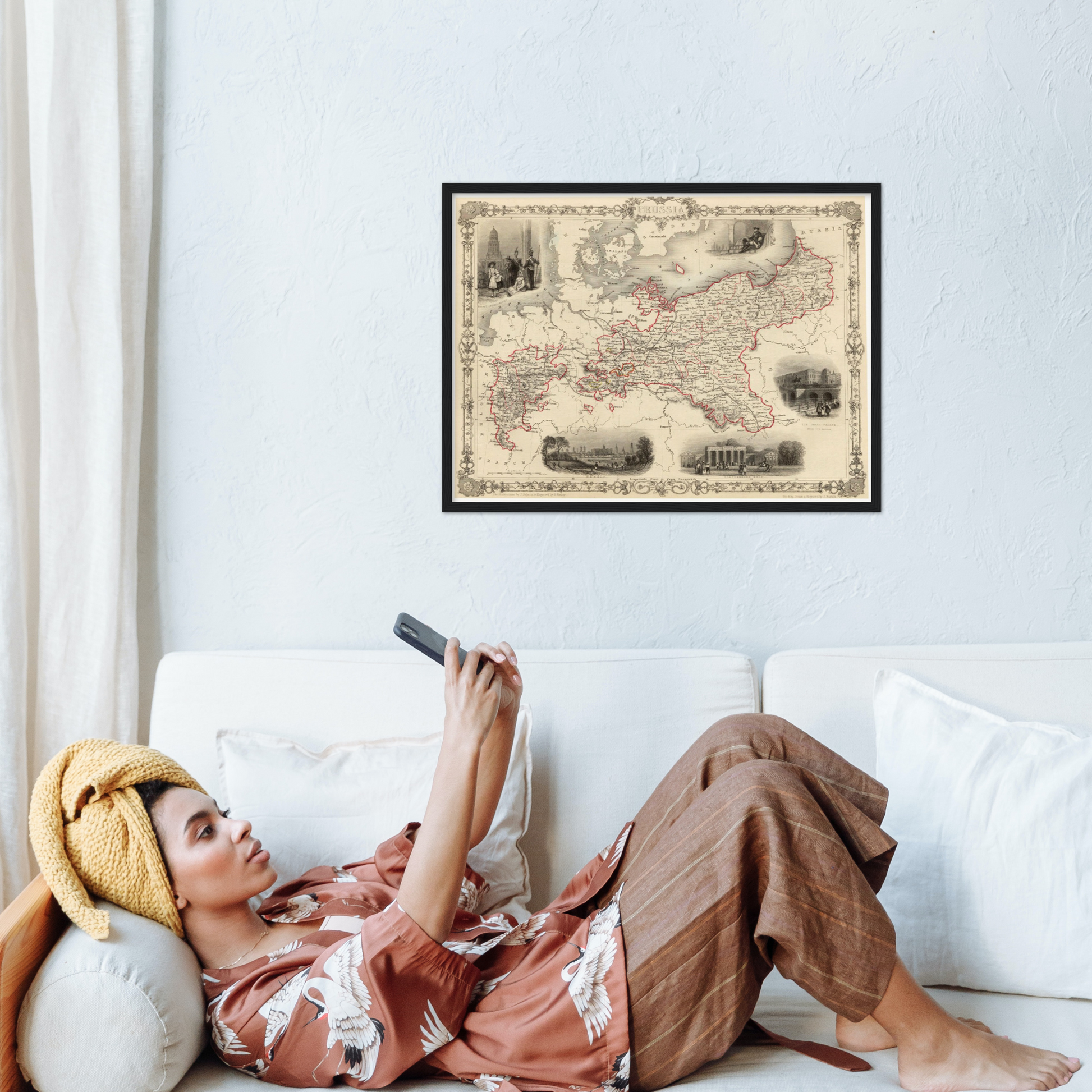 Unsere Nachdrucke entstehen in Archivqualität auf feinstem, mattem Papier (250 g/m²), das jedem Raum eine eindrucksvolle Note verleiht. Die hochauflösende Digitalisierung und farbgetreue Rekonstruktion garantieren, dass du ein Stück Geschichte in unvergleichlicher Schärfe und Brillanz erlebst. Jeder Druck wird auf Bestellung in Deutschland gefertigt und ist in 3 erlesenen Größen erhältlich: 40x30 - 60x45 cm. Zum Schutz wird jede Karte in einer stabilen Verpackung versandt. Optional kannst du zwischen natürlichen, dunkelbraunen oder schwarzen Holzrahmen sowie einem eleganten schwarzen Metallrahmen wählen, der mit bruchsicherem Plexiglas ausgestattet ist.