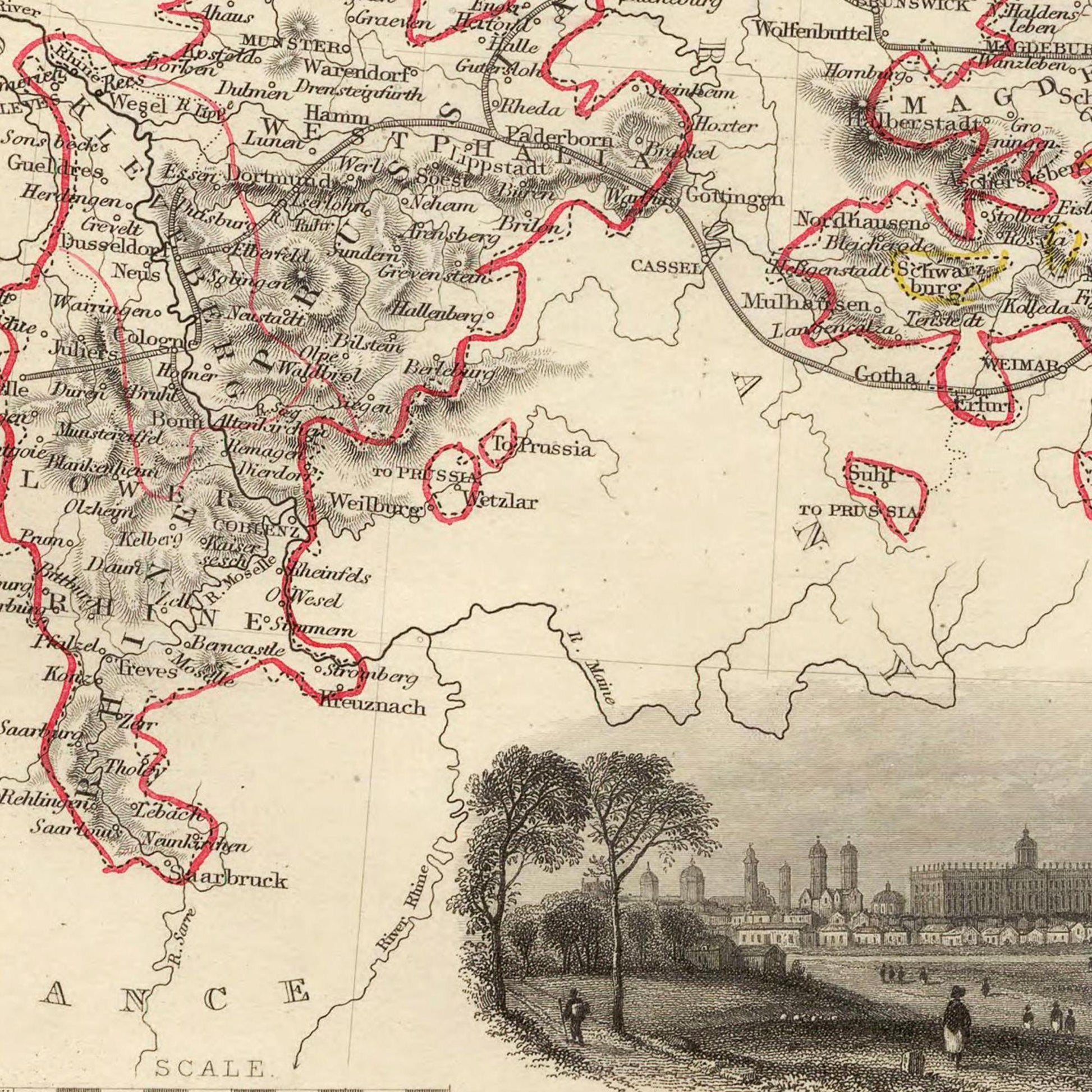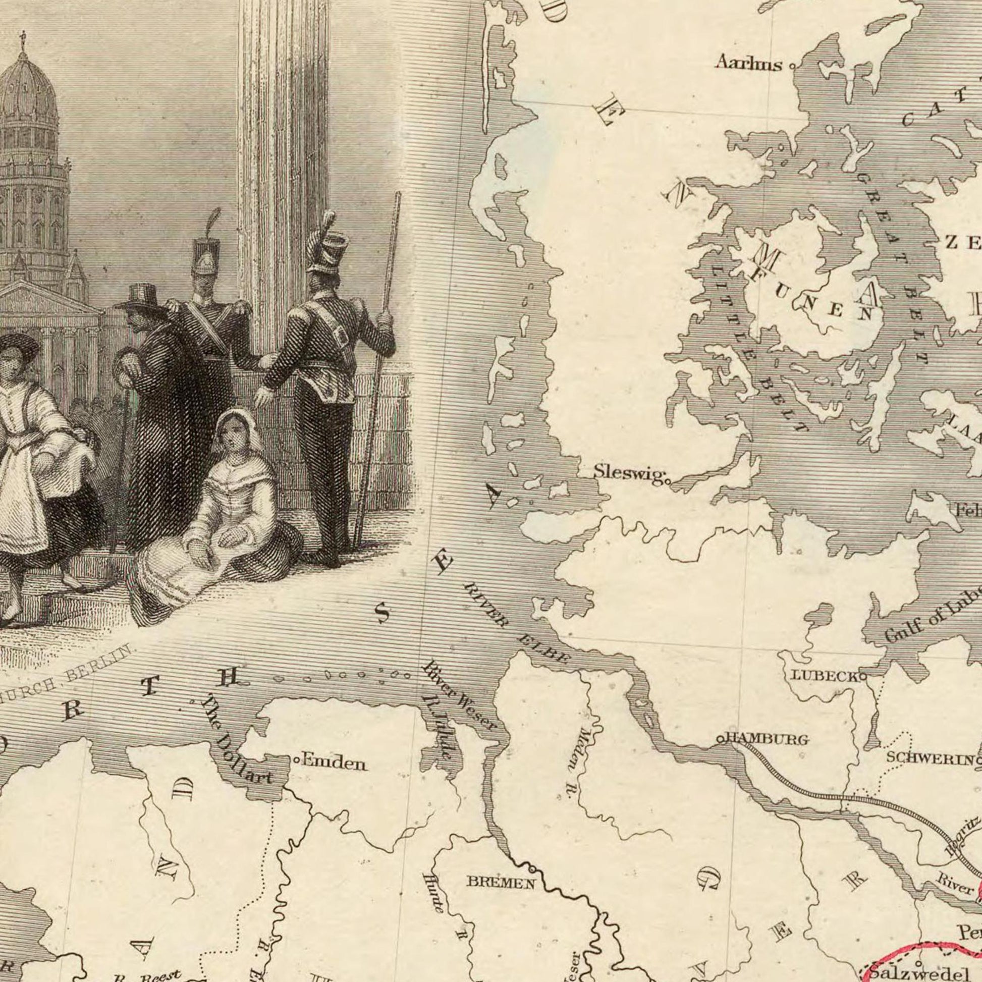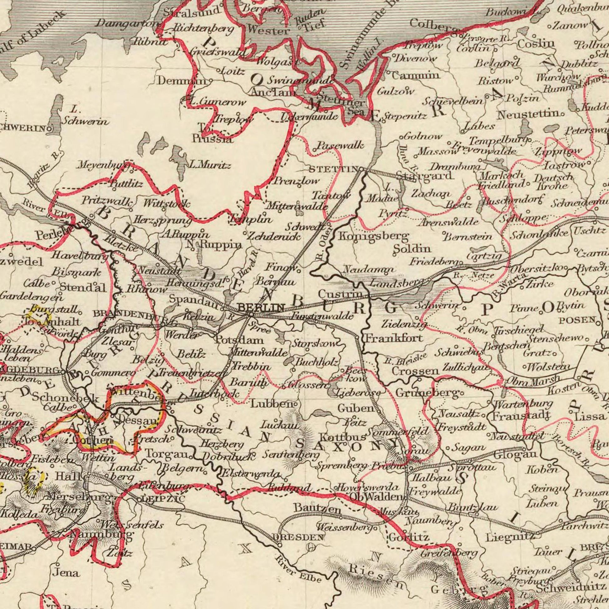 Das Jahr 1850 markiert eine Zeit des Wandels und Wachstums in Preußen, als die Region unter der Führung von Friedrich Wilhelm IV. eine bedeutende Rolle in der politischen Landschaft Europas spielte. Diese Karte, sorgfältig und mit großem Können von einem unbekannten Kartographen erstellt, zeigt die vielfältigen Landesstrukturen und politischen Einheiten in einer bemerkenswerten Detailtreue. In dieser Epoche der Industrialisierung und des wiedererwachten Nationalbewusstseins ist die Karte sowohl ein Dokument als auch eine kunstvolle Darstellung der preußischen Welt. Die zahlreichen dargestellten Städte und Grenzen haben nicht nur geografische, sondern auch kulturelle Bedeutung, die bis heute nachwirkt und die Karte zu einem wertvollen kulturellen Artefakt macht.