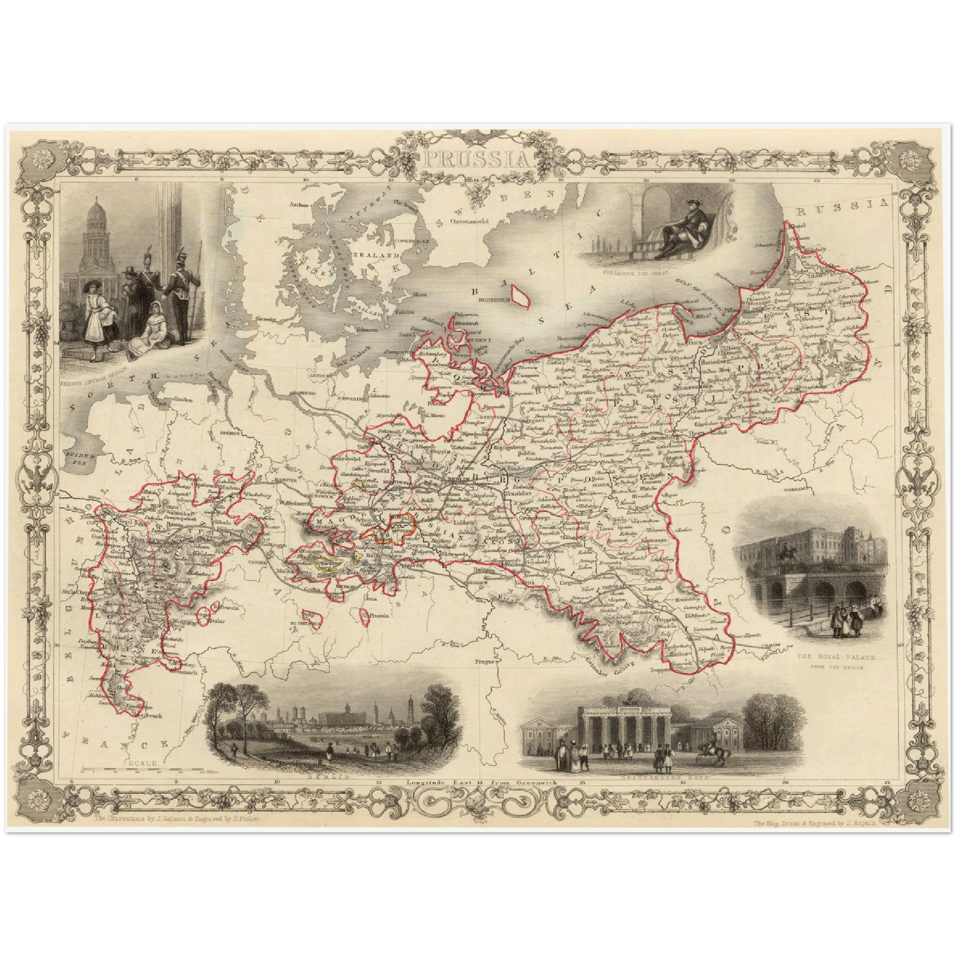 Gönnen Sie sich eine Reise in die Vergangenheit mit dieser faszinierenden Karte von Preußen um 1850. Diese historische Landkarte ist nicht nur ein Spiegelbild alter geografischer Gegebenheiten, sondern auch ein Kunstwerk voller Geschichte und Bedeutungen. Denken Sie an die Zeiten des aufstrebenden Preußens, das sich in einer dynamischen Phase politischer, kultureller und wirtschaftlicher Entwicklung befand. Die Karte zieht den Betrachter in ihren Bann mit ihren präzisen Linien, der kunstvollen Gravur sowie ihrem zeitlosen Stil und wird so zu einem Gesprächsstück in jedem Raum.