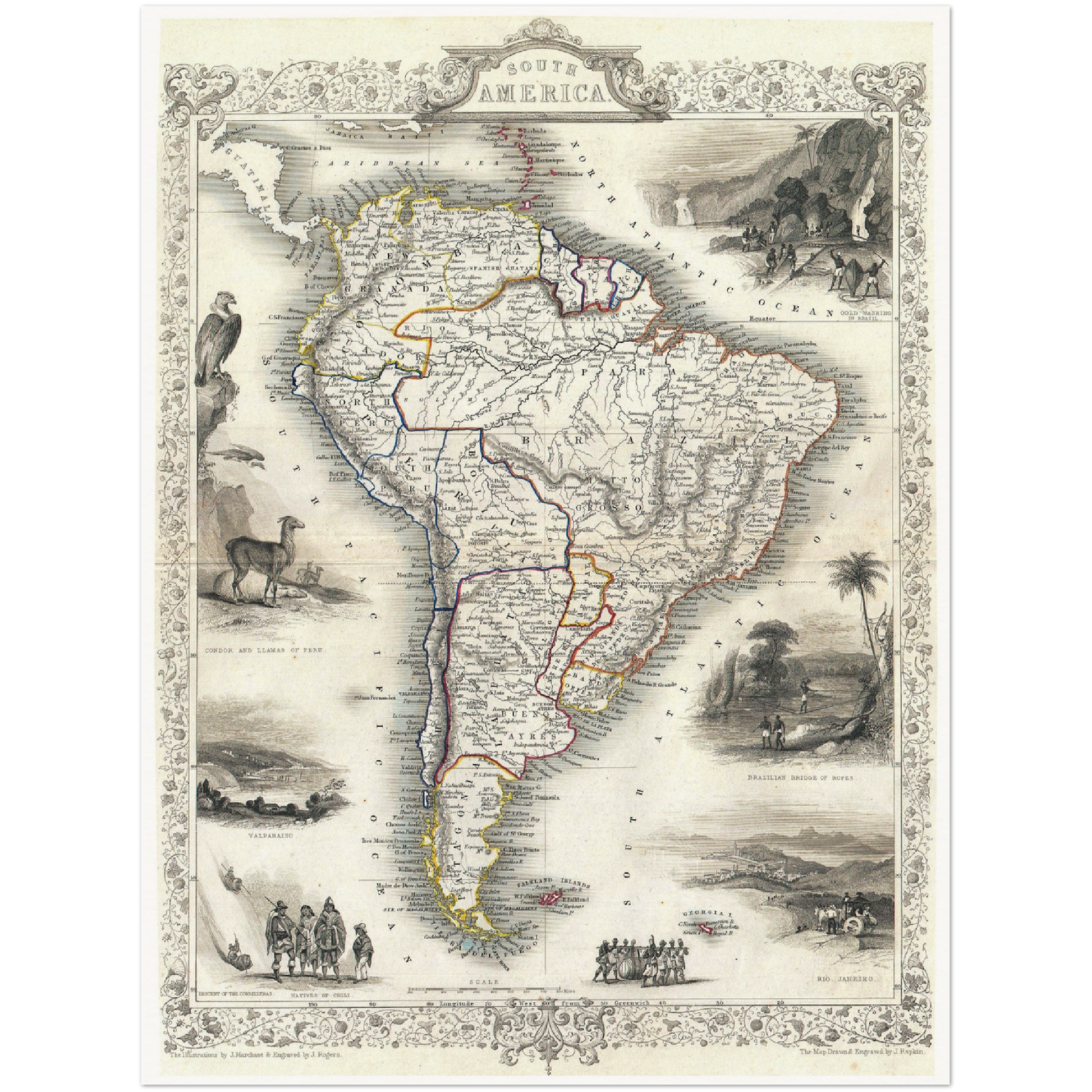 Die Landkarte von Südamerika aus dem Jahr 1850 gewährt einen bemerkenswerten Einblick in eine Zeit des Umbruchs und der Entdeckung. Während dieser Periode rückten die politischen und kulturellen Landschaften Südamerikas ins Zentrum weltweiten Interesses. Der bekannte Kartograph, dessen Werk in dieser Karte zum Ausdruck kommt, verstand es meisterhaft, die geografischen und kulturellen Details der Region zu verewigen. Diese Karte ist nicht nur eine geografische Darstellung, sondern ein kulturelles Dokument. Sie verdeutlicht, wie Südamerika in der Mitte des 19. Jahrhunderts wahrgenommen wurde und ist heute über ihren historischen Wert hinaus ein geschätzter Kulturschatz. Jedes Detail der Karte, von den Gebirgen bis zu den Grenzen, erzählt die Geschichte einer Region in Transformation.