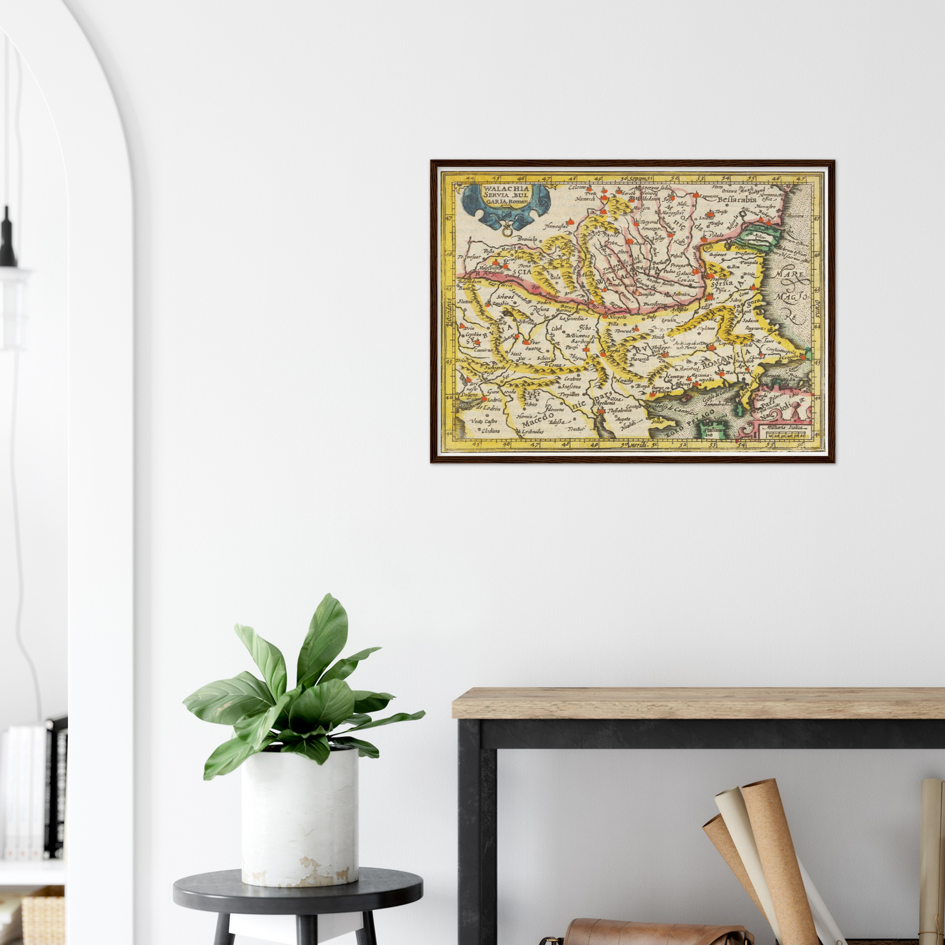 In den sanften Strichen dieser Landkarte spiegelt sich eine längst vergangene Epoche wider, in der die Wallachei mit all ihren Tälern und Höhenzügen auf dem Papier zum Leben erweckt wird. Diese Karte ist nicht nur ein Zeugnis der geografischen Erfassung, sondern auch ein Kunstwerk, das dank feiner Linienführung und bemerkenswerter Gravurkunst eine eindrucksvolle Atmosphäre der Zeit um 1609 erzeugt. Beim Betrachten fühlen Sie sich zurückversetzt in eine Welt voller Heldensagen und historischen Umbrüchen. Ob als dekoratives Highlight im Wohnzimmer oder als inspirierendes Statement im Büro – diese Landkarte entfaltet überall ihre bezaubernde Wirkung.