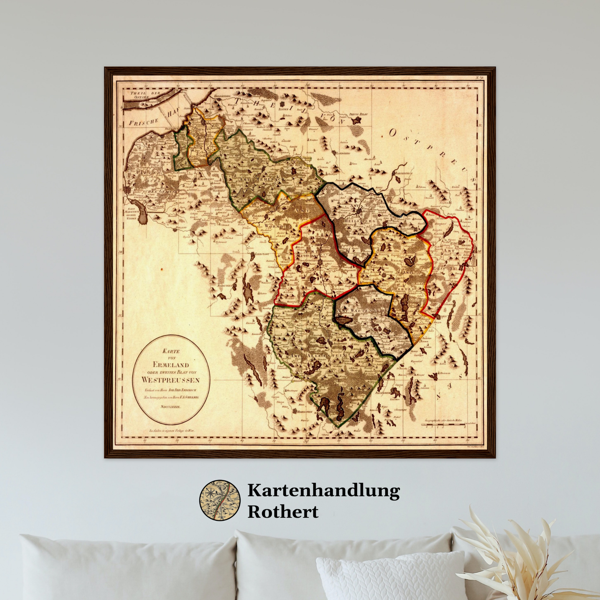 Diese Landkarte der Region Ermland um 1789 offenbart die historische Landschaft des späten 18. Jahrhunderts – detailverliebt, kunstvoll gezeichnet und von zeitloser Eleganz.
