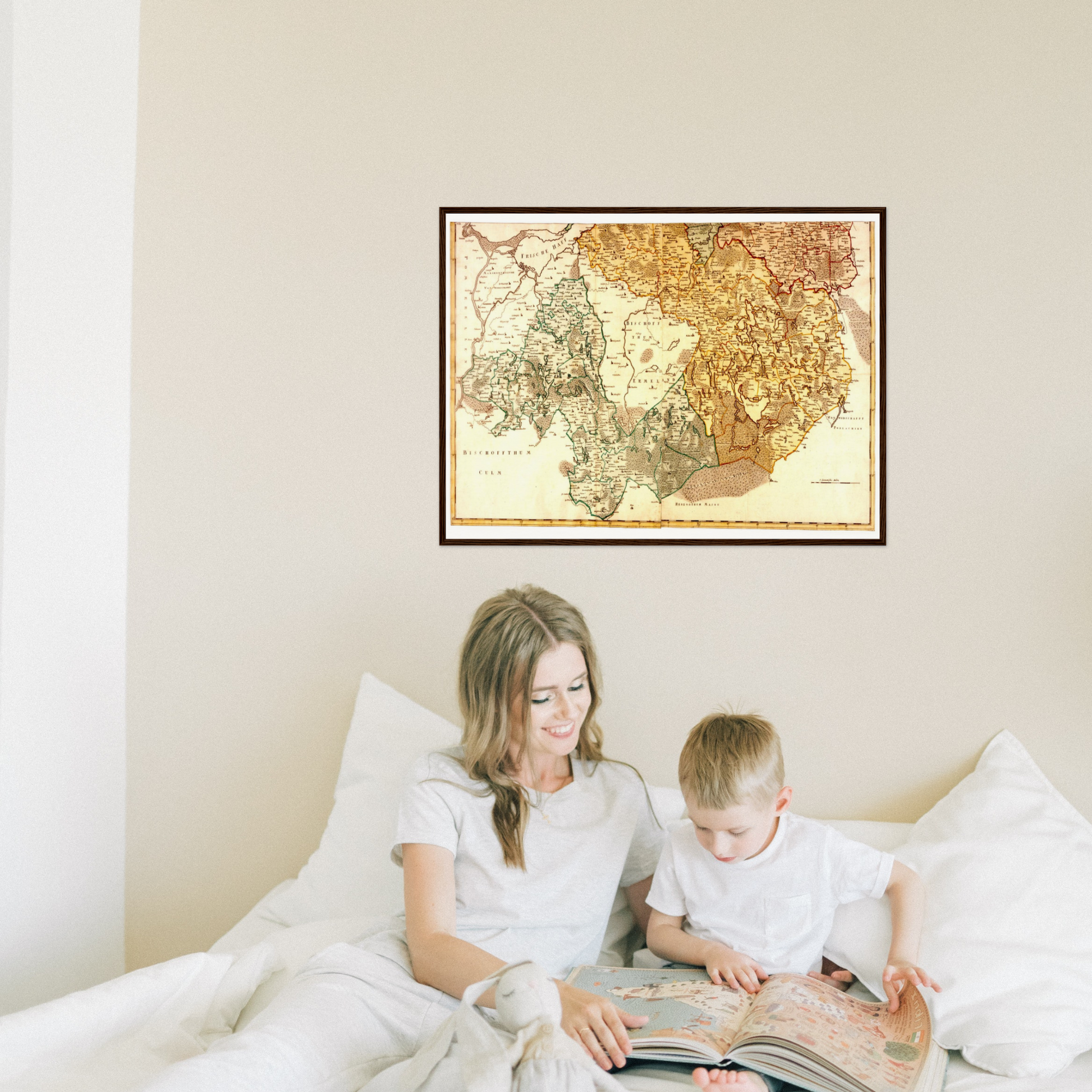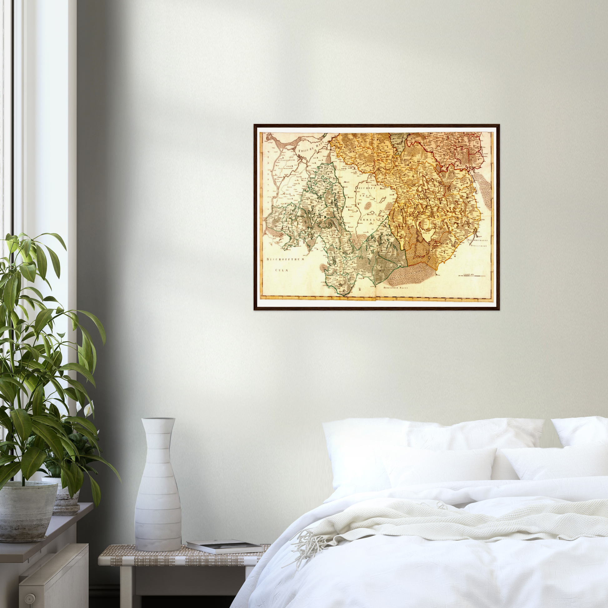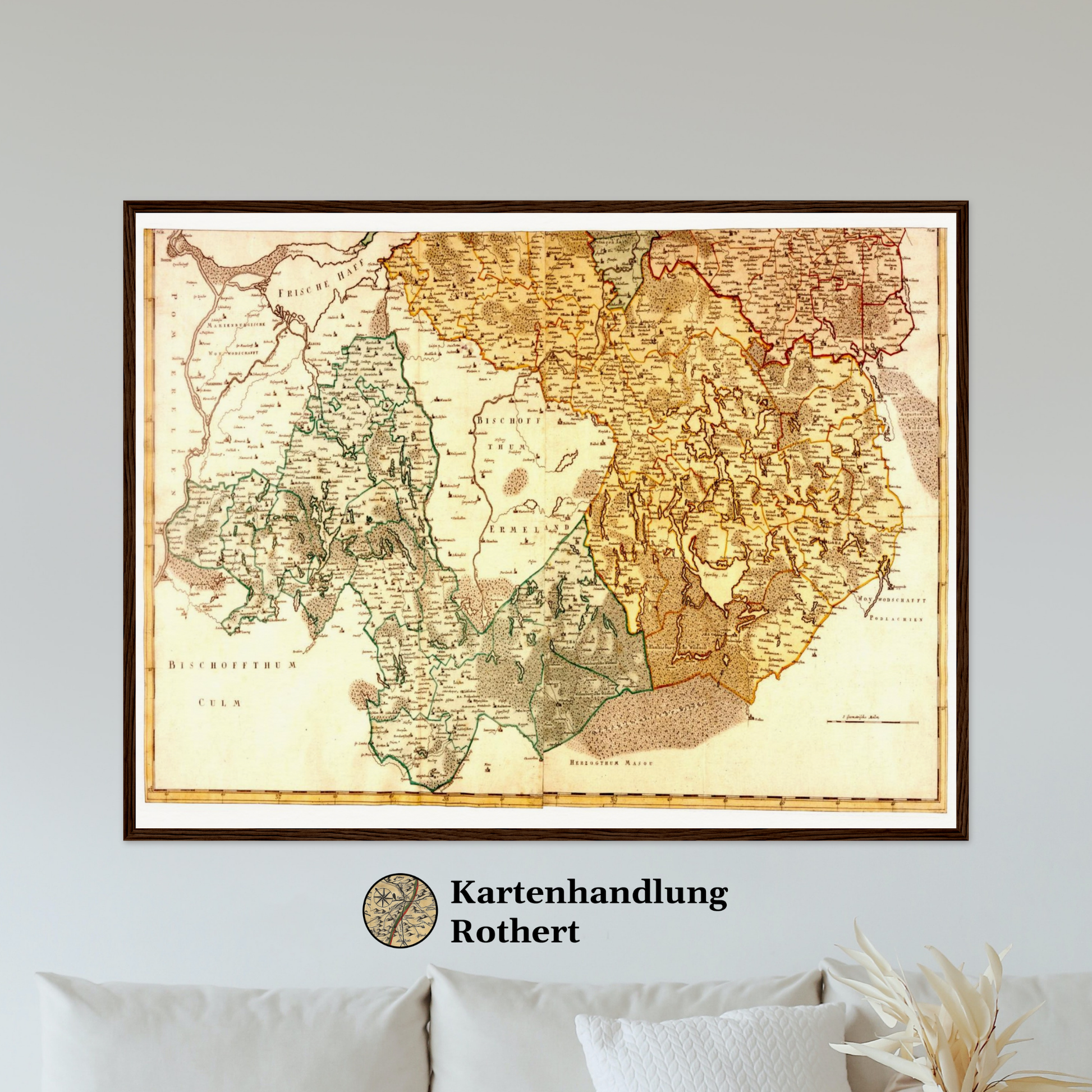 Unsere Nachdrucke entstehen in Archivqualität auf feinstem, mattem Papier (250 g/m²), das jedem Raum eine eindrucksvolle Note verleiht. Die hochauflösende Digitalisierung und farbgetreue Rekonstruktion garantieren, dass du ein Stück Geschichte in unvergleichlicher Schärfe und Brillanz erlebst. Jeder Druck wird auf Bestellung in Deutschland gefertigt und ist in 3 erlesenen Größen erhältlich: . Zum Schutz wird jede Karte in einer stabilen Verpackung versandt. Optional kannst du zwischen natürlichen, dunkelbraunen oder schwarzen Holzrahmen sowie einem eleganten schwarzen Metallrahmen wählen, der mit bruchsicherem Plexiglas ausgestattet ist.