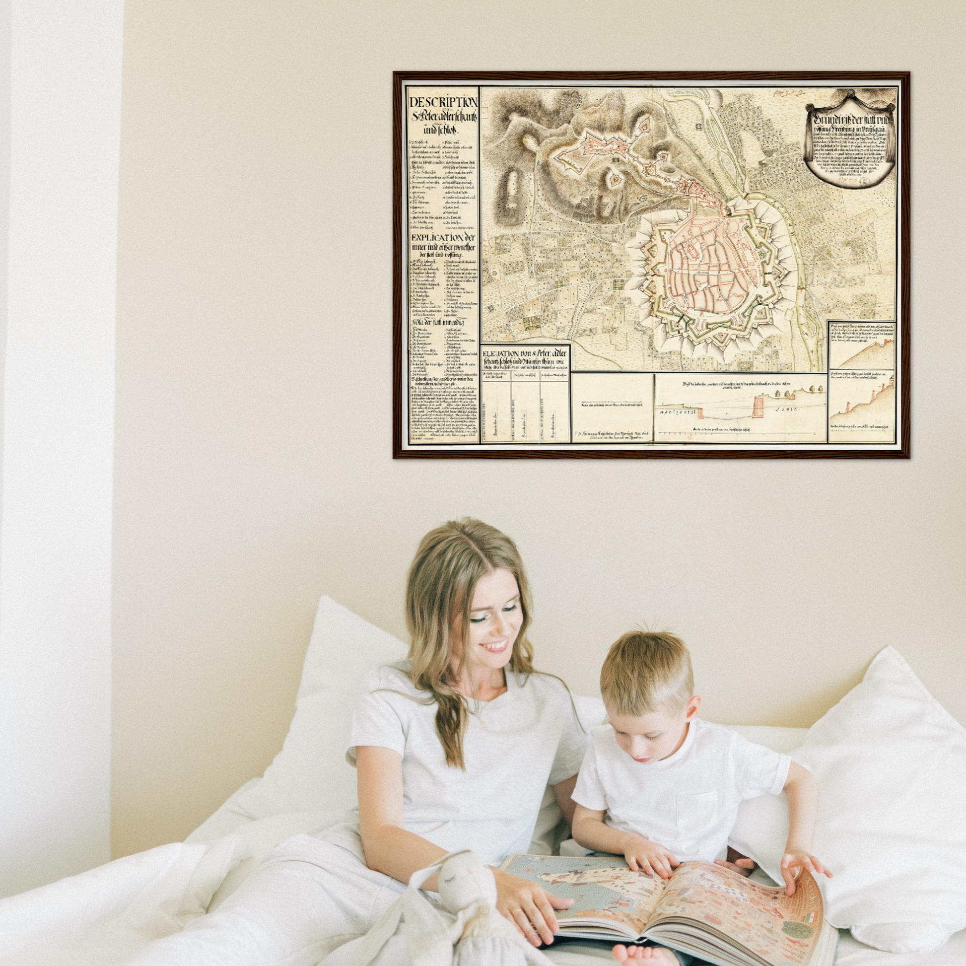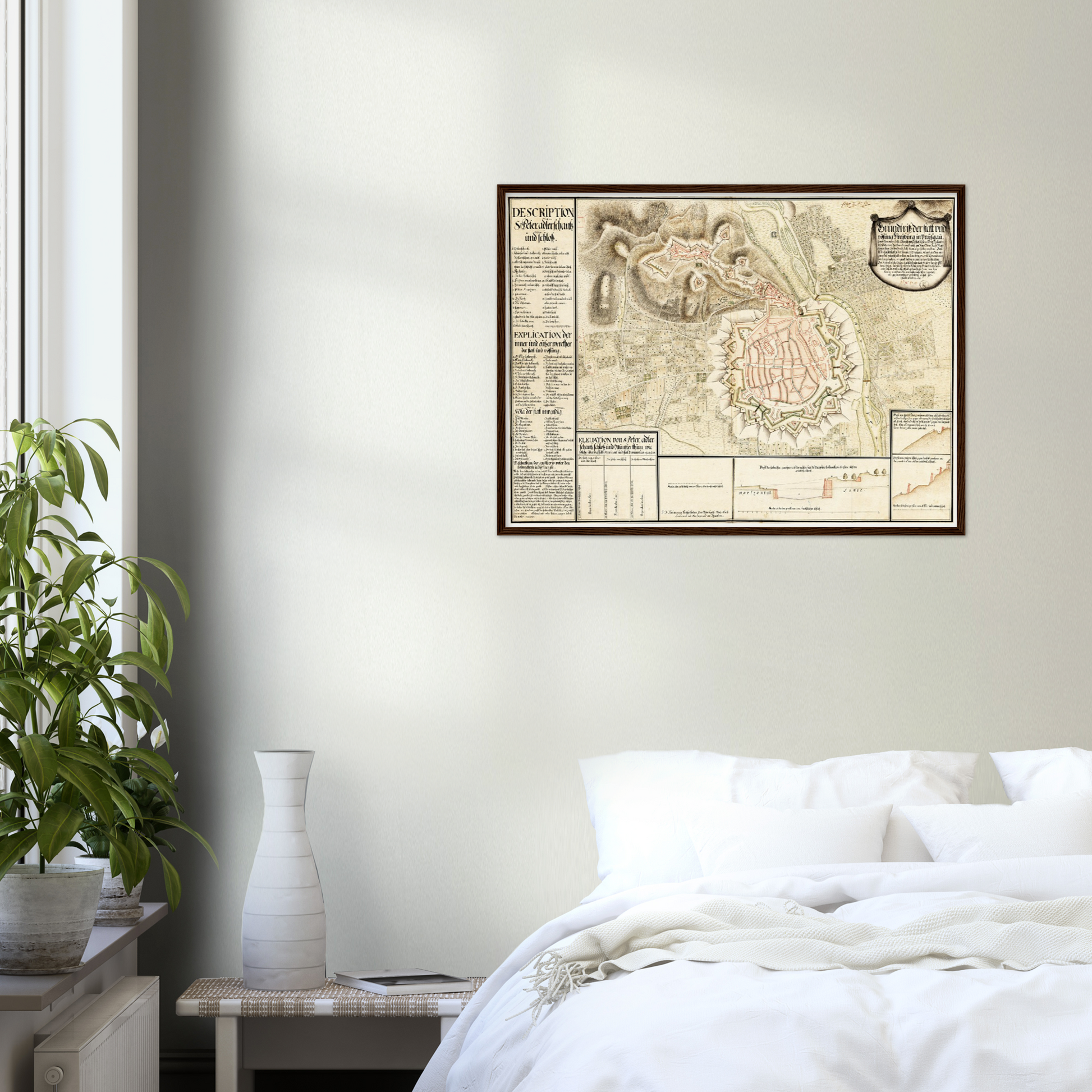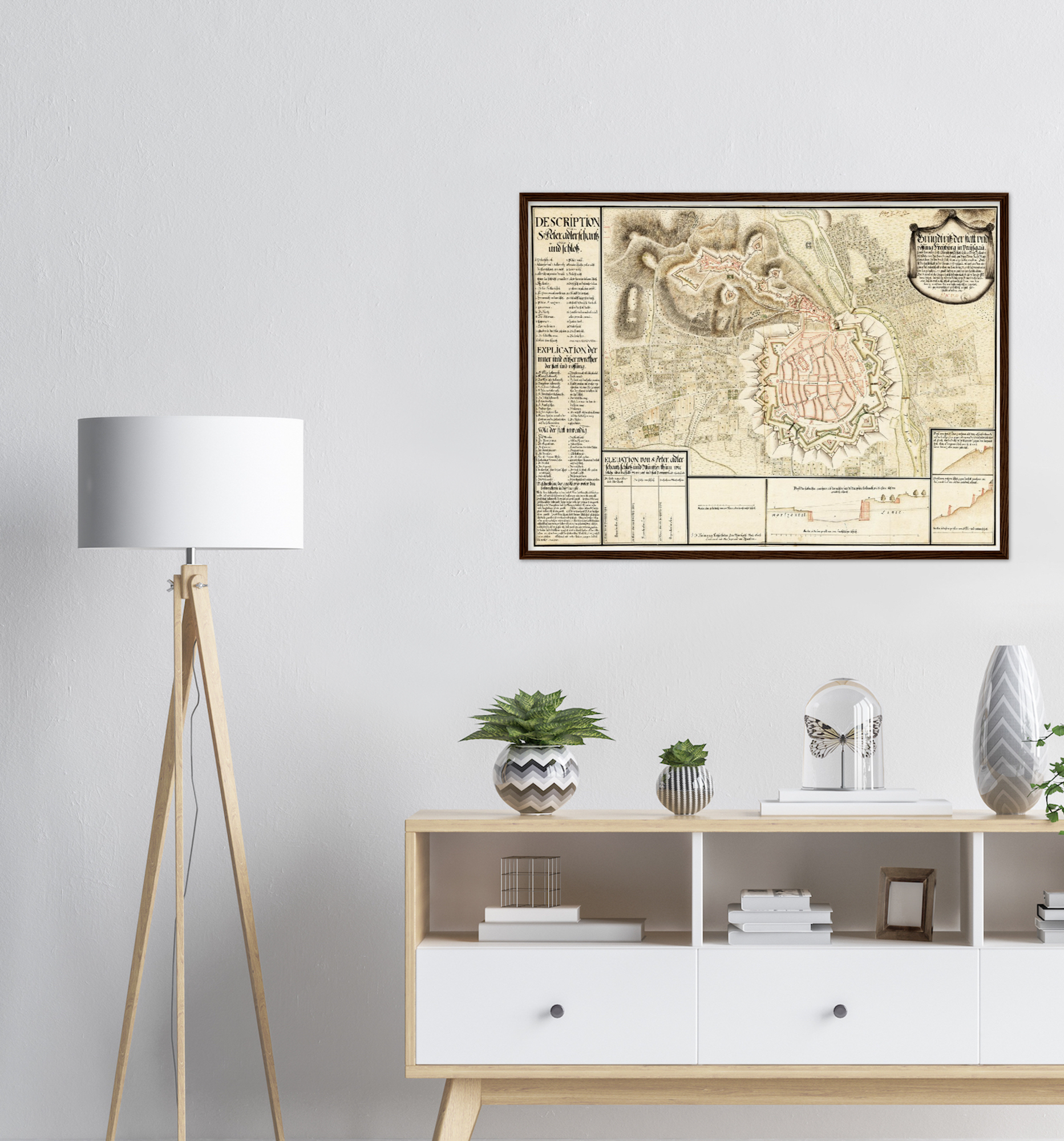Unsere Nachdrucke entstehen in Archivqualität auf feinstem, mattem Papier (250 g/m²), das jedem Raum eine eindrucksvolle Note verleiht. Die hochauflösende Digitalisierung und farbgetreue Rekonstruktion garantieren, dass du ein Stück Geschichte in unvergleichlicher Schärfe und Brillanz erlebst. Jeder Druck wird auf Bestellung in Deutschland gefertigt und ist in 3 erlesenen Größen erhältlich: 30×40 - 60×80 cm. Zum Schutz wird jede Karte in einer stabilen Verpackung versandt. Optional kannst du zwischen natürlichen, dunkelbraunen oder schwarzen Holzrahmen sowie einem eleganten schwarzen Metallrahmen wählen, der mit bruchsicherem Plexiglas ausgestattet ist.
