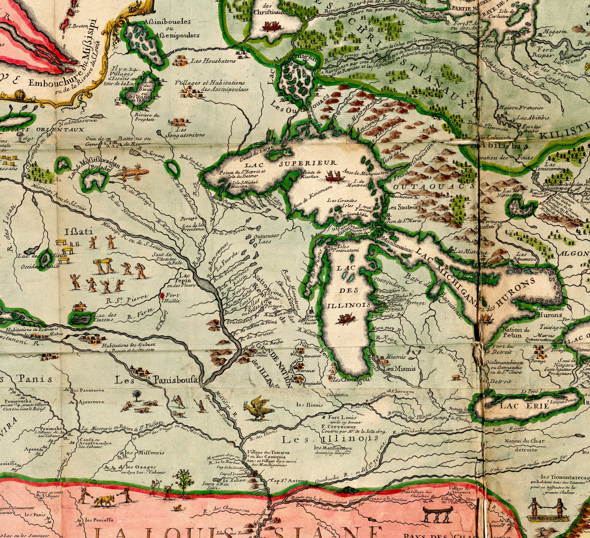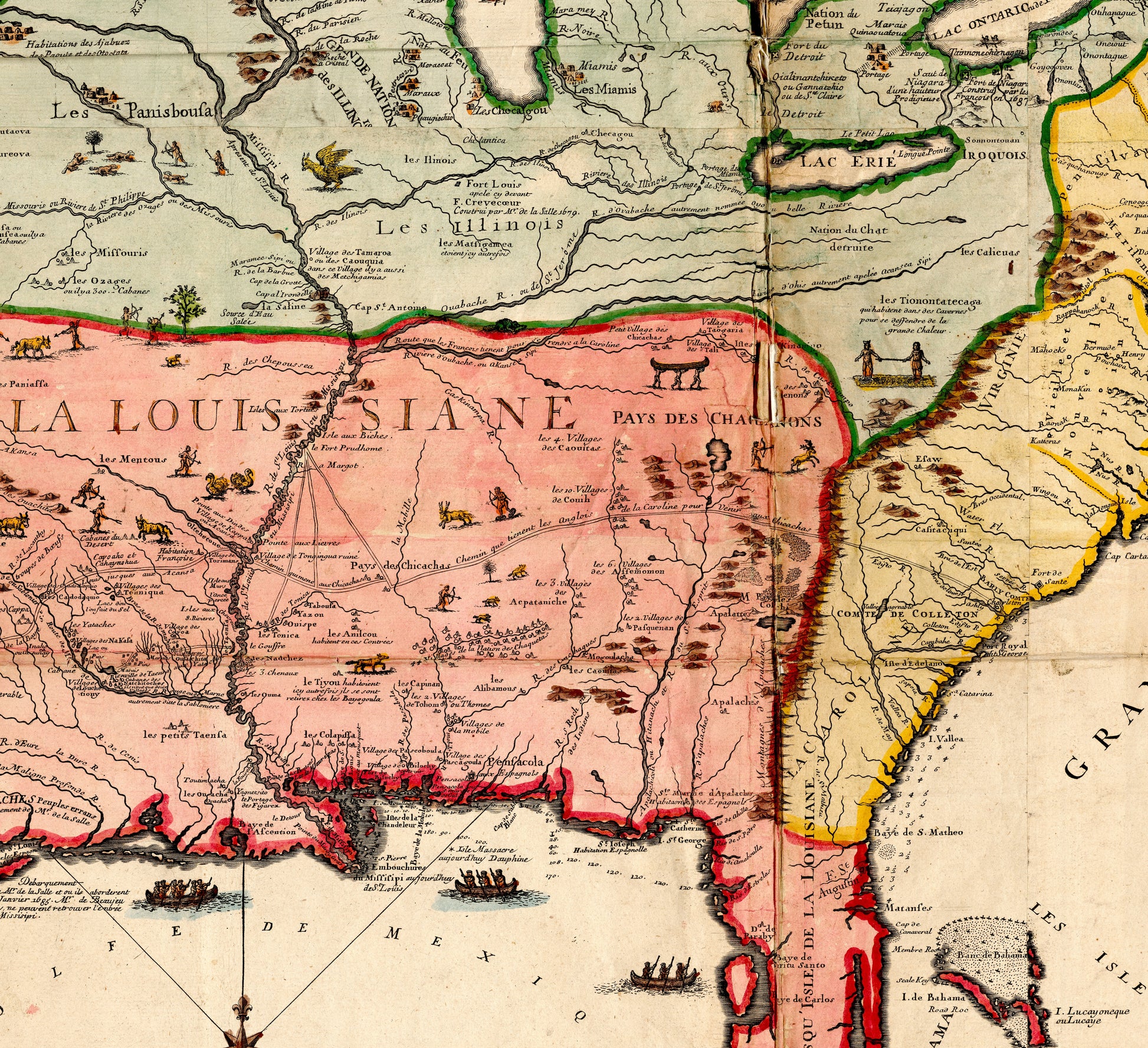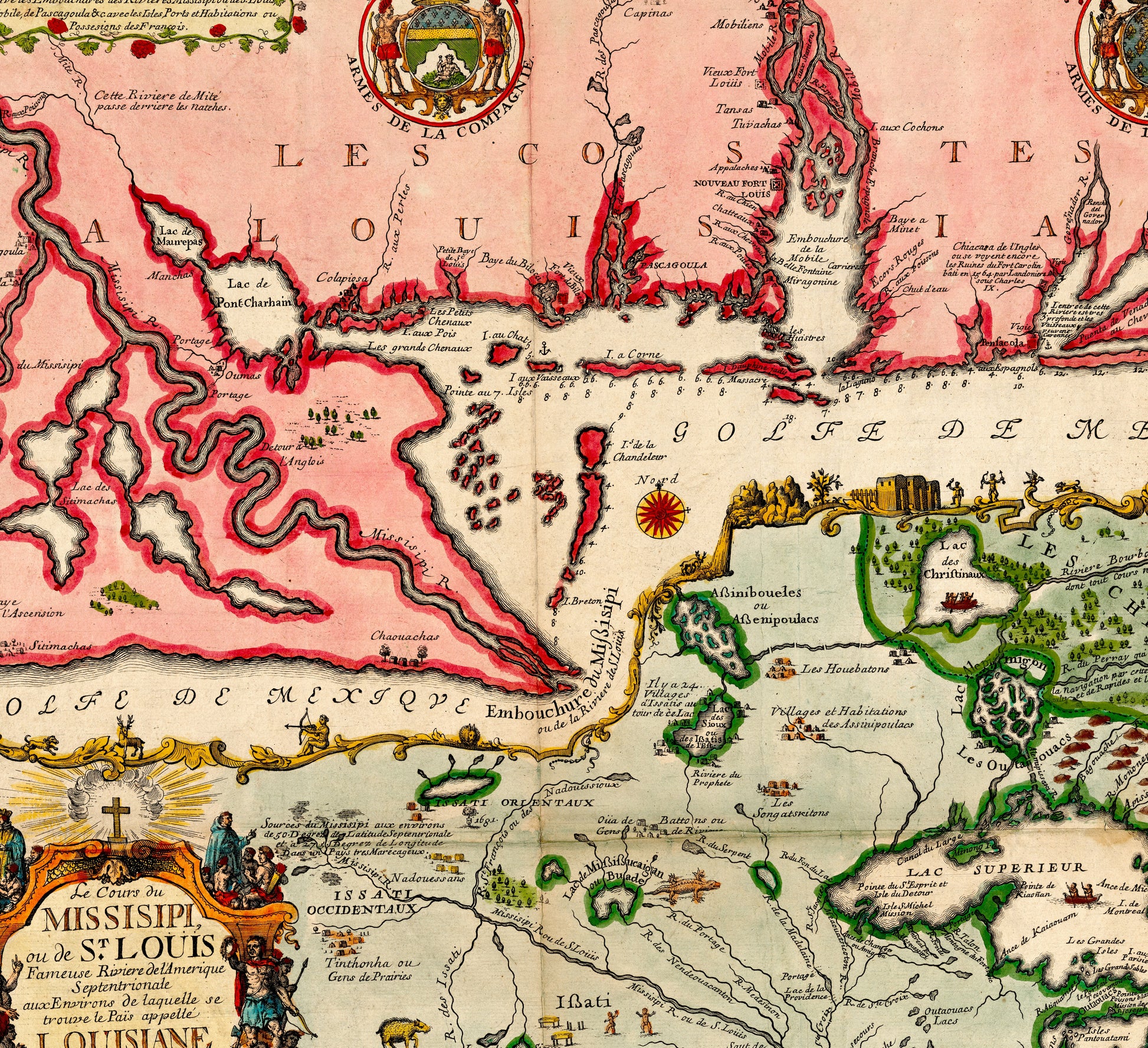 1718 war eine Zeit des Entdeckens und Erkundens. Diese Karte dokumentiert die USA, als die europäischen Kolonialmächte ihre Einflusssphären ausweiteten und die indigene Bevölkerung eine entscheidende Rolle in der Gestaltung des Landes spielte. Die Darstellung spiegelt eine Zeit wider, in der die Geografie noch voller Geheimnisse und Möglichkeiten war. Die präzise Kartografie zeugt von der Neugier und dem Pioniergeist jener Epoche und bietet einen seltenen Einblick in die Anfänge einer Nation.