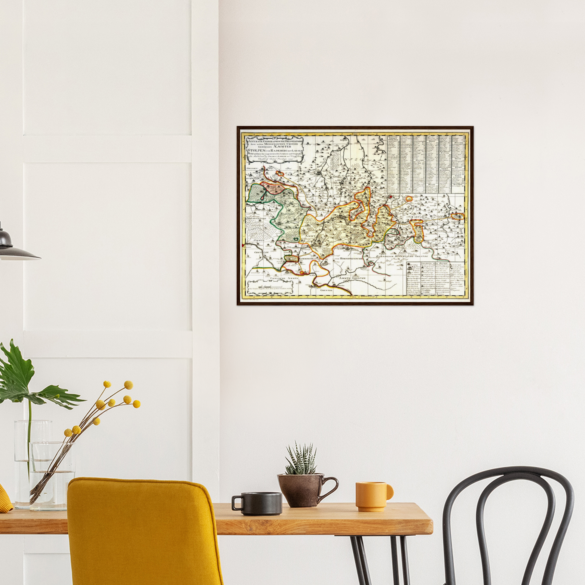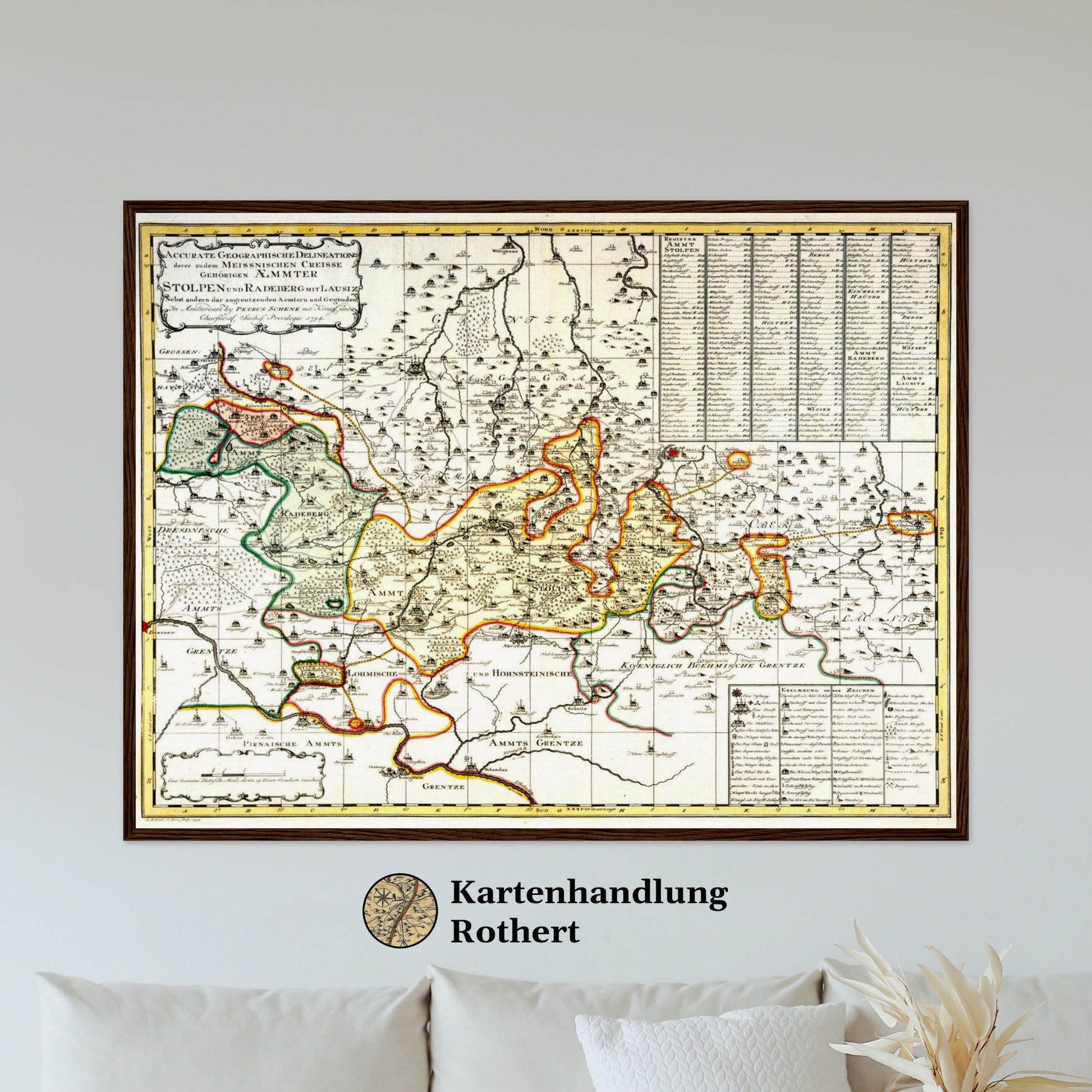 Mit großer Sorgfalt und kartografischer Klarheit stellt diese Karte der Ämter Radeberg und Stolpen eine Region dar, die durch Verwaltung, Landwirtschaft und gewachsene Siedlungsstrukturen geprägt ist. Straßen, Ortschaften, Wälder und Gewässer sind ausgewogen dargestellt und ergeben ein harmonisches Gesamtbild. Die nüchterne, sachliche Gestaltung entspricht dem Stil des mittleren 18. Jahrhunderts und verbindet Funktionalität mit ästhetischem Anspruch.