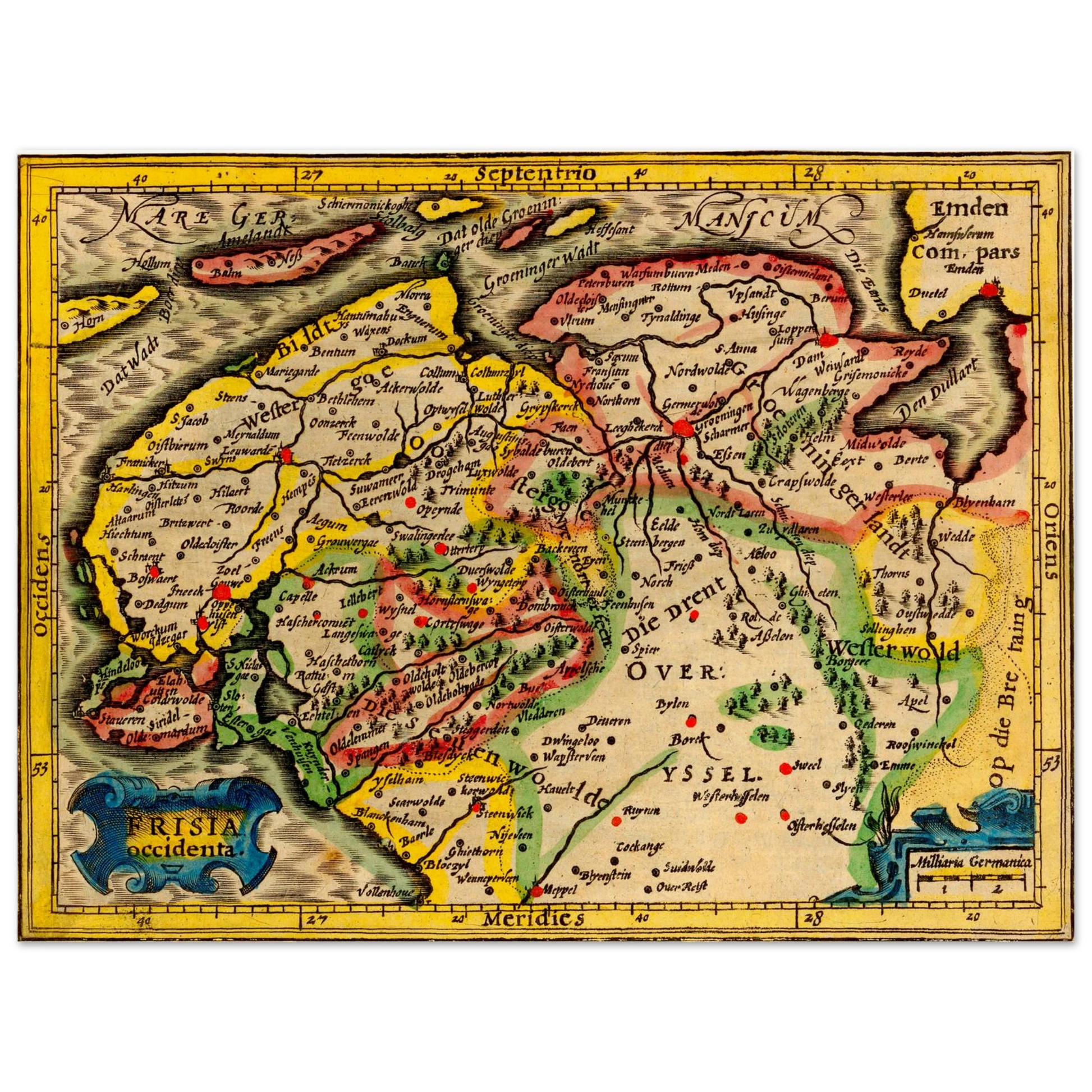 Vom Wind der Nordseeküste umweht und durch die Kunst der frühen Kartografen veredelt, zeigt diese Karte Ostfriesland im Jahr 1609 in beeindruckender Klarheit. Die feine Gravur, die harmonische Linienführung und die präzise Wiedergabe der Landschaft verleihen ihr eine zeitlose Würde. Jede Kurve, jeder Küstenzug scheint die stille Geschichte eines Landes zu erzählen, das seit Jahrhunderten vom Meer geformt wird.