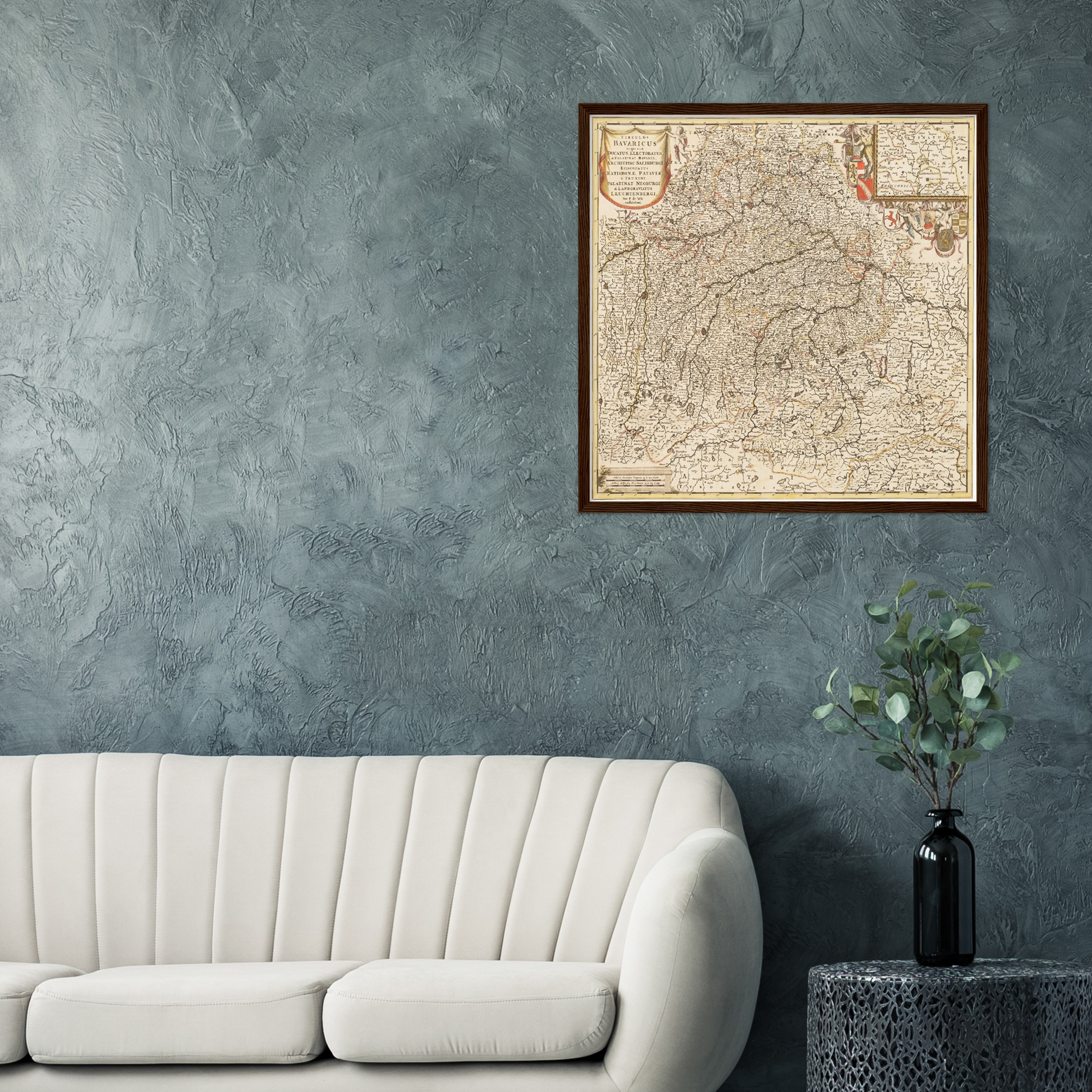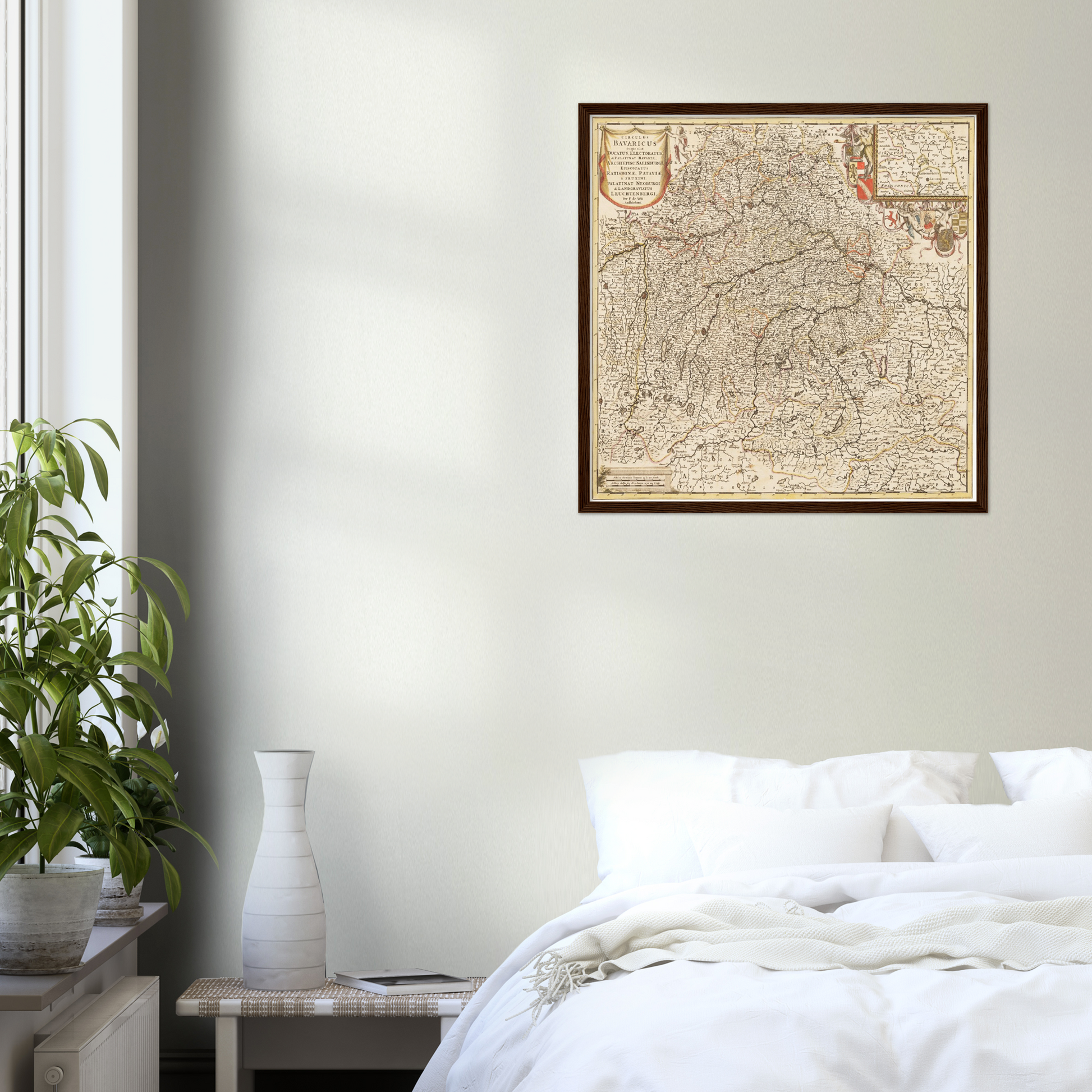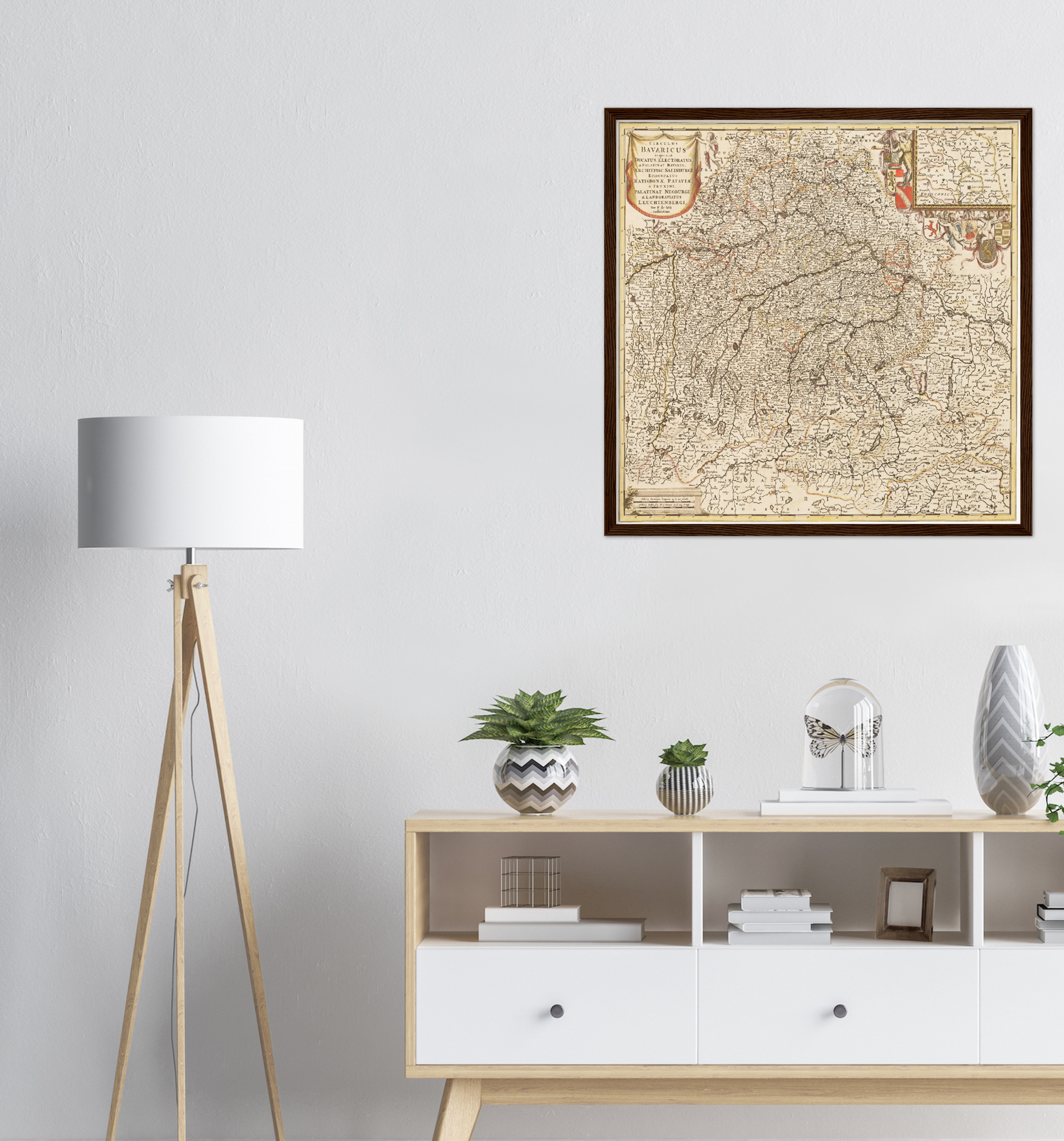 Diese historische Landkarte von Bayern um 1698 entführt Sie auf eine Zeitreise in die Vergangenheit, in der Kunst und Wissenschaft Hand in Hand gingen. Stellen Sie sich vor, wie diese Karte einst zu den bedeutendsten Kartographischen Werken ihrer Zeit zählte und ihre filigrane Gravur die Pracht und Komplexität eines Landes einfing, das in seiner historischen Bedeutung unübertroffen war. Die kunstvolle Darstellung der geschwungenen Linien und der feinen Details lässt die Herzen von Geschichts- und Kunstliebhabern höher schlagen. Eine exquisite Möglichkeit, Ihre Wände mit bedeutender Vergangenheit zu schmücken.