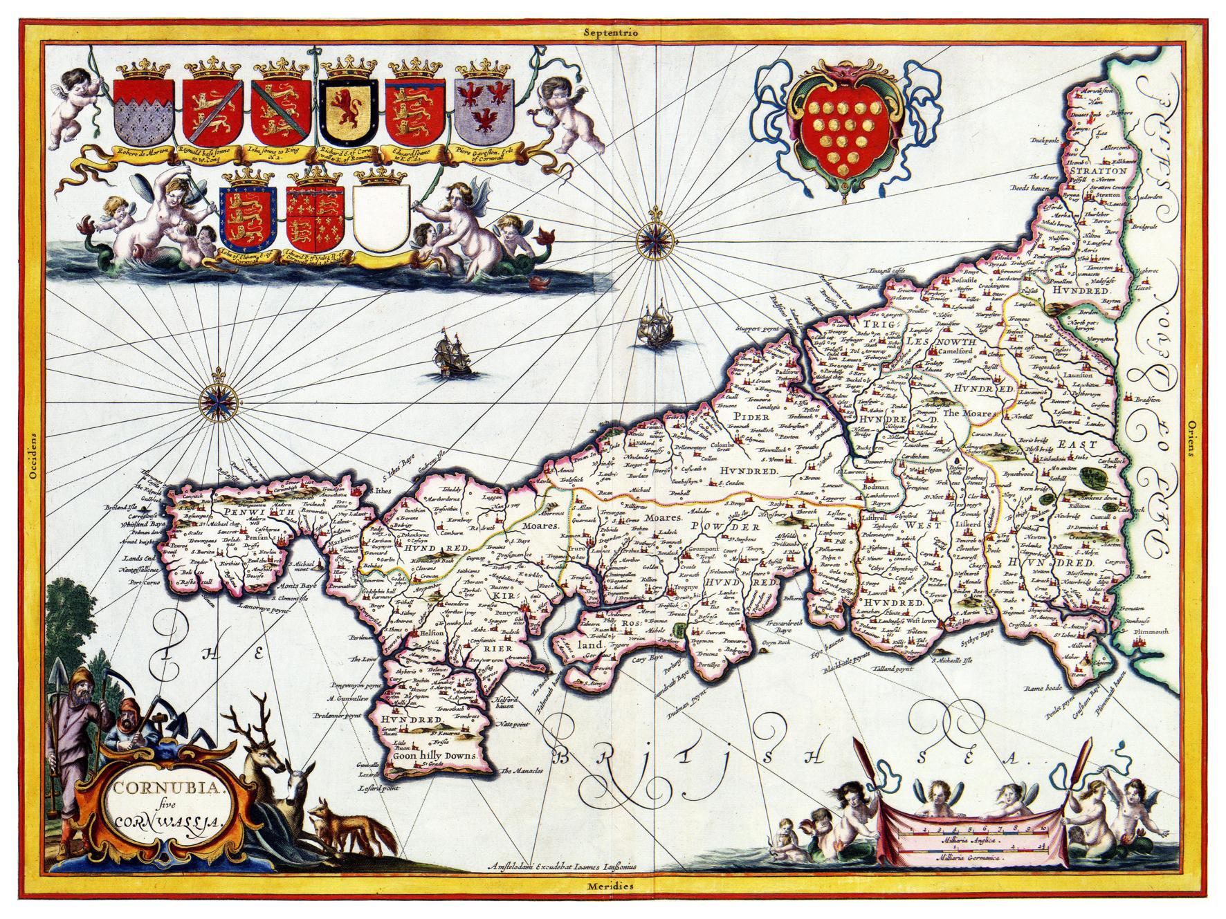Eine prachtvolle historische Landkarte von Cornwall, die die faszinierende Geschichte und Kunst des 17. Jahrhunderts verkörpert.