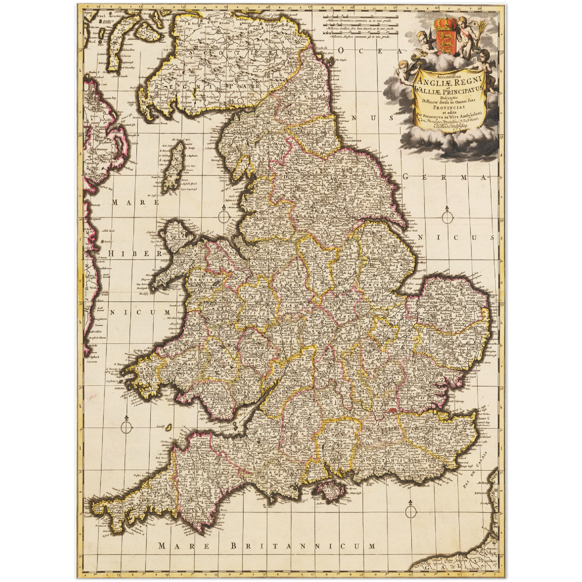 Um 1698 entstand diese bemerkenswerte Darstellung des englischen Territoriums. Ein Meisterwerk der Kartographie, geschaffen in einer Zeit, in der die Kenntnis der Welt stetig wuchs und die Neugier der Menschen beflügelte. Der ausführliche Detailgrad und die liebevoll gestalteten Symbole auf der Karte spiegeln den Stolz und die Präzision des Kartografen wider, der in jedem Strich historische Genauigkeit und ästhetische Schönheit vereinte. Solche Karten spielten eine wesentliche Rolle im politischen und wirtschaftlichen Leben des spätmittelalterlichen Europas, da sie die Wahrnehmung von Territorien und dessen Einflussmöglichkeiten prägten. Heute wird diese Karte nicht nur als kunsthistorisches Artefakt geschätzt, sondern auch als kulturelles Dokument, das die Evolution des Wissens und der Gesellschaft verdeutlicht.
