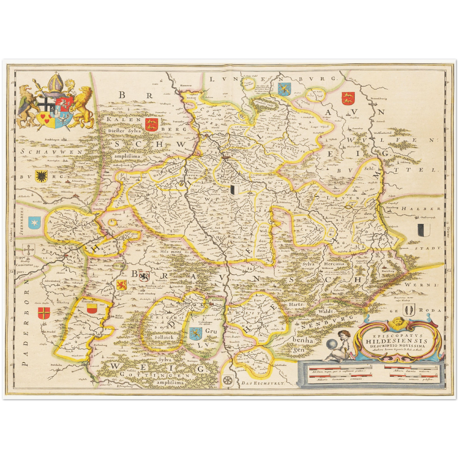 Tauchen Sie ein in die Geschichte mit dieser faszinierenden historischen Landkarte von Hildesheim um 1635 — ein Fenster in die Vergangenheit, gedruckt auf edlem Papier.
