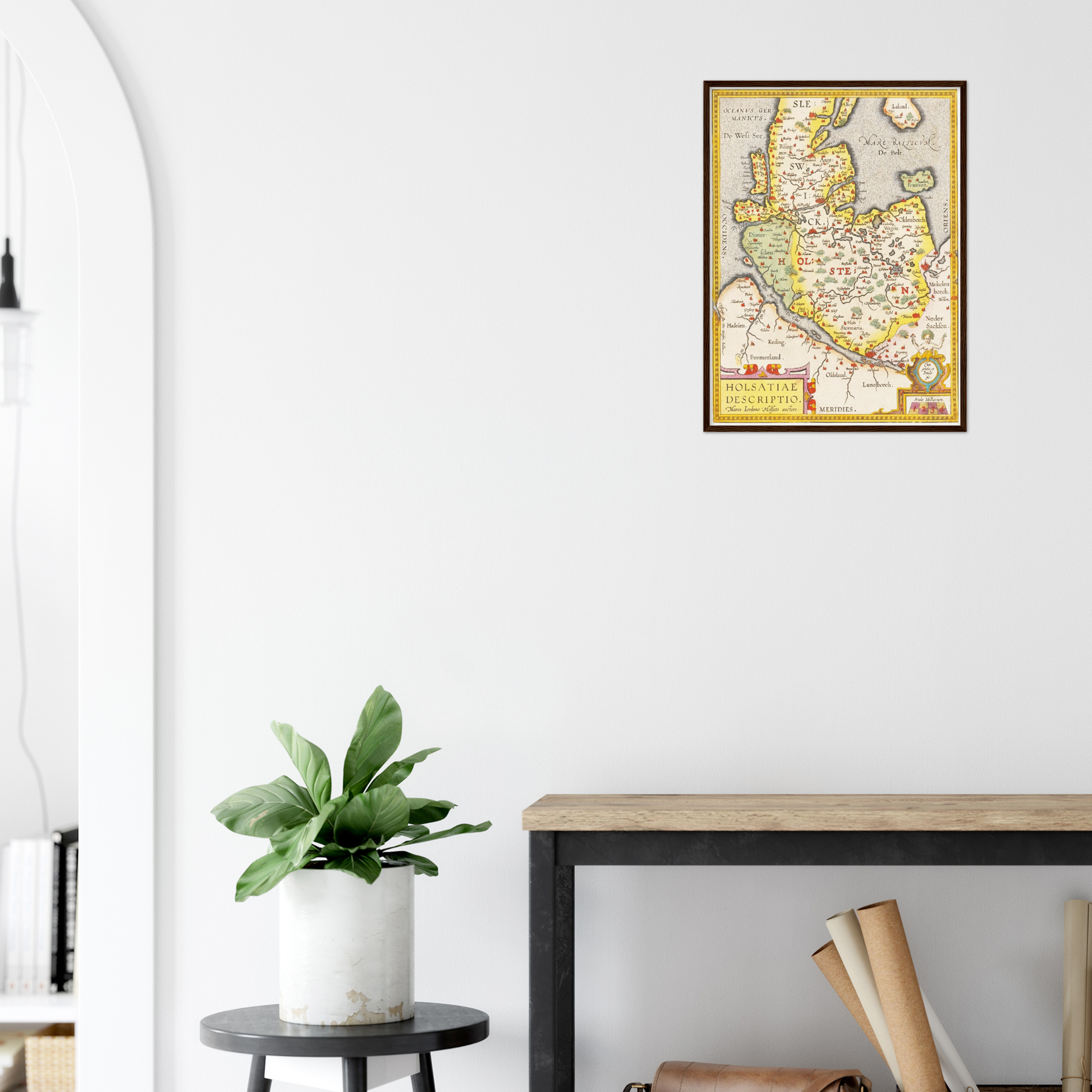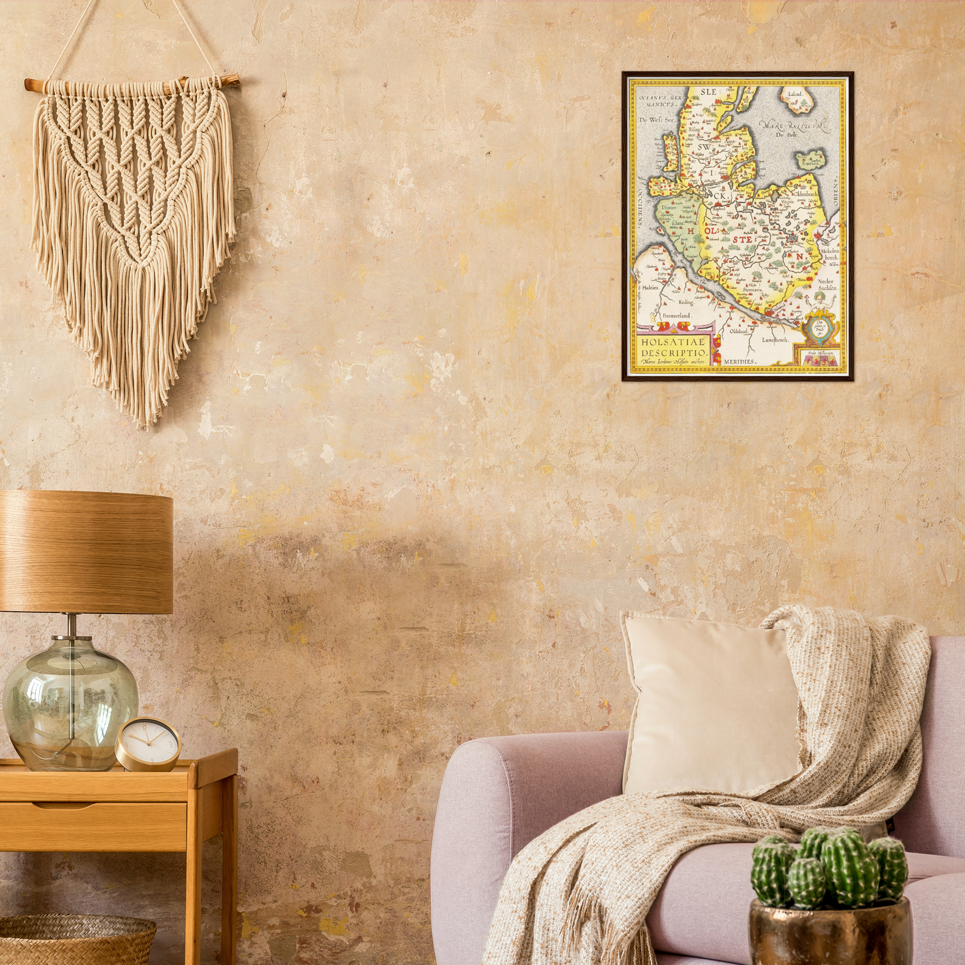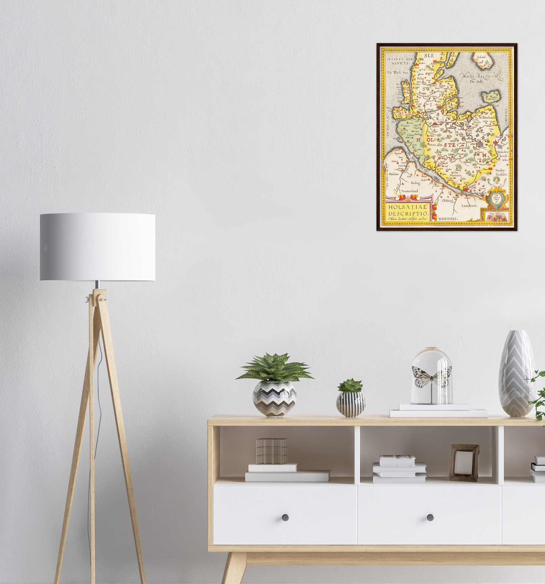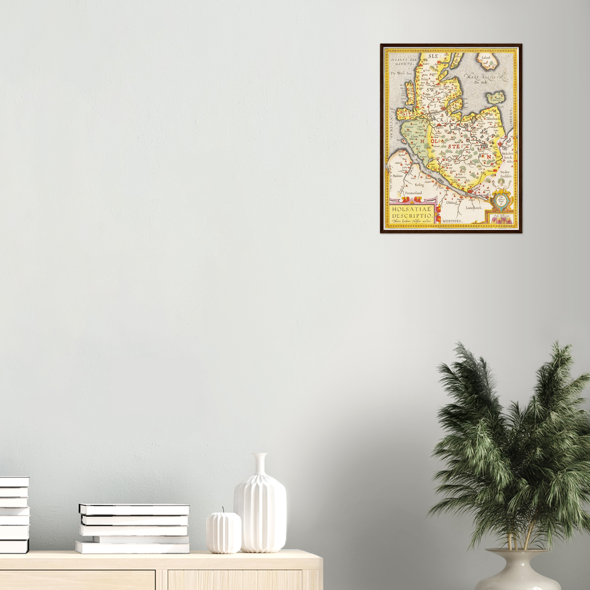Betreten Sie eine Welt, in der die Grenzen des heute so vertrauten Holsteins noch in einem anderen Licht erschienen. Diese Landkarte von 1609 zieht Sie in ihren Bann mit einem Reichtum an Details, die Geschichte lebendig werden lassen. Die eindrucksvollen Linien und die sorgfältige Gravur erzählen von einer Ära, in der Entdeckungen und das Wissen um die Welt stetig wuchsen. Diese Karte ist nicht nur ein informatives Dokument, sondern auch ein künstlerisches Meisterwerk, das jedem Raum in Ihrem Zuhause einen Hauch von Geschichte und Exklusivität verleiht. Das matte, hochwertige Papier, auf dem sie gedruckt ist, verstärkt ihre zeitlose Eleganz und wird zum stilvollen Mittelpunkt Ihrer Einrichtung.
