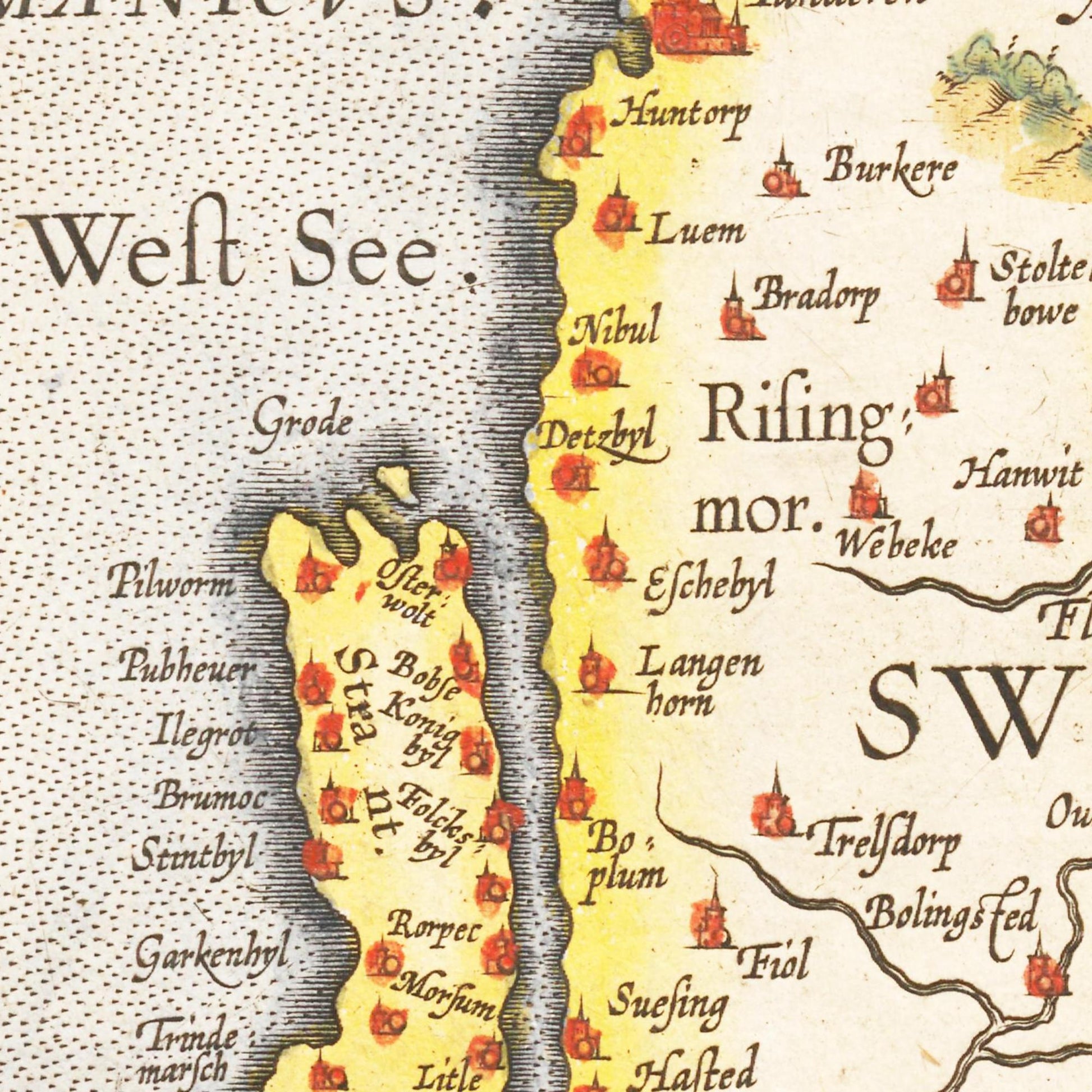 Die Landkarte Holsteins aus dem Jahr 1609 gibt uns einen tieferen Einblick in die Welt der Renaissance. Diese Periode, geprägt von einer Wiederbelebung des Interesses an Wissen und Entdeckung, spiegelt sich in der detailreichen Darstellung der Region wider, die damals ein bedeutender Knotenpunkt im Norden Deutschlands war. Der Kartograph, dessen sorgfältige Arbeit hier bewundert werden kann, nutzte die ihm zur Verfügung stehenden Techniken, um eine karte von erstaunlicher Genauigkeit und Präzision zu schaffen. Die Symbole und Details geben Aufschluss über das damalige Verständnis der Geographie und das Weltbild jener Zeit. Heute erinnert uns diese Karte daran, wie sich unser Wissen und unsere Sichtweisen im Laufe der Jahrhunderte entwickelt haben, und sie bleibt ein Stück von unschätzbarem kulturellem Wert.