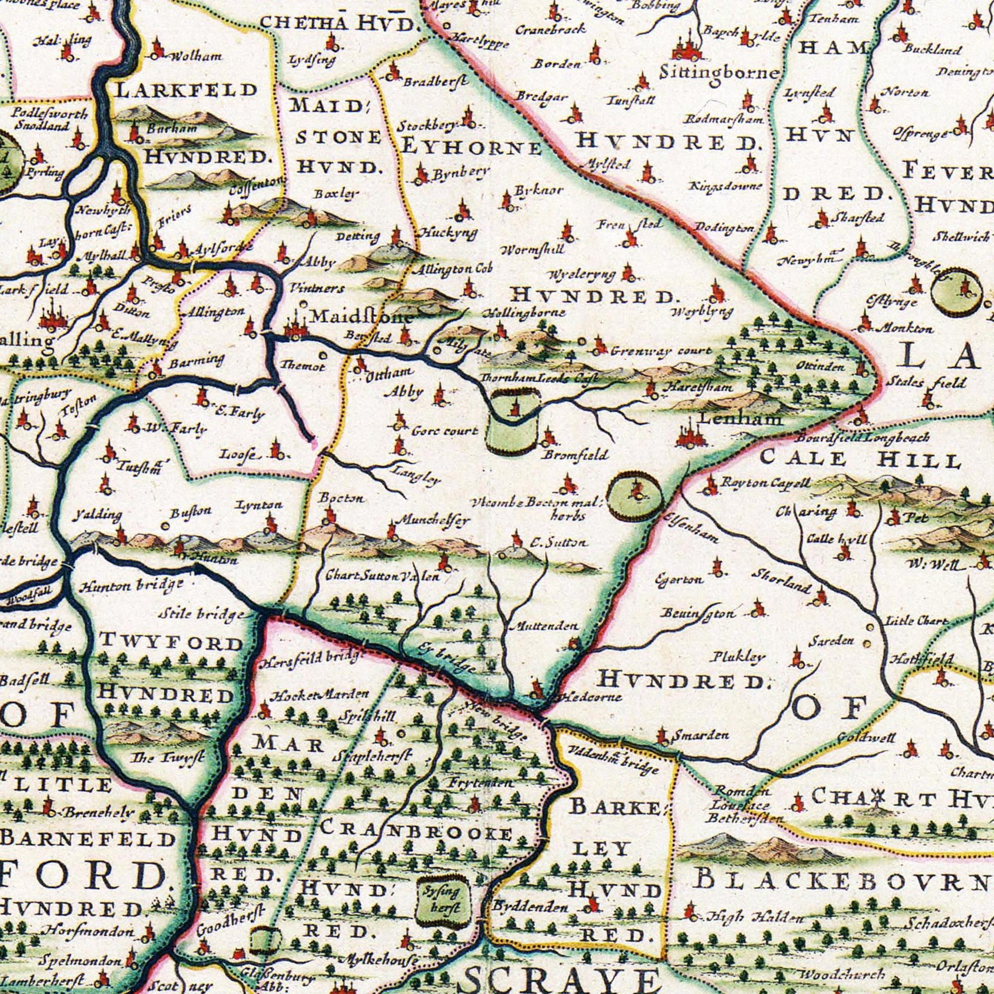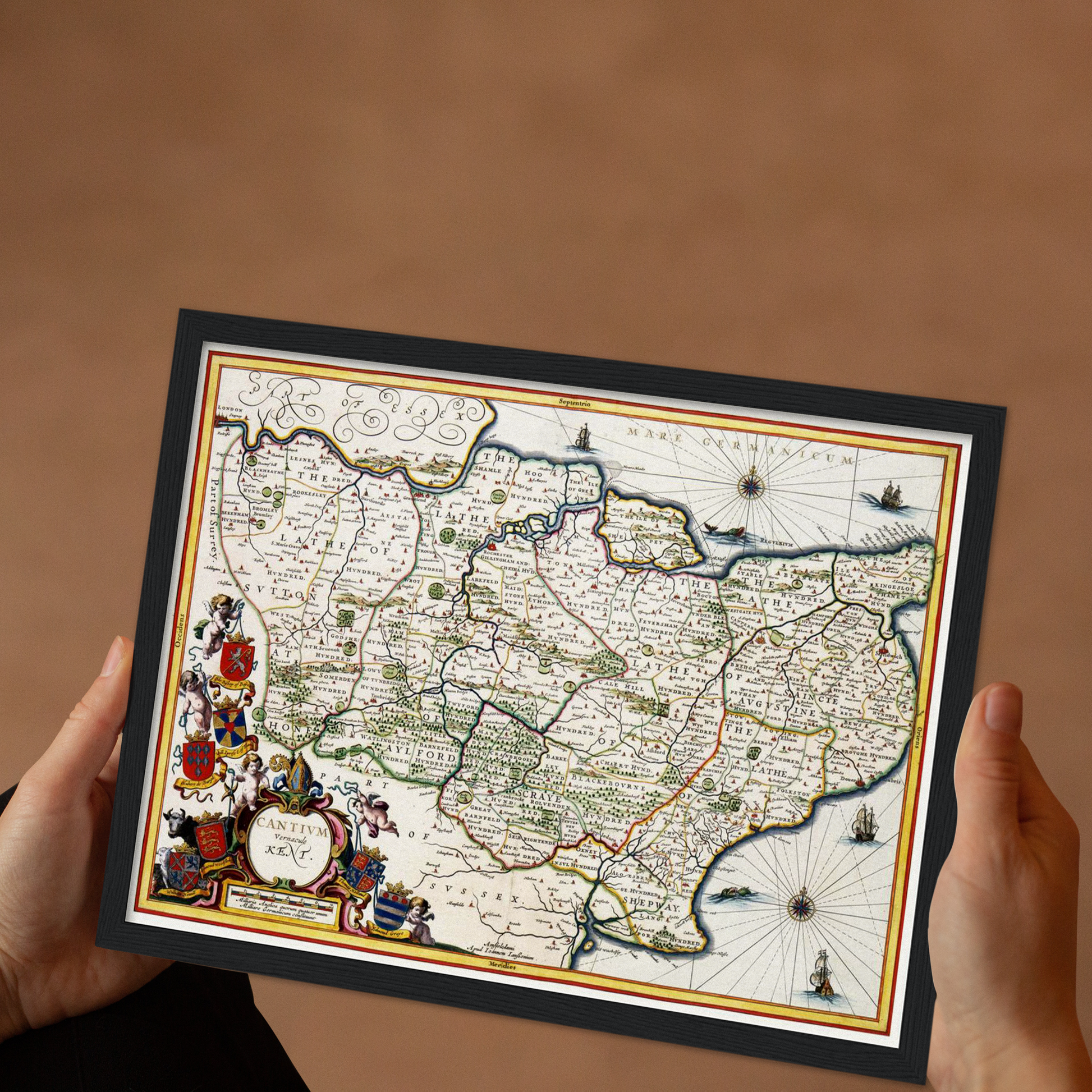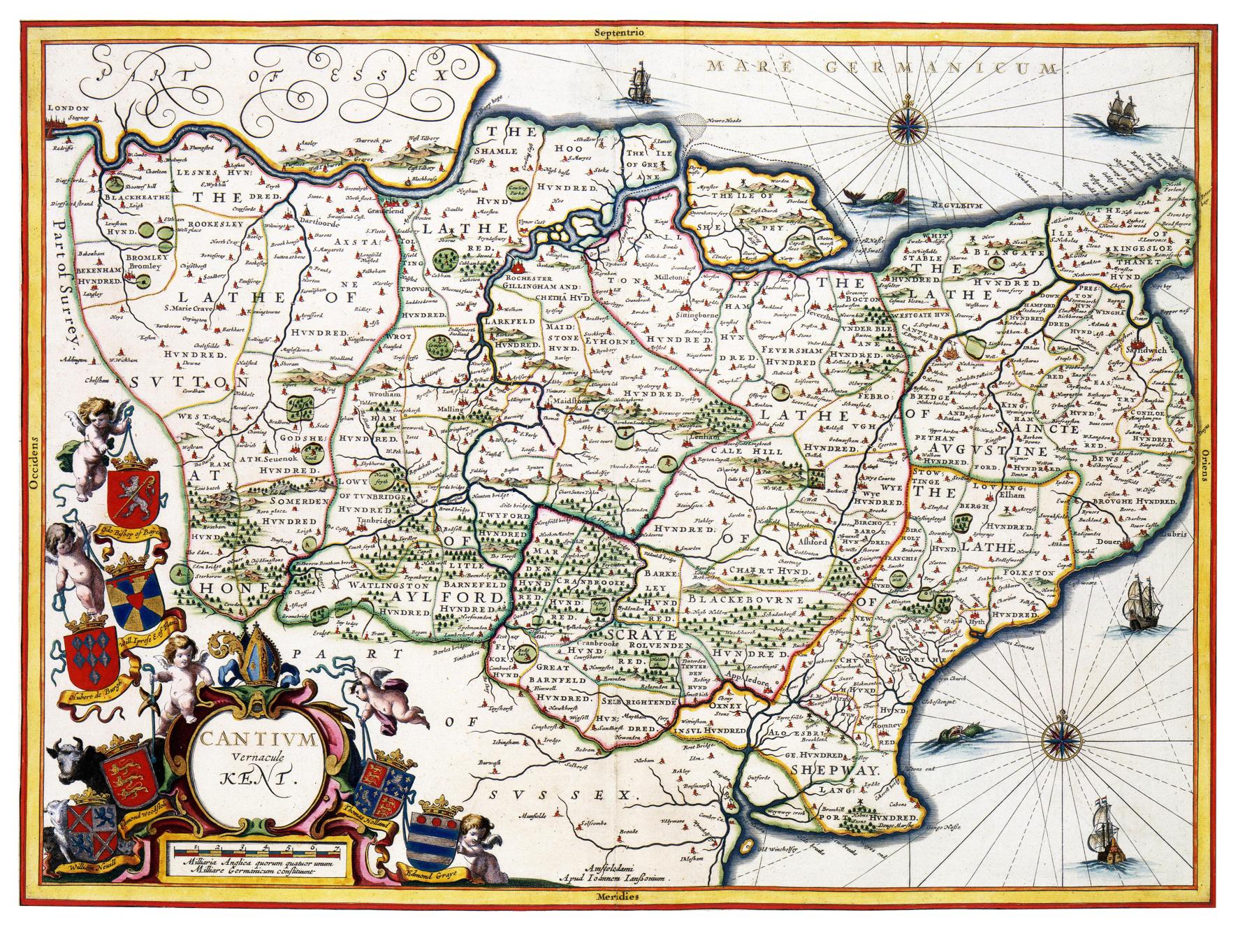 Lassen Sie sich in das England des 17. Jahrhunderts entführen mit dieser detailreichen Historischen Landkarte von Kent um 1646.