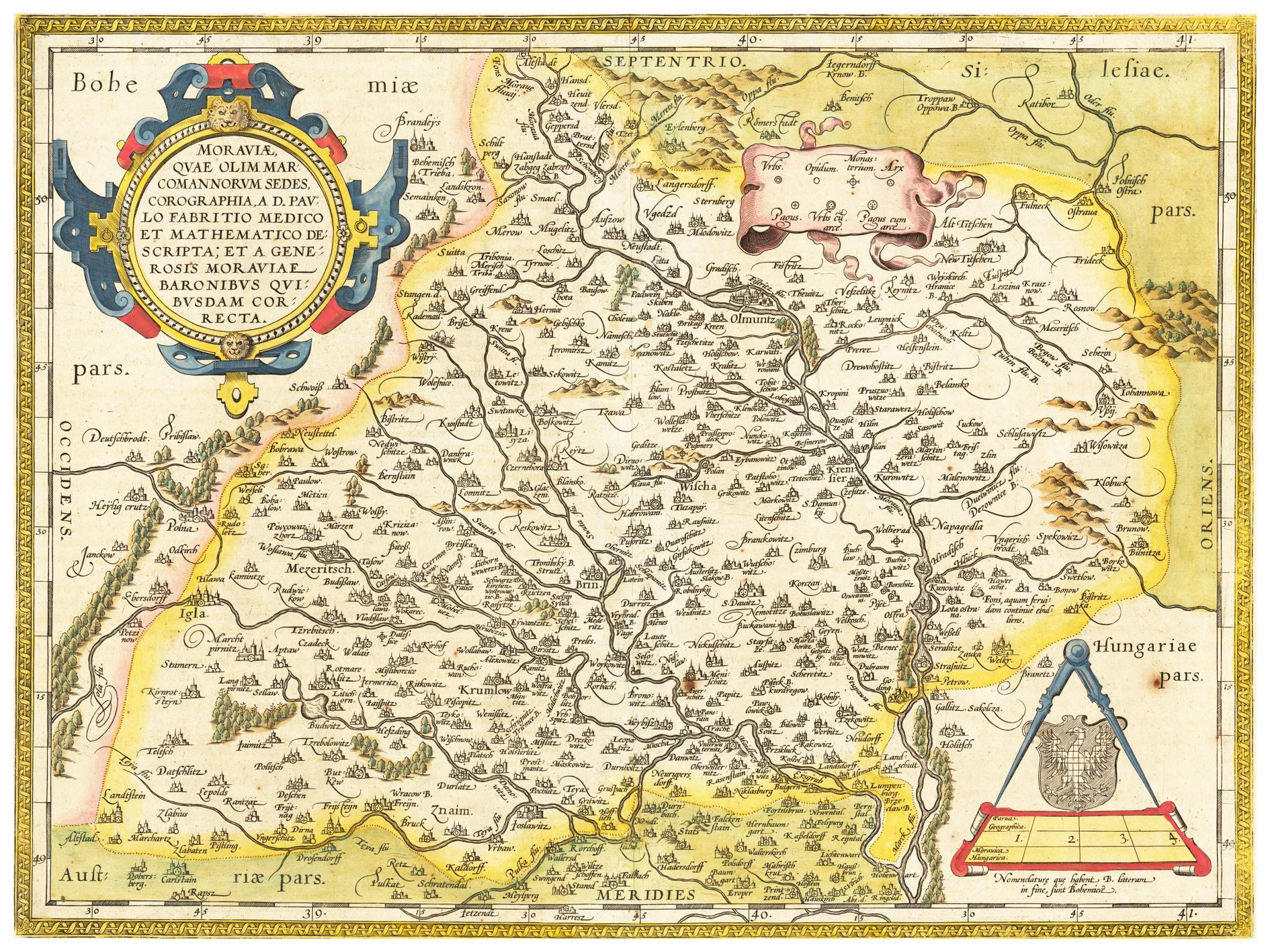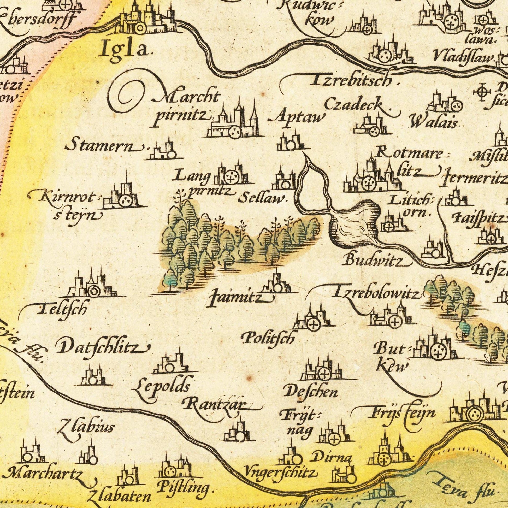 Die historische Landkarte von Mähren um 1609 stammt aus einer Epoche, in der Kartografie sowohl Wissenschaft als auch Kunst war. In dieser Zeit, als Mähren ein bedeutender Teil des Habsburgerreichs war, war die präzise Darstellung von Landstrichen nicht nur wichtig für Handel und Reisen, sondern auch für das Verständnis der Welt und ihrer politischen Grenzen. Der Kartograph verwendete die damals innovativsten Techniken, um nicht nur geografische Genauigkeit, sondern auch künstlerische Schönheit zu erreichen. Symbole und Ikonografien auf der Karte verraten vieles über das damalige Weltbild und die kulturelle Bedeutung der Region. Heute ist diese Karte ein wertvolles Kulturgut, das uns auf eindrucksvolle Weise daran erinnert, wie Menschen ihre Welt in einer Zeit der Entdeckungen und Veränderungen sahen.