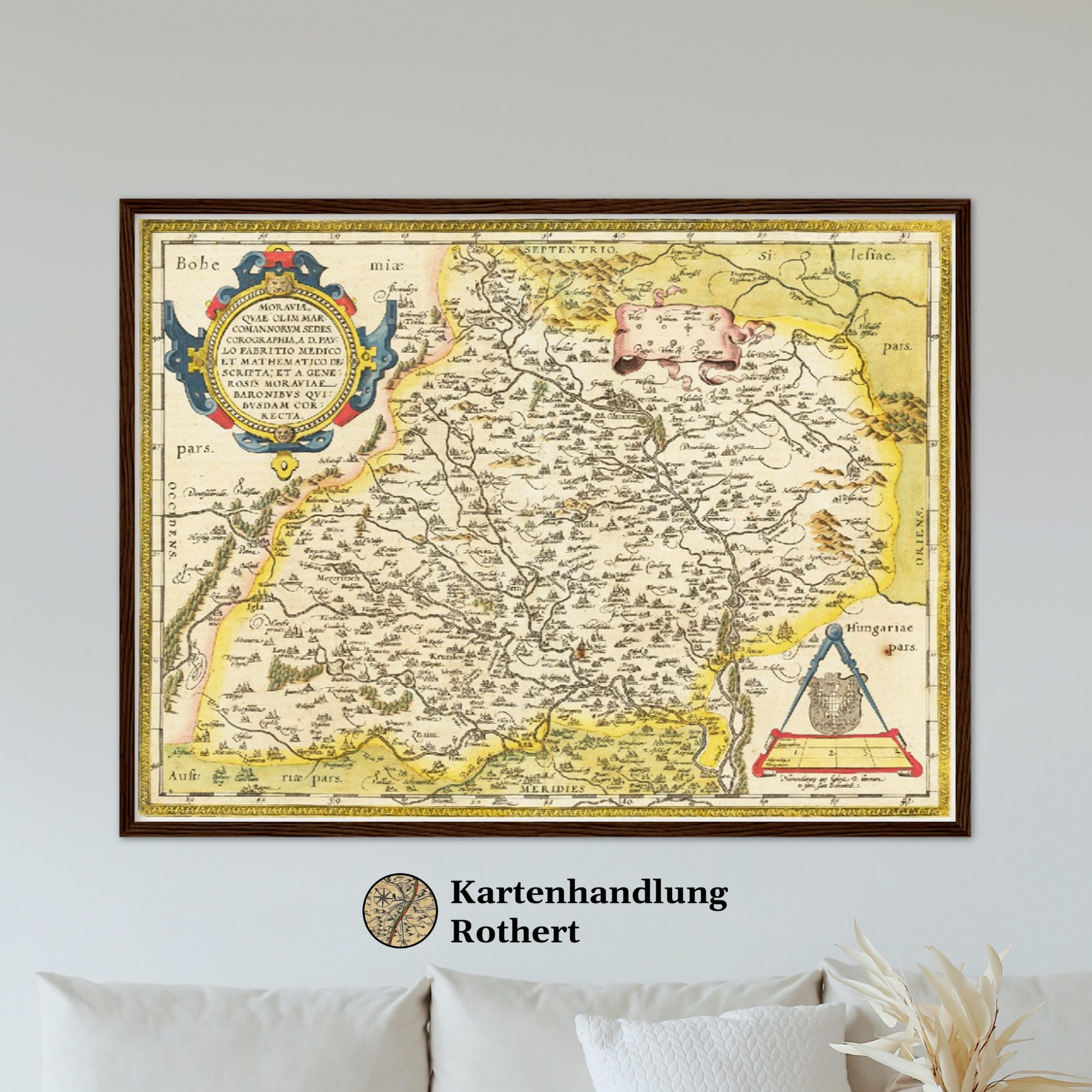 Diese historische Landkarte von Mähren aus dem Jahr 1609 bietet eine faszinierende Sicht in die Vergangenheit und ist ein einzigartiger Blickfang für jedes stilvolle Zuhause.