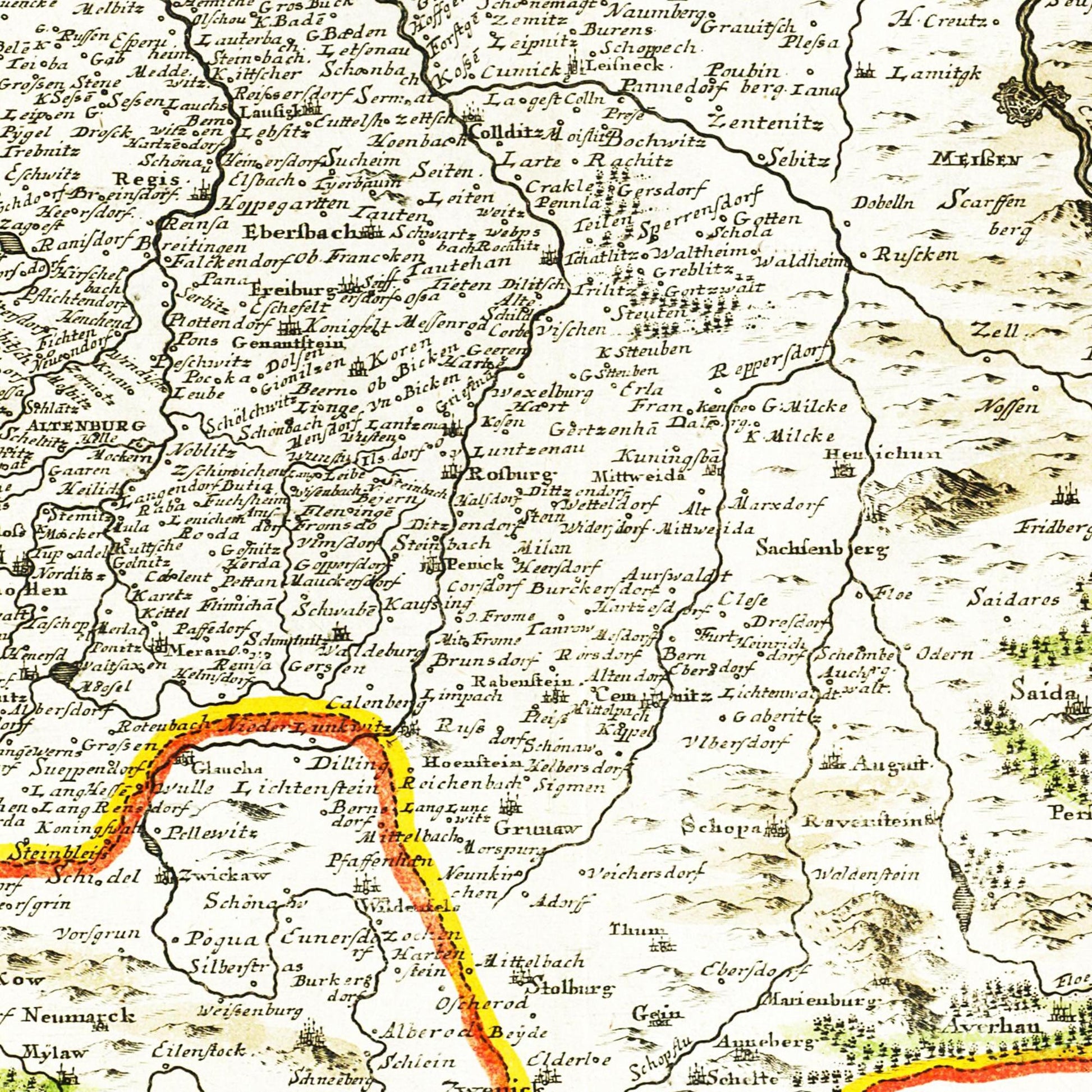 Die historische Landkarte Meißen um 1700 eröffnet uns einen authentischen Blick auf das Europa der Barockzeit. In einer Epoche großer Umbrüche und kultureller Blüte wurde Meißen, bekannt für seine Porzellankunst, zu einer lebendigen Stadt im Herzen Sachsens. Der Kartograph jener Zeit, dessen Name in dieser Karte verewigt bleibt, legte besonderen Wert auf die detailgetreue Darstellung urbaner Strukturen und der gebietsgeografischen Eigenheiten. Diese Sorgfalt im Detail sowie die unverwechselbare Symbolik dieser Epoche machen die Karte zu einem wertvollen Dokument unserer Kulturgeschichte. Heute bietet die Karte nicht nur ästhetischen Genuss, sondern auch tiefen Einblick in die historischen und sozialen Strömungen einer vergangenen Welt.
