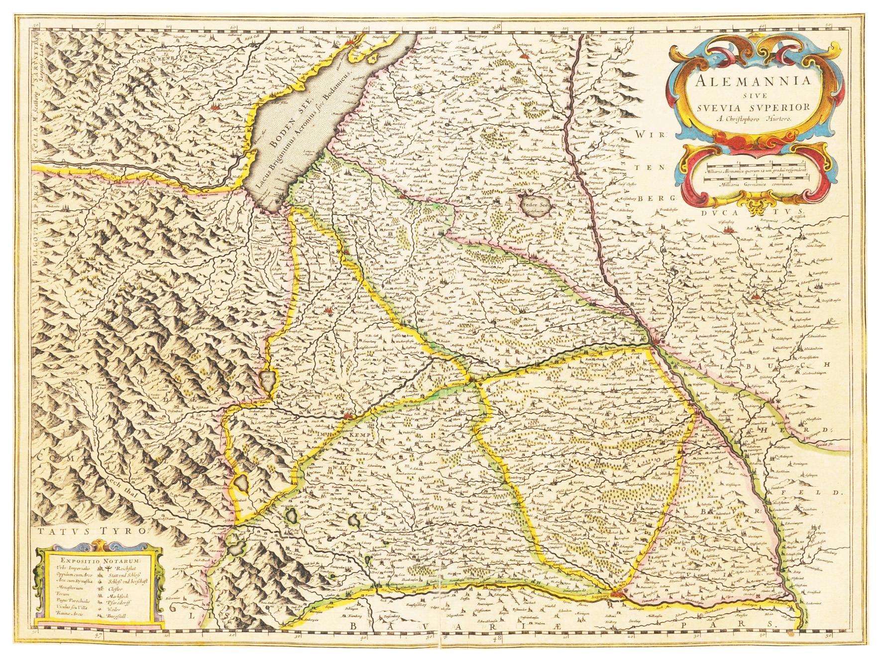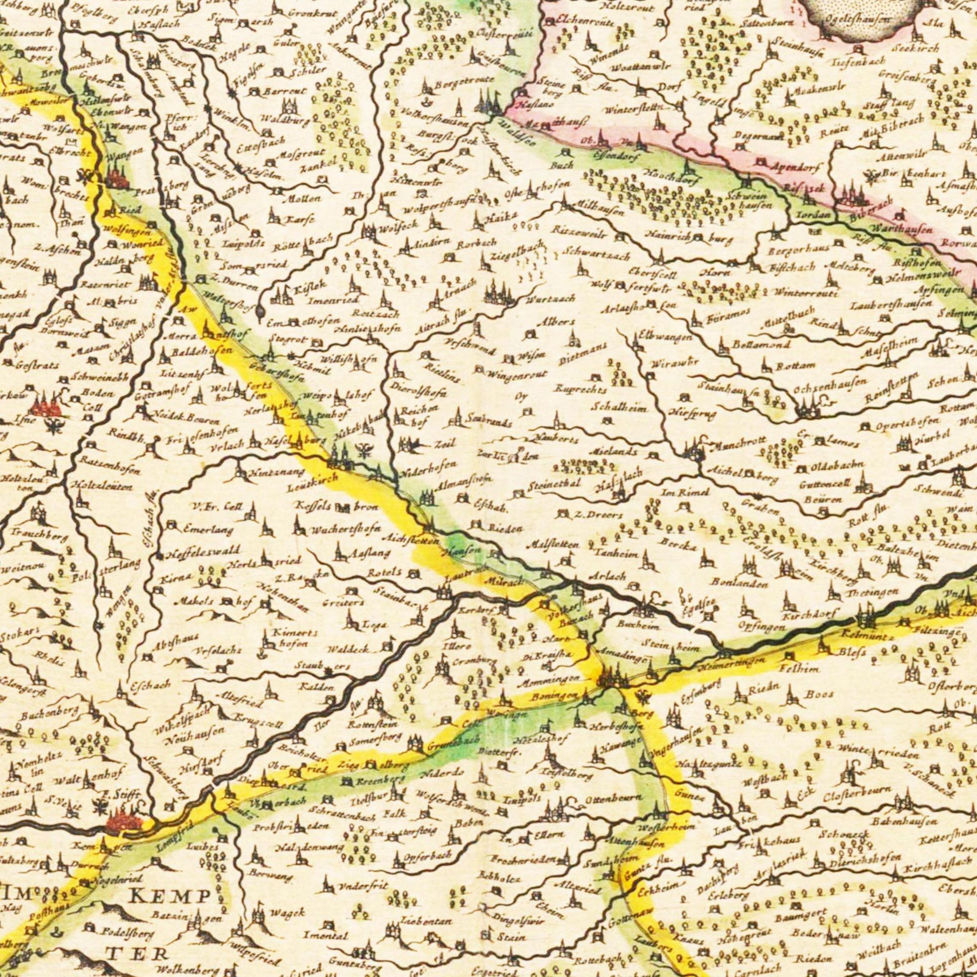 Tauchen Sie ein in die faszinierende Geschichte von Oberschwaben mit dieser exquisiten Landkarte aus dem Jahr 1635.