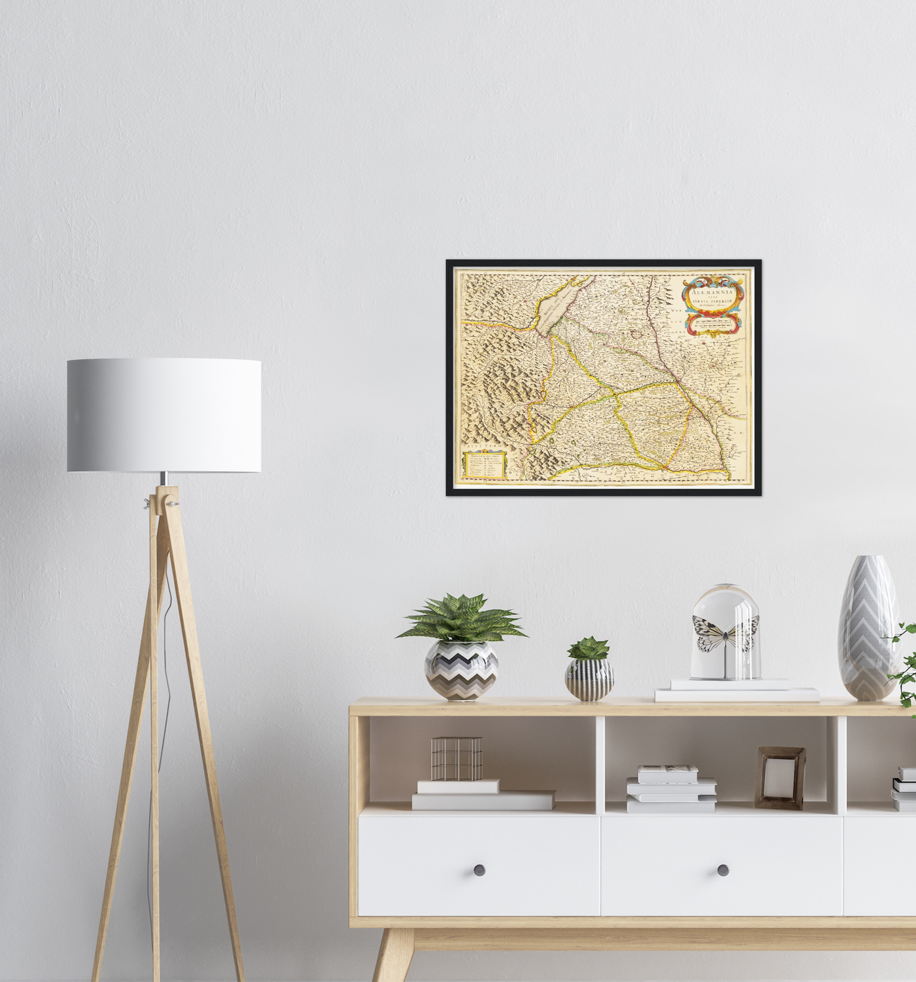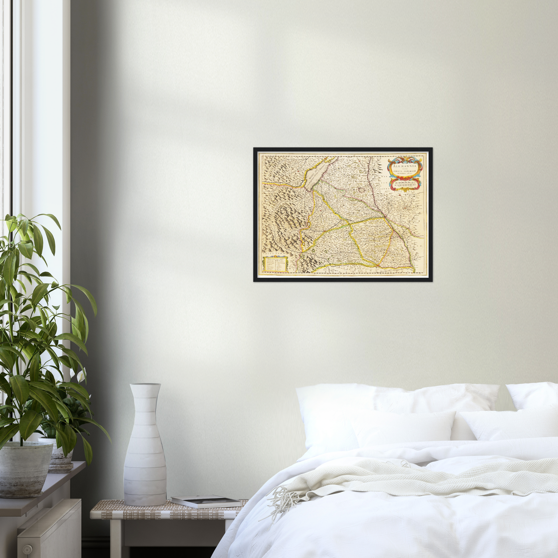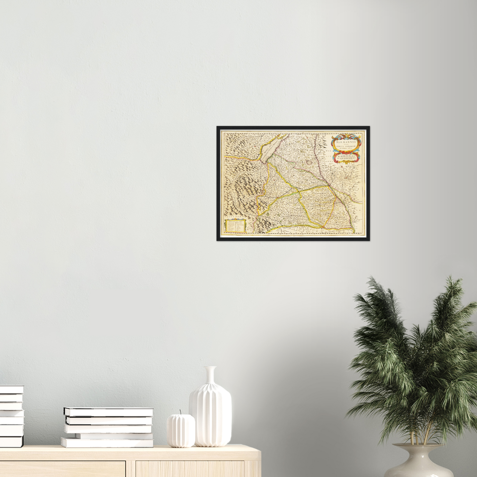 Unsere Nachdrucke entstehen in Archivqualität auf feinstem, mattem Papier (250 g/m²), das jedem Raum eine eindrucksvolle Note verleiht. Die hochauflösende Digitalisierung und farbgetreue Rekonstruktion garantieren, dass du ein Stück Geschichte in unvergleichlicher Schärfe und Brillanz erlebst. Jeder Druck wird auf Bestellung in Deutschland gefertigt und ist in 3 erlesenen Größen erhältlich: 40x30 - 60x45 cm. Zum Schutz wird jede Karte in einer stabilen Verpackung versandt. Optional kannst du zwischen natürlichen, dunkelbraunen oder schwarzen Holzrahmen sowie einem eleganten schwarzen Metallrahmen wählen, der mit bruchsicherem Plexiglas ausgestattet ist.