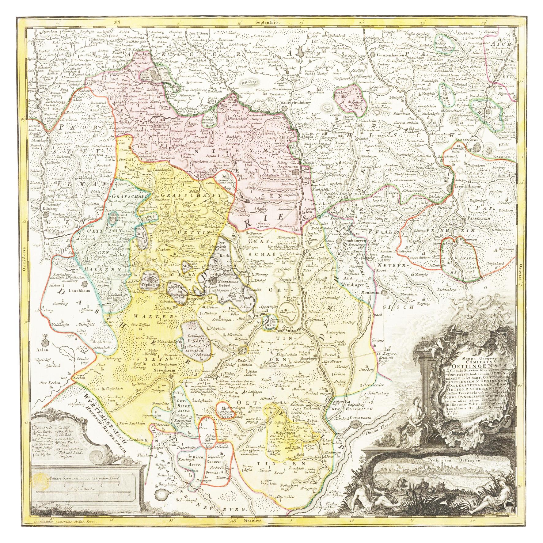 Ein Fenster zur Vergangenheit, die Historische Landkarte von Oettingen um 1744 eröffnet Dir eine beeindruckende Perspektive auf die historische Landschaft jener Zeit. Die feinen Gravurlinien und der klassische Stil erwecken die Region zum Leben, während sie elegant die Grenzen und historischen Begebenheiten darstellt. Diese Karte lässt die Zuschauer in die Epoche des 18. Jahrhunderts eintauchen, eine Zeit, in der Kartographie zugleich Wissenschaft und Kunst war. Ihr Detailreichtum und ihre historische Relevanz machen sie zu einem fesselnden Zeugnis der damaligen Welt.