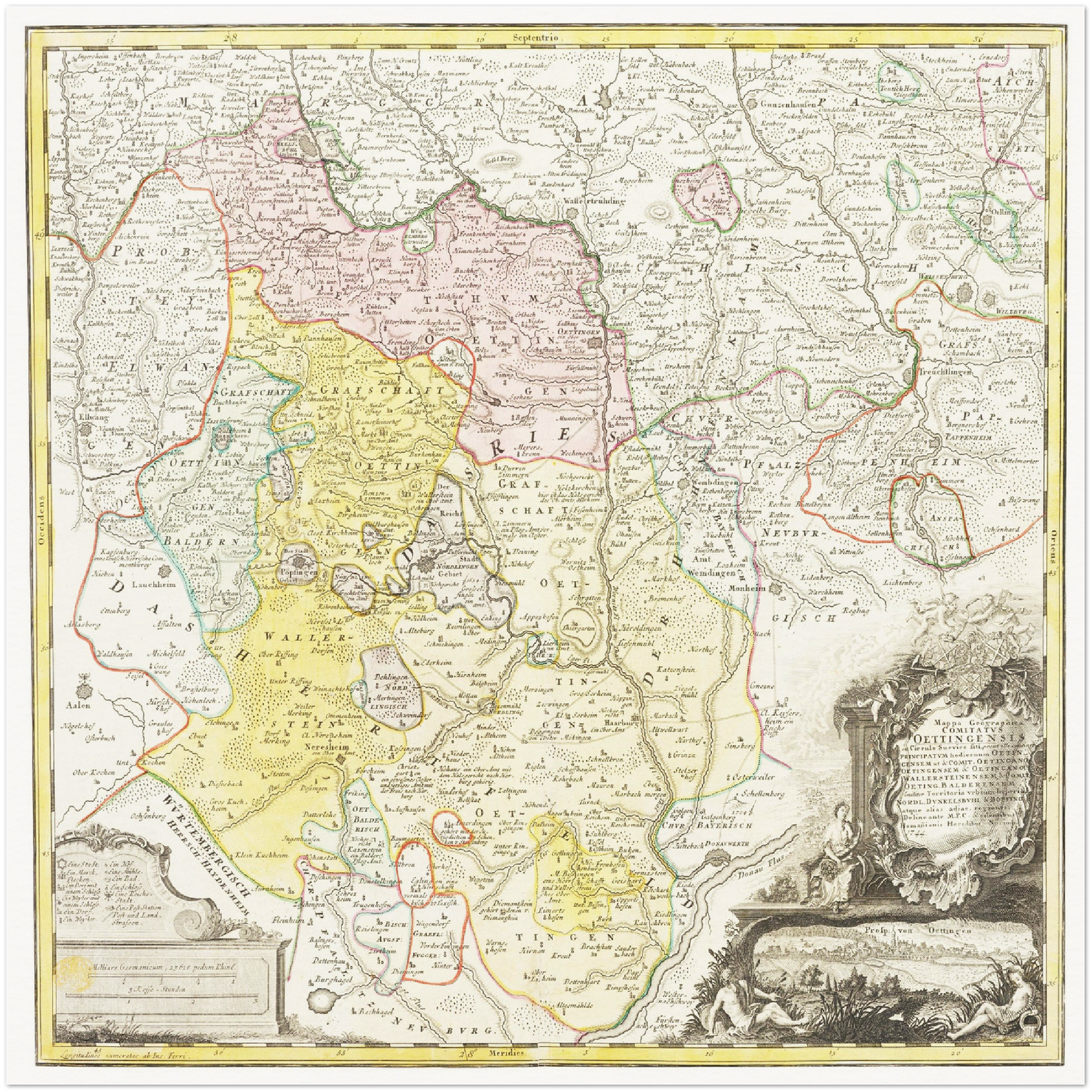 Im Kontext der Geschichte verankert, bietet diese Karte eine detailreiche Darstellung der Region Oettingen um das Jahr 1744. Zu jener Zeit zählten Karten nicht nur als Navigationshilfen, sie waren auch wertvolle Kunstobjekte und Wissensspeicher, die die politischen und geographischen Gegebenheiten enthüllten. Der Kartograph, ein meisterhafter Künstler seines Faches, vereinte akribische Präzision mit ästhetischer Finesse, was sich in der Klarheit der Details und der künstlerischen Symmetrie widerspiegelt. Symbole und die kunstvolle Darstellung der damaligen Territorien vermitteln ein Weltbild, das für heutige Betrachter nicht nur von geographischer, sondern auch von kultureller Bedeutung ist.