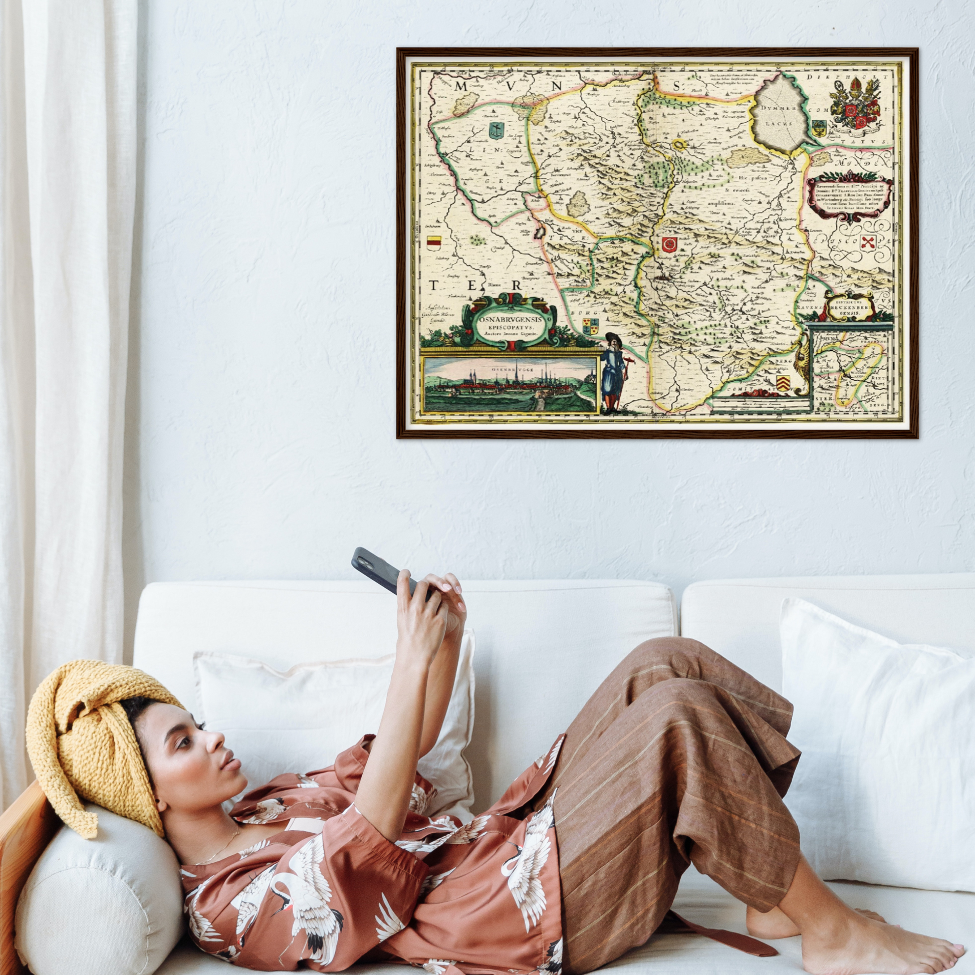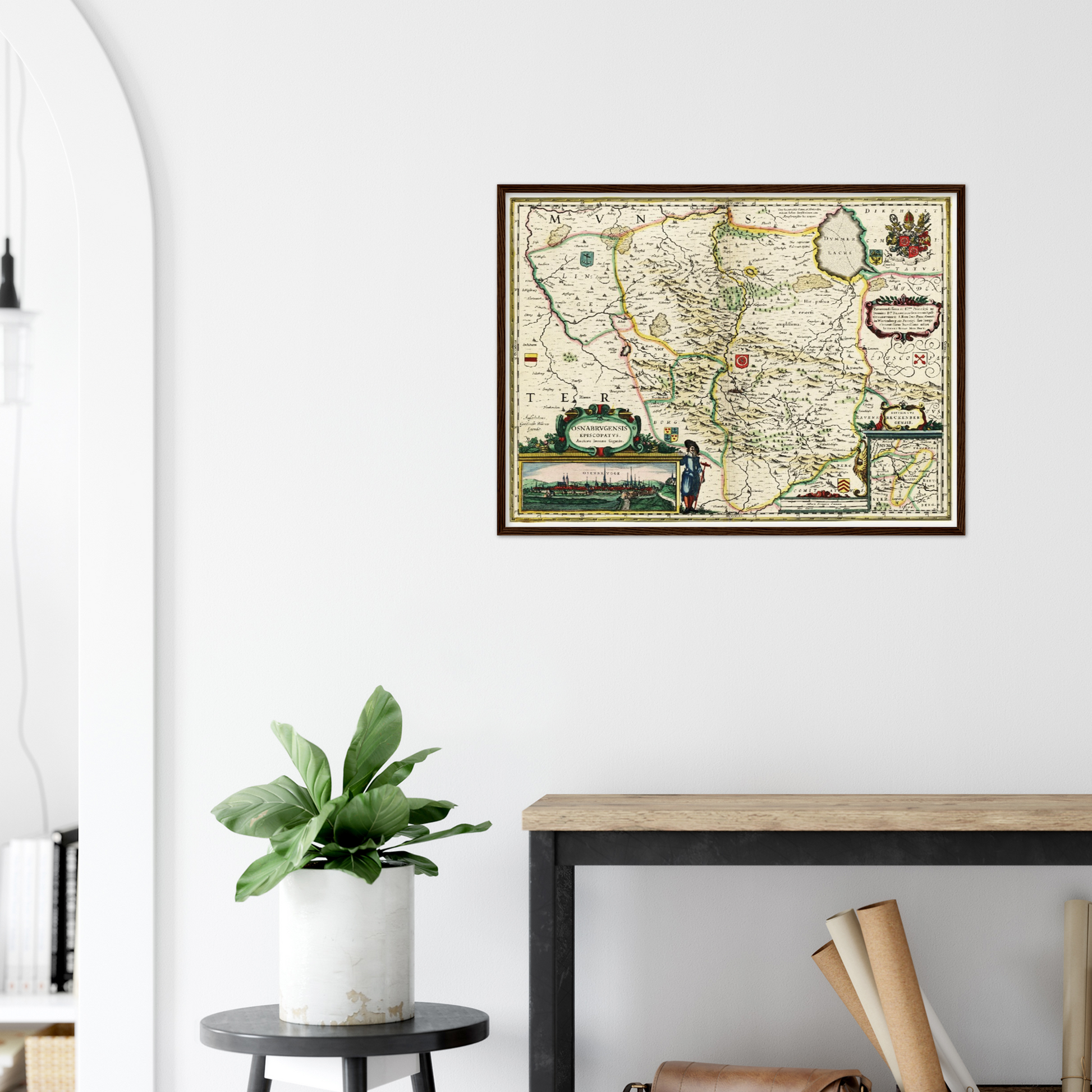 Diese exquisite Nachbildung der Landkarte von Osnabrück um 1650 bringt die Vergangenheit in greifbare Nähe und fängt den stolzen Charakter einer Stadt ein, die Zeuge unzähliger historischer Wandlungen wurde. Mit ihrer feinen Linienführung und der präzisen Gravur detailreicher Landschaften lädt sie dazu ein, vergangene Zeiten neu zu entdecken. Jede Ecke Osnabrücks, von den Stadtvierteln bis zu den natürlichen Grenzen der Region, offenbart sich in einem kunstvoll gezeichneten Bild, das nicht nur als dekoratives Element, sondern als Geschichtenerzähler brilliert. Hergestellt auf hochwertigem, dickem, mattem Papier, wird diese Karte jedem Raum eine Aura der Eleganz und Bedeutung verleihen.