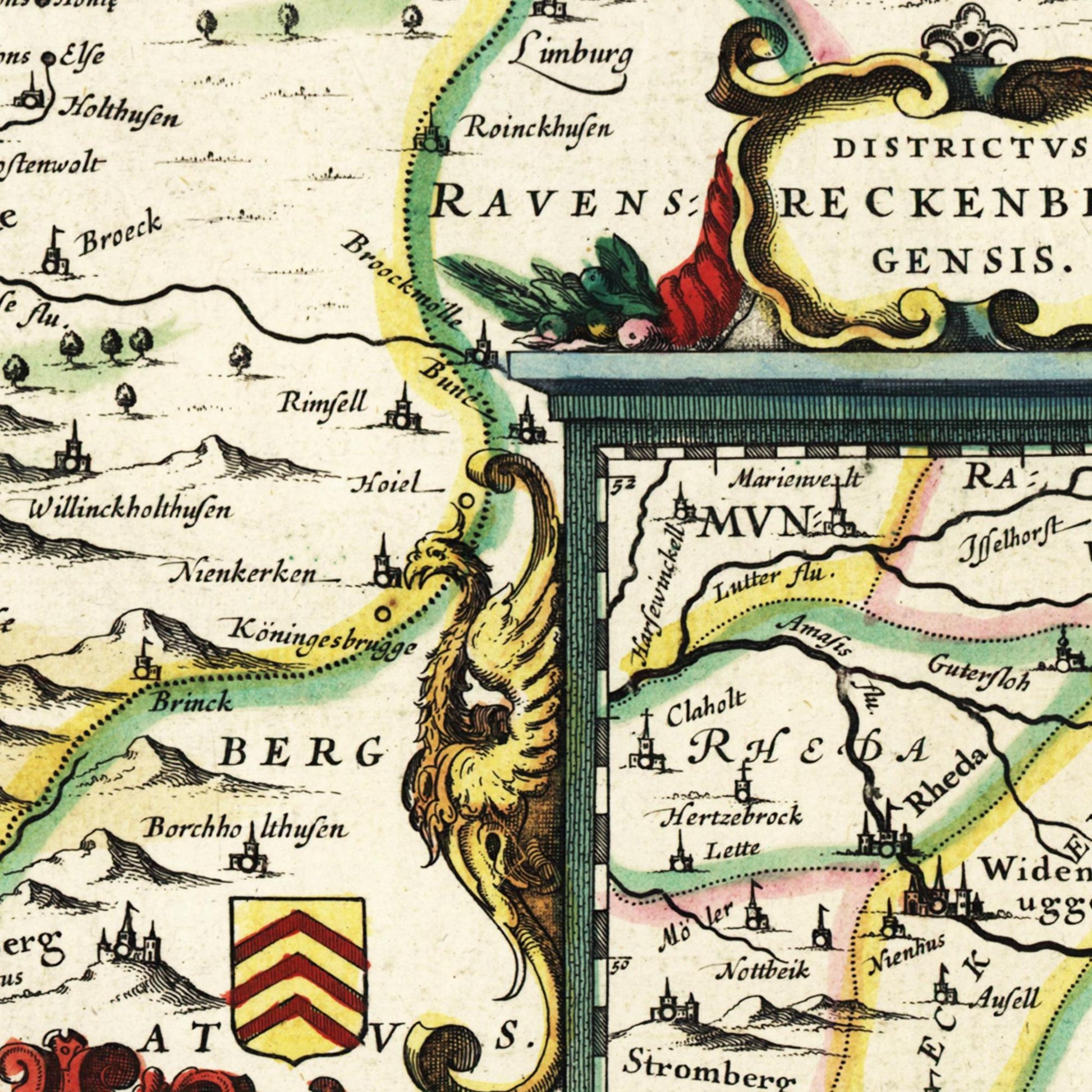 Tauchen Sie ein in die Geschichte Osnabrücks mit dieser historischen Landkarte von 1650, ein zeitloses Kunstwerk, das Eleganz und das Erbe einer bewegenden Epoche vereint.