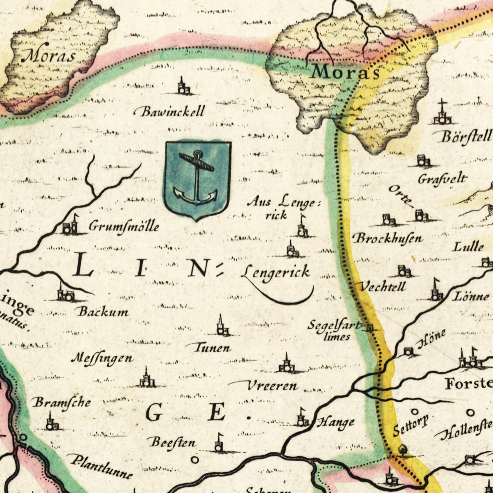 Im Jahre 1650 befand sich Osnabrück an der Schwelle zu einer neuen Ära. Die Nachwirkungen des Westfälischen Friedens, der 1648 in der Stadt besiegelt worden war, sind auf dieser Karte spürbar. Als Werk eines unbekannten, aber talentierten Kartographen dieser Zeit, spiegelt die Karte nicht nur geografische Gegebenheiten wider, sondern auch die politische und soziale Struktur einer Zeit des Wandels. Besondere Symbole und stilisierte Darstellungen von Land und Wasser ermöglichen Einblicke in die Welt der frühen Neuzeit. Heute bietet sie nicht nur Kunstliebhabern, sondern auch Historikern einen wertvollen kulturellen Referenzpunkt, der das damalige Weltbild und die Bedeutung der Region Osnabrück dokumentiert.