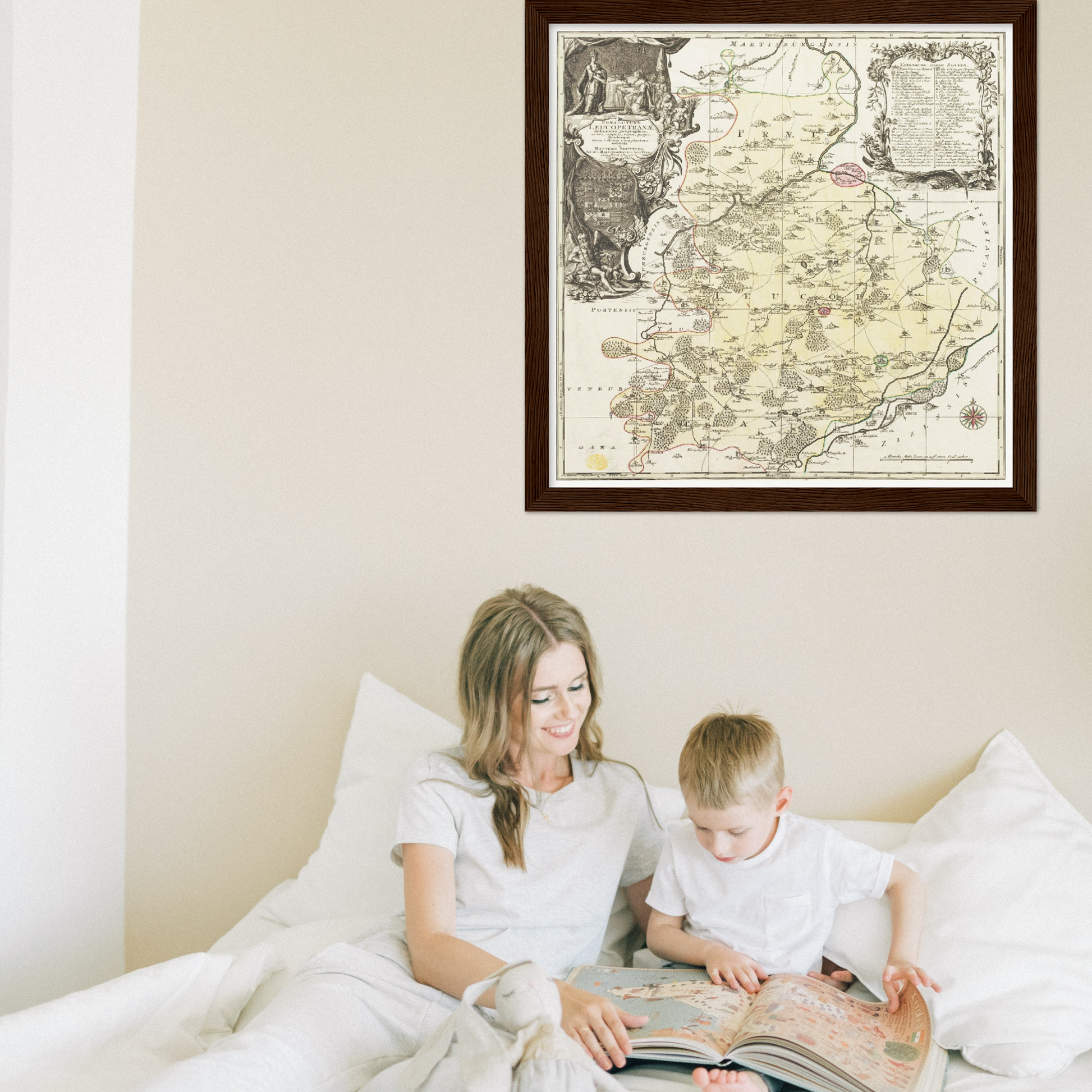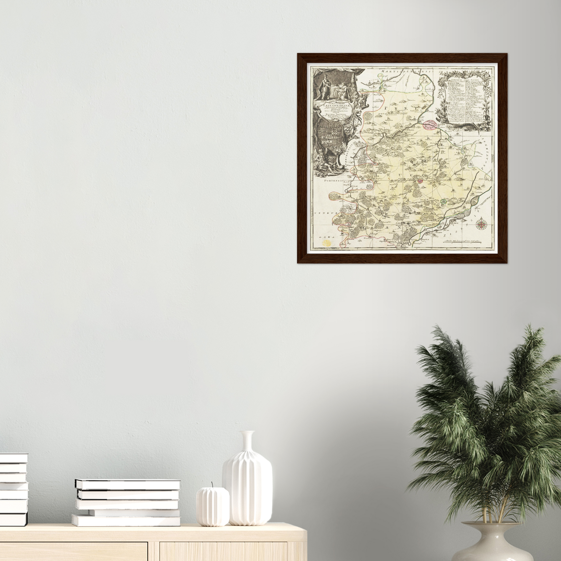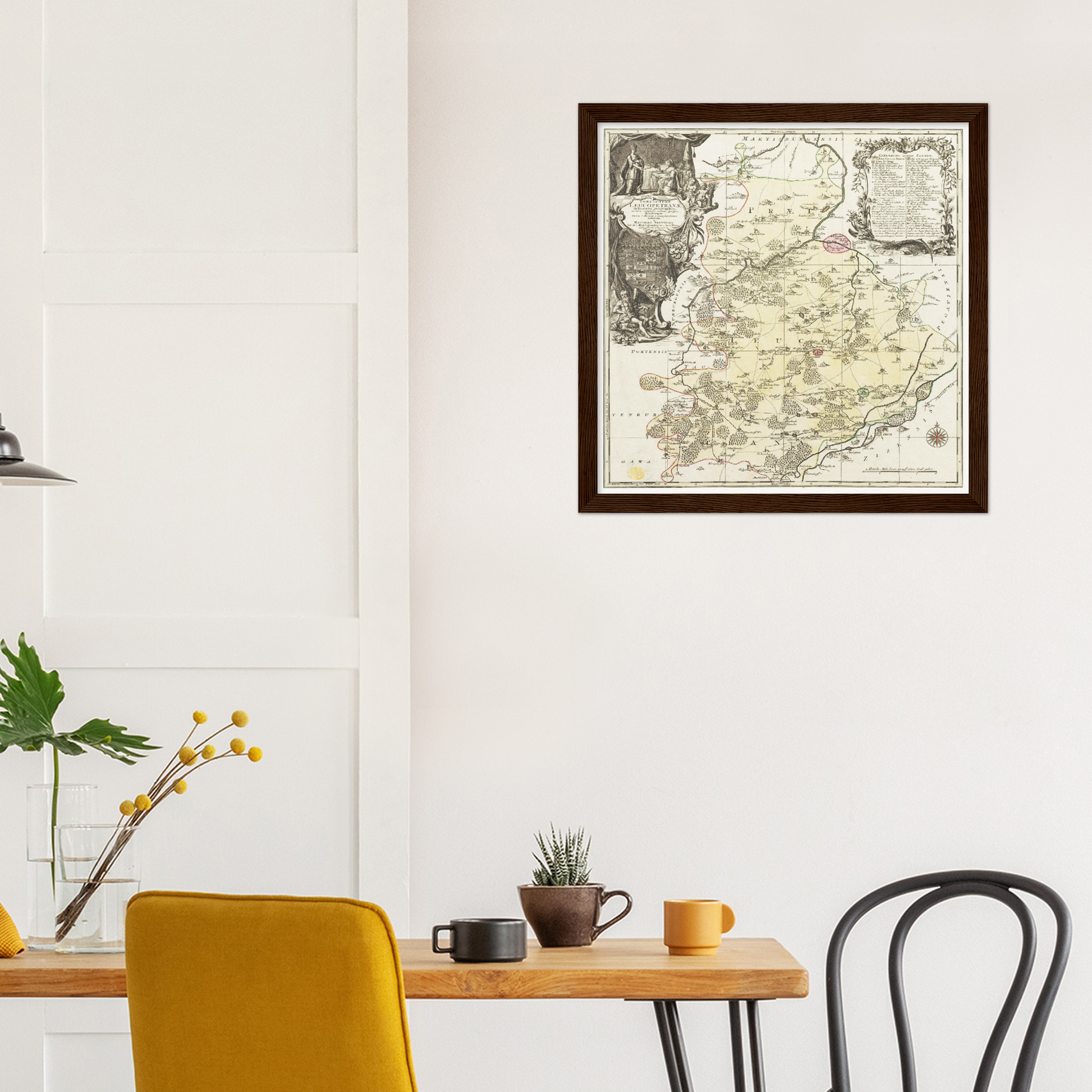 Unsere Nachdrucke entstehen in Archivqualität auf feinstem, mattem Papier (250 g/m²), das jedem Raum eine eindrucksvolle Note verleiht. Die hochauflösende Digitalisierung und farbgetreue Rekonstruktion garantieren, dass du ein Stück Geschichte in unvergleichlicher Schärfe und Brillanz erlebst. Jeder Druck wird auf Bestellung in Deutschland gefertigt und ist in 3 erlesenen Größen erhältlich: 30x30 cm. Zum Schutz wird jede Karte in einer stabilen Verpackung versandt. Optional kannst du zwischen natürlichen, dunkelbraunen oder schwarzen Holzrahmen sowie einem eleganten schwarzen Metallrahmen wählen, der mit bruchsicherem Plexiglas ausgestattet ist.