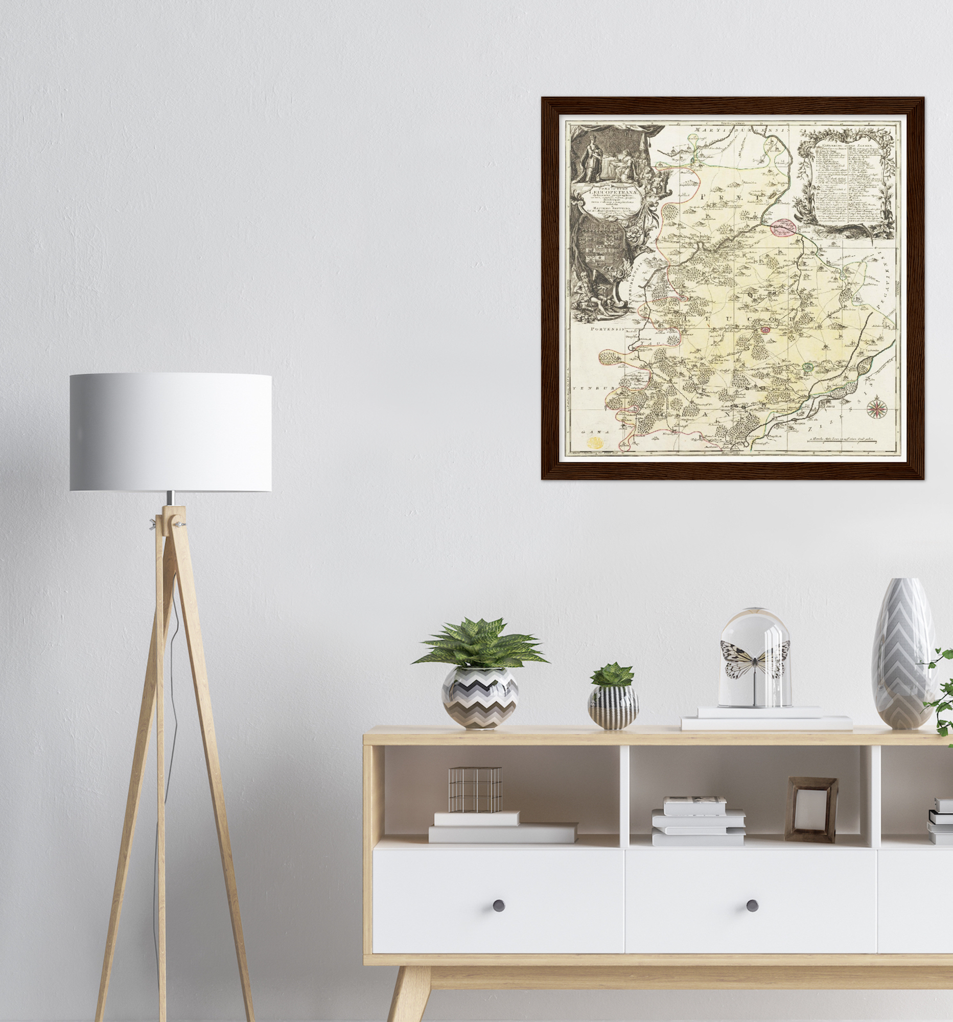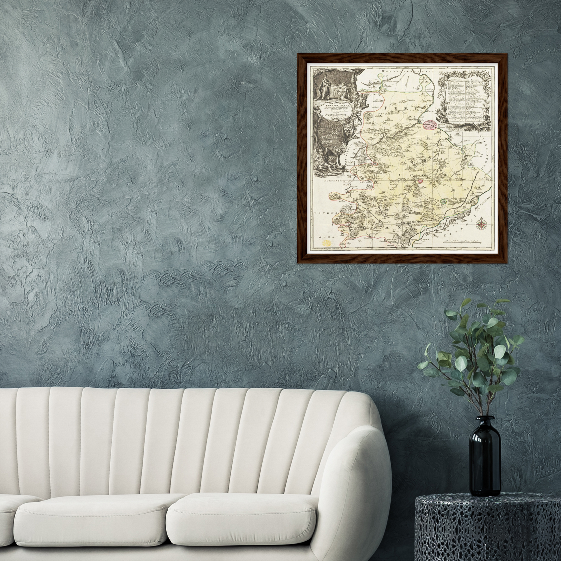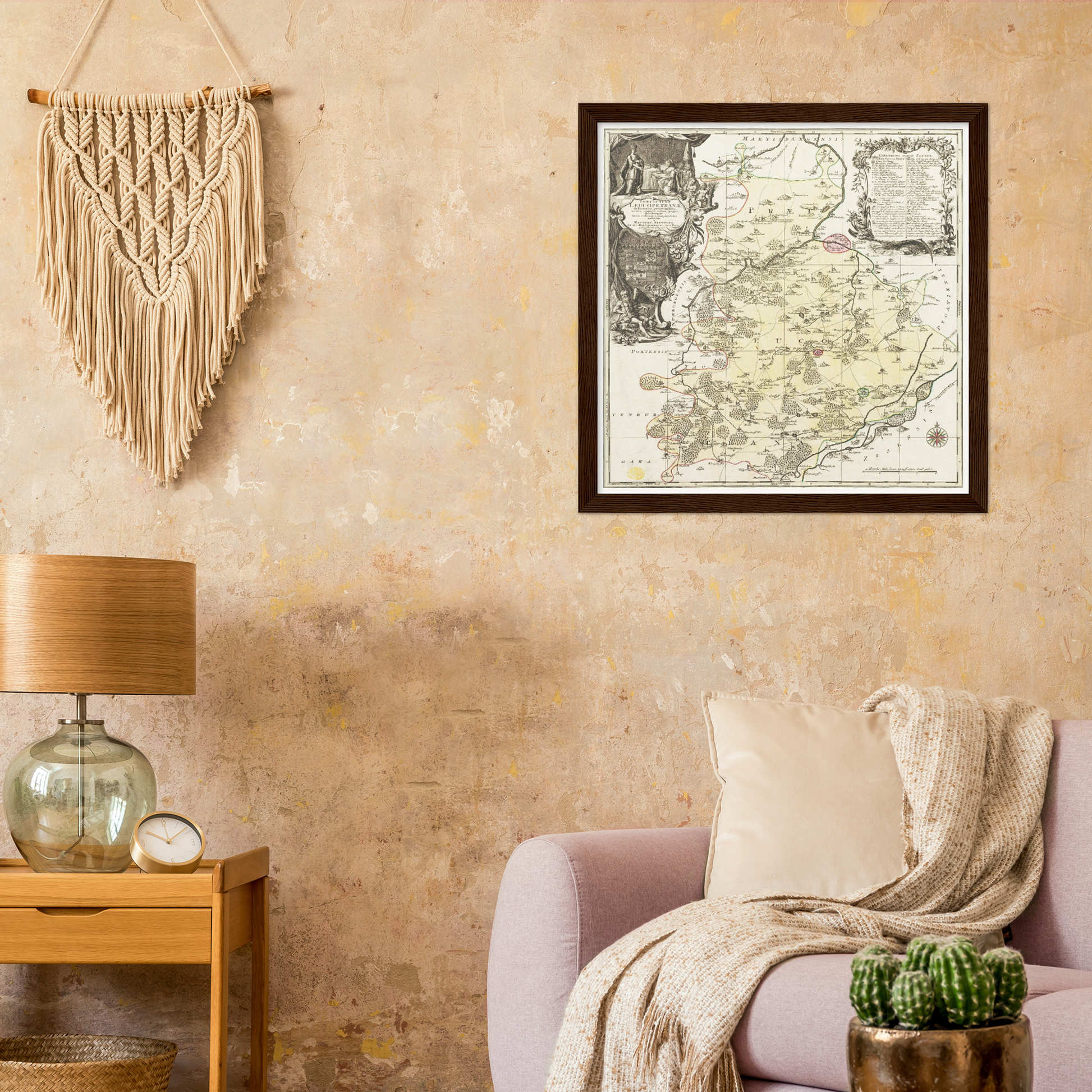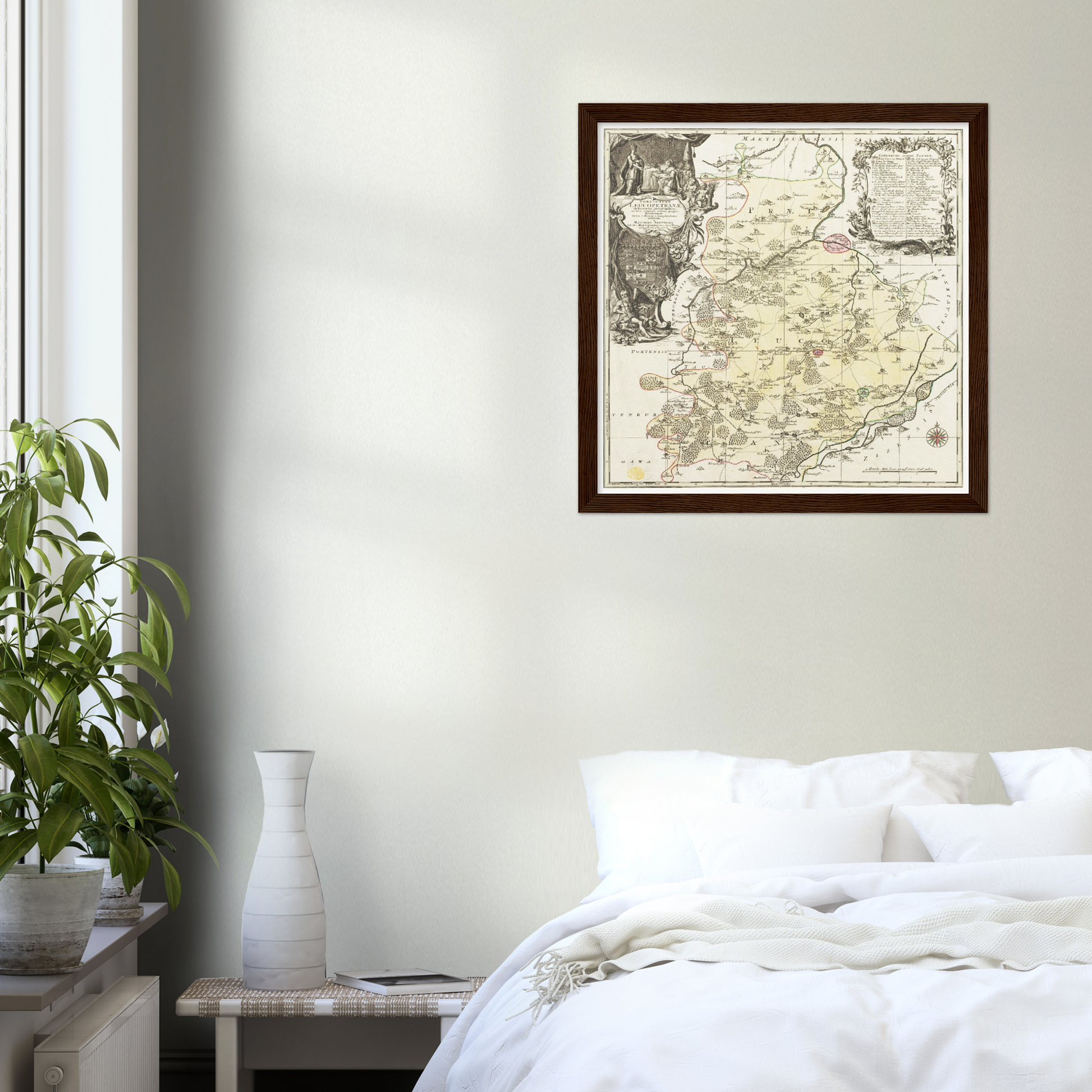 Unsere Nachdrucke entstehen in Archivqualität auf feinstem, mattem Papier (250 g/m²), das jedem Raum eine eindrucksvolle Note verleiht. Die hochauflösende Digitalisierung und farbgetreue Rekonstruktion garantieren, dass du ein Stück Geschichte in unvergleichlicher Schärfe und Brillanz erlebst. Jeder Druck wird auf Bestellung in Deutschland gefertigt und ist in 3 erlesenen Größen erhältlich: 30x30 cm. Zum Schutz wird jede Karte in einer stabilen Verpackung versandt. Optional kannst du zwischen natürlichen, dunkelbraunen oder schwarzen Holzrahmen sowie einem eleganten schwarzen Metallrahmen wählen, der mit bruchsicherem Plexiglas ausgestattet ist.