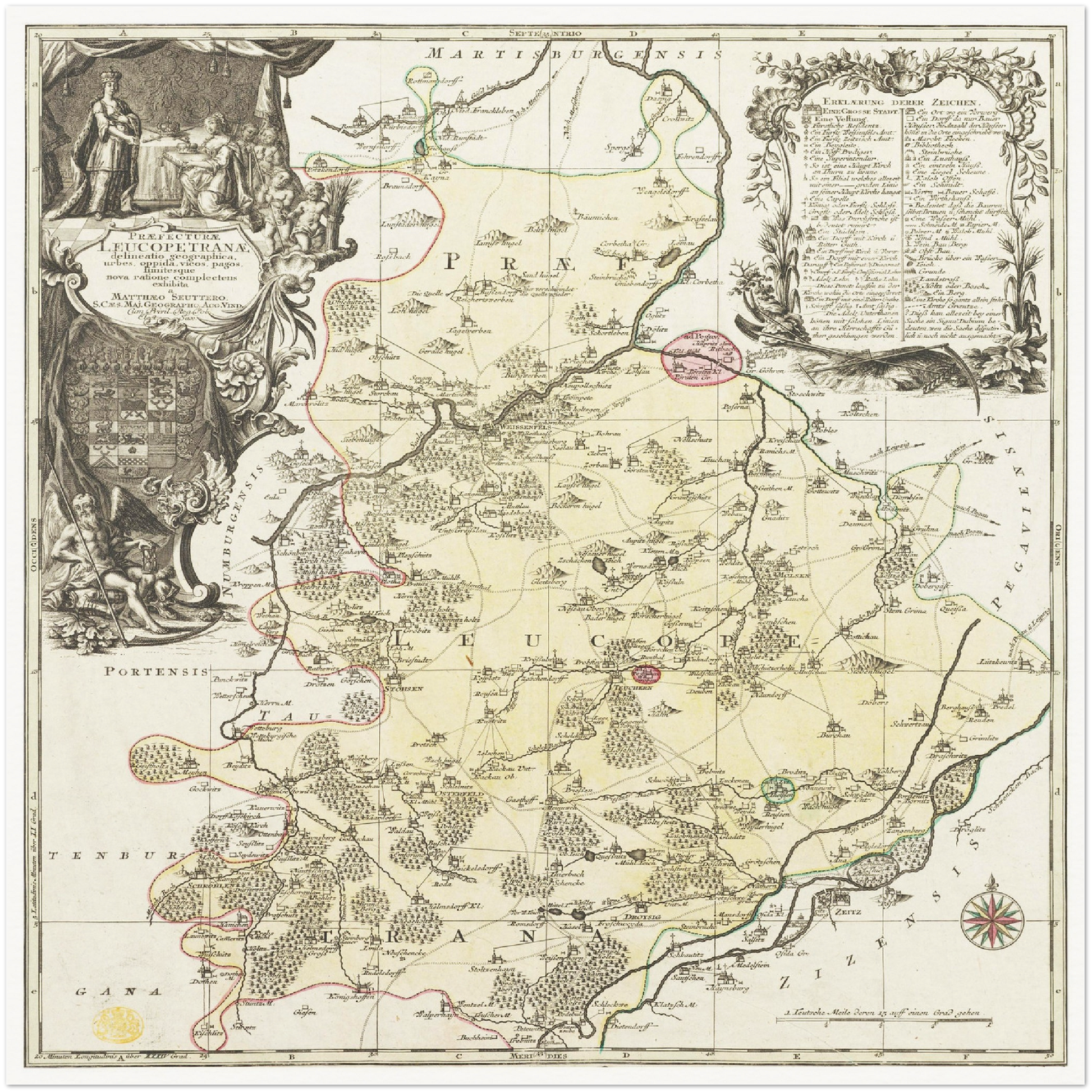 Die Landkarte von Teuchern um 1750 ist ein bemerkenswertes Zeugnis ihrer Zeit. Im 18. Jahrhundert, einer Ära des Wandels und der Erkundung, spielte die Kartographie eine entscheidende Rolle bei der Erschließung neuer Gebiete und der Darstellung der bekannten Welt. Diese Karte, von einem unbekannten, aber zweifellos meisterhaften Kartographen gefertigt, zeigt die Region in ihrer historischen Ausdehnung und Detailgenauigkeit.