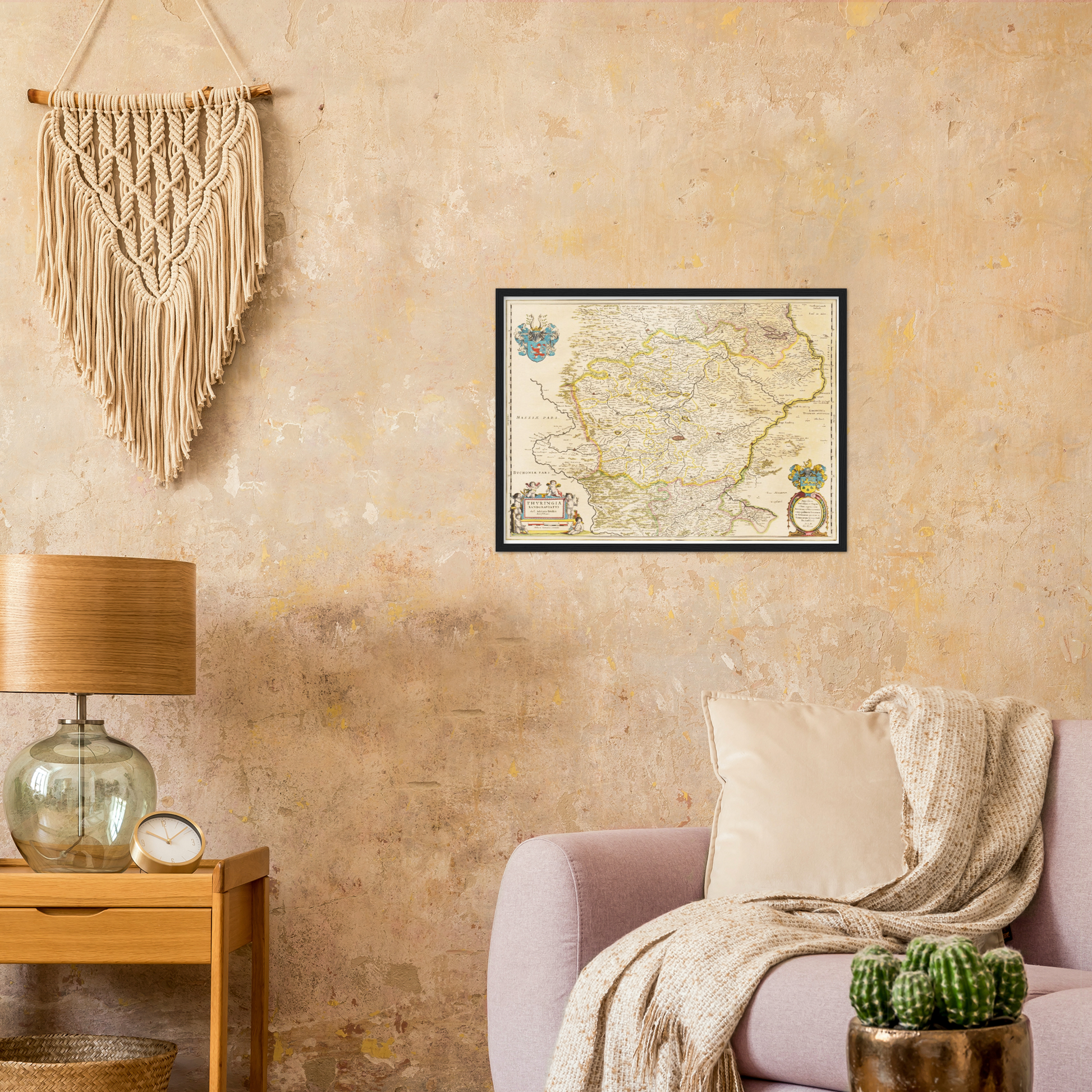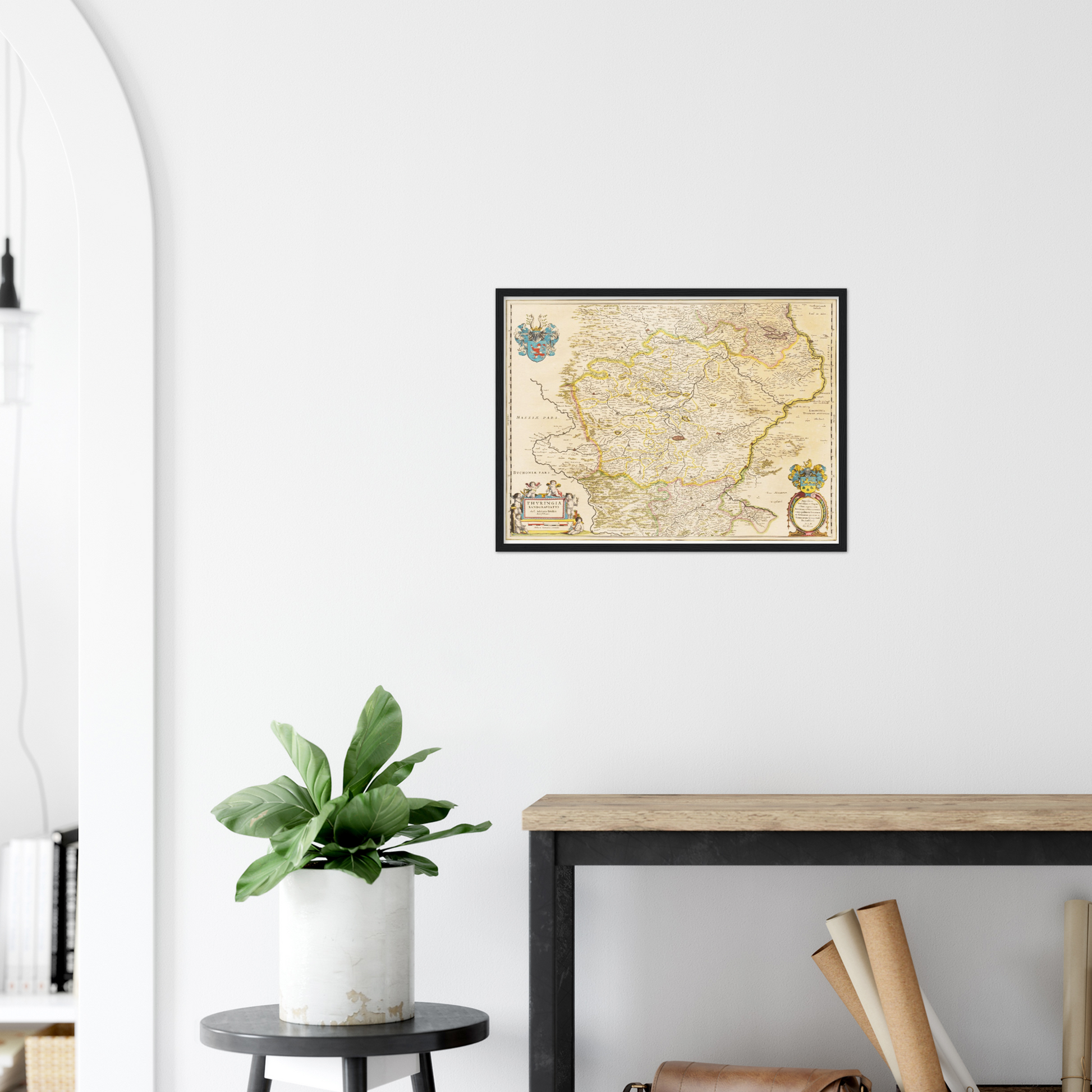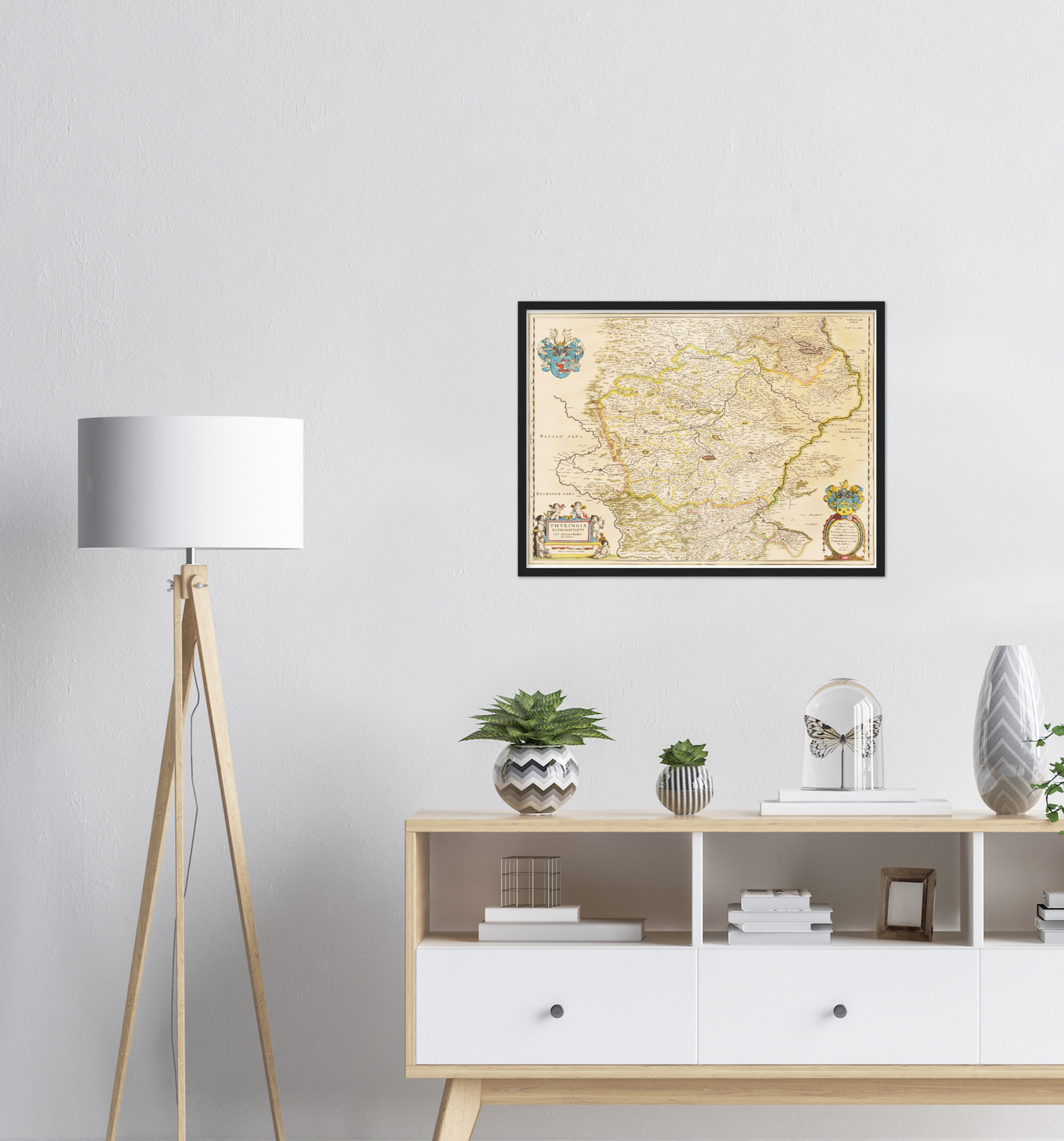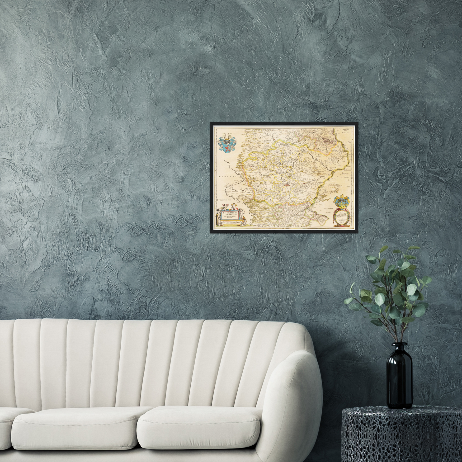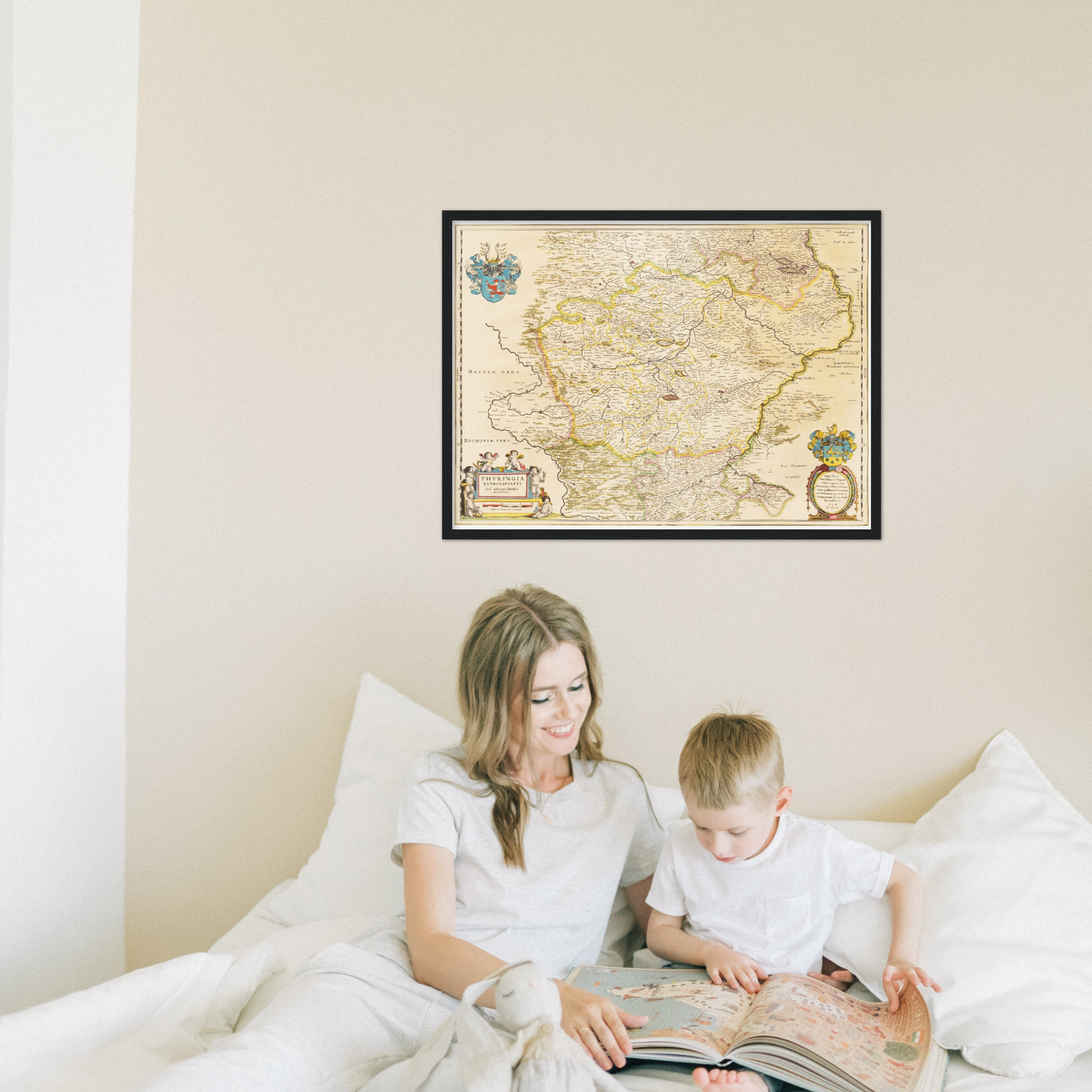 Diese historische Landkarte aus Thüringen um 1635 ist nicht nur ein Fenster in die Geschichte, sondern ein Meisterwerk der Kartographie. Lassen Sie sich von den präzisen Linien und den künstlerischen Gravuren entführen in eine längst vergangene Zeit, in der das Reisen noch ein Abenteuer war. Die Bedeutung dieser Region im Herzen von Deutschland spiegelt sich in jedem Detail wider. Der Druck auf dickem, mattem Papier verleiht ihm eine besondere Aura, während die geschichtsträchtige Darstellung die Fantasie beflügelt. Dekorieren Sie Ihr Zuhause oder Ihr Büro mit einer Karte, die nicht nur als Dekoration dient, sondern auch Geschichten erzählt und Erinnerungen weckt.