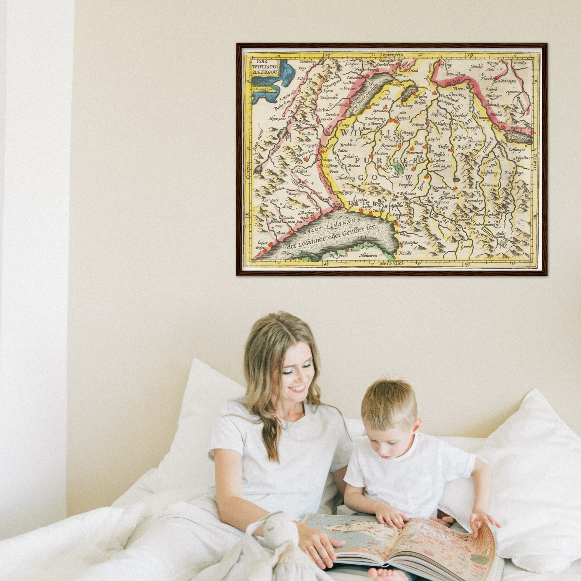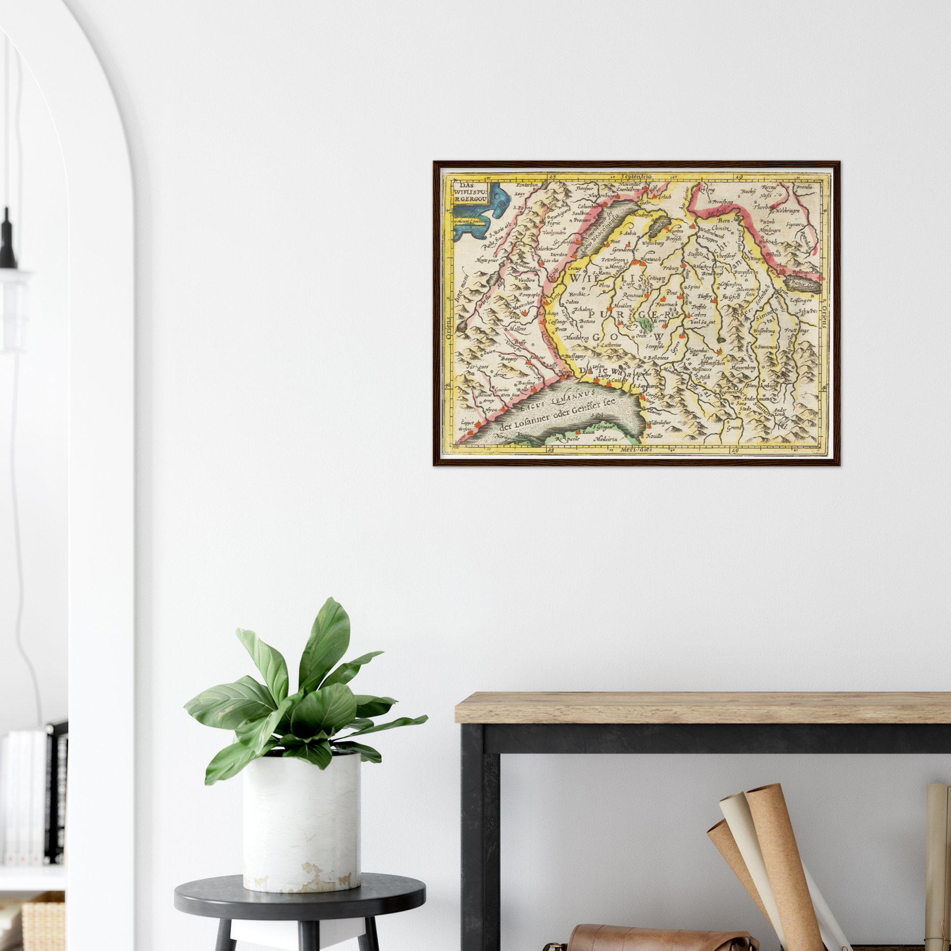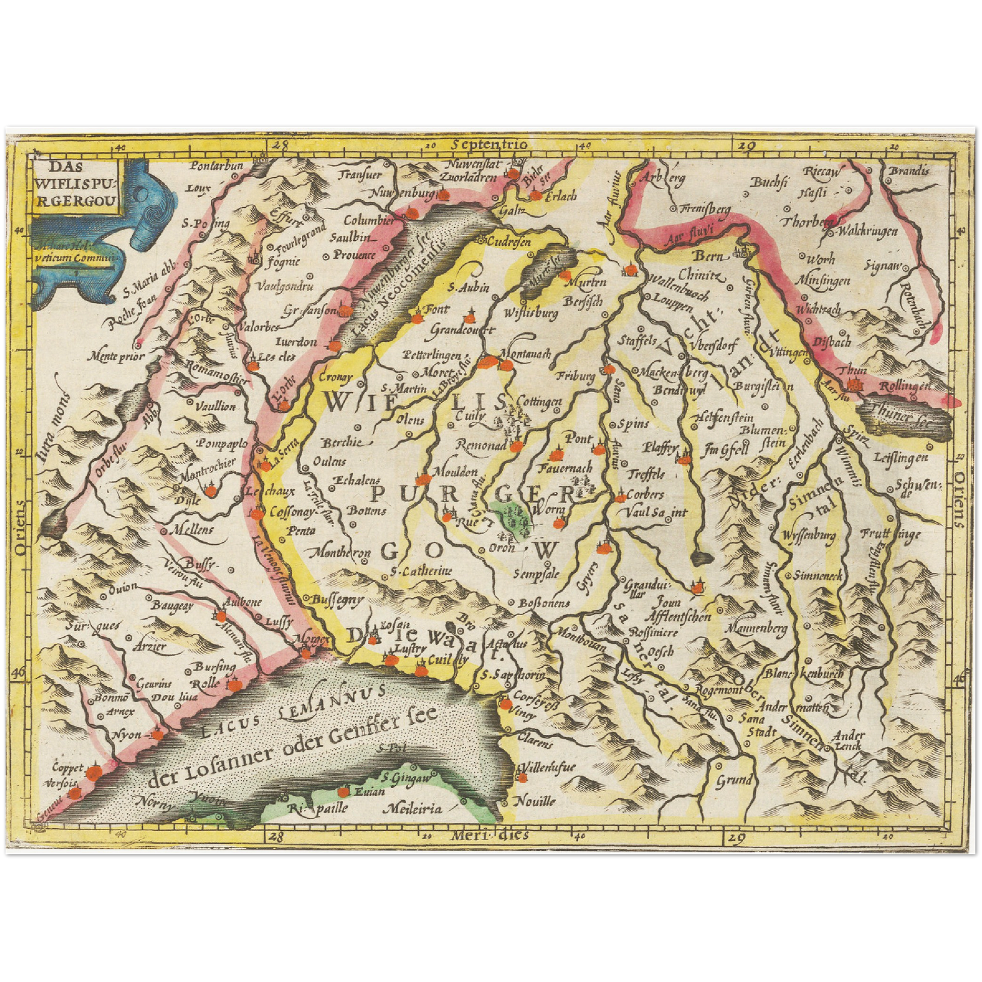 Verlieren Sie sich mit der historischen Landkarte des Wiflisburgergaus aus dem Jahr 1609 in einer Zeit, in der sich die Welt kontinuierlich veränderte und entfaltete. Diese Karte öffnet ein Fenster zu einer Ära der Entdeckungen und territorialen Umbrüche, während sie den Übergang der Region von mittelalterlicher Beständigkeit zu modernem Wandel wiedergibt. Ihre Gravurlinien sind nicht nur kunstvoll ausgeführt, sondern tragen auch die Poesie von Karte, Kompass und Geschichte in sich. Der Detailreichtum und die Präzision, mit der sich jeder Flusslauf, jede Anhöhe und Ortschaft auf der Karte entfaltet, laden den Betrachter ein, eine Zeit zu erkunden, in der Karten viel mehr waren als Wegweiser – nämlich Ausdruck einer sich erweiternden Weltanschauung.