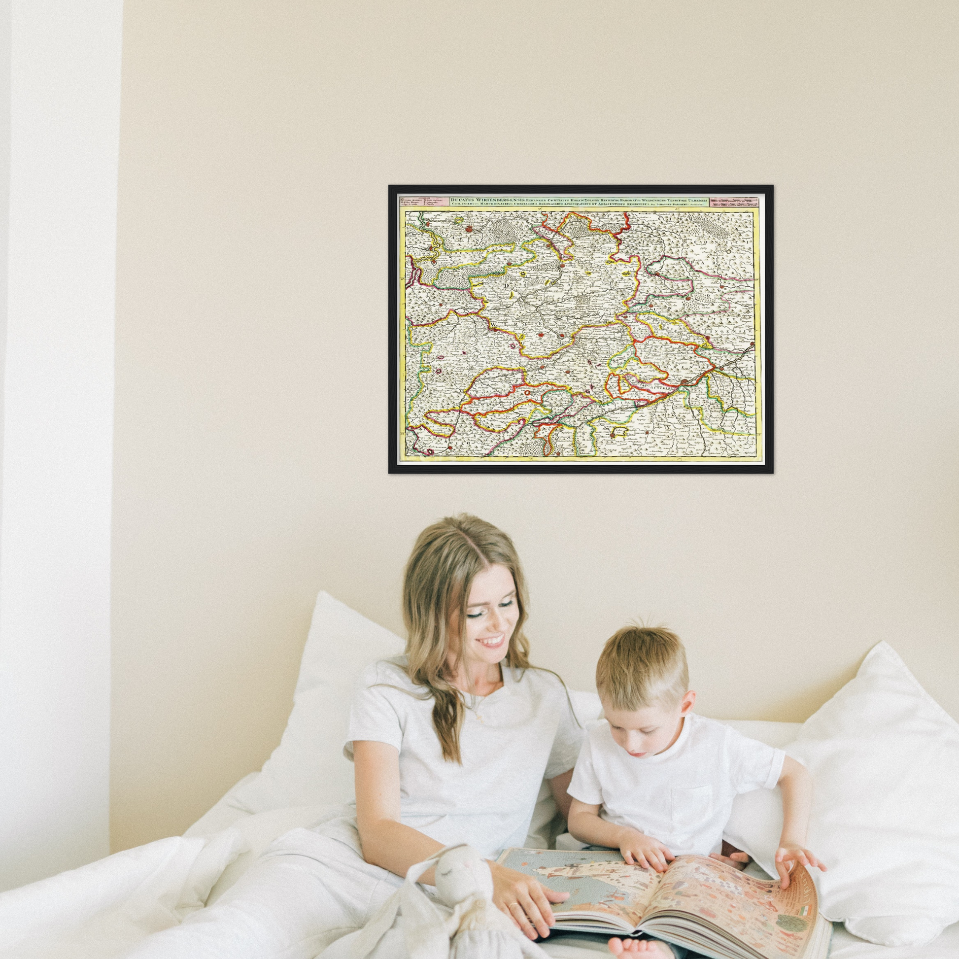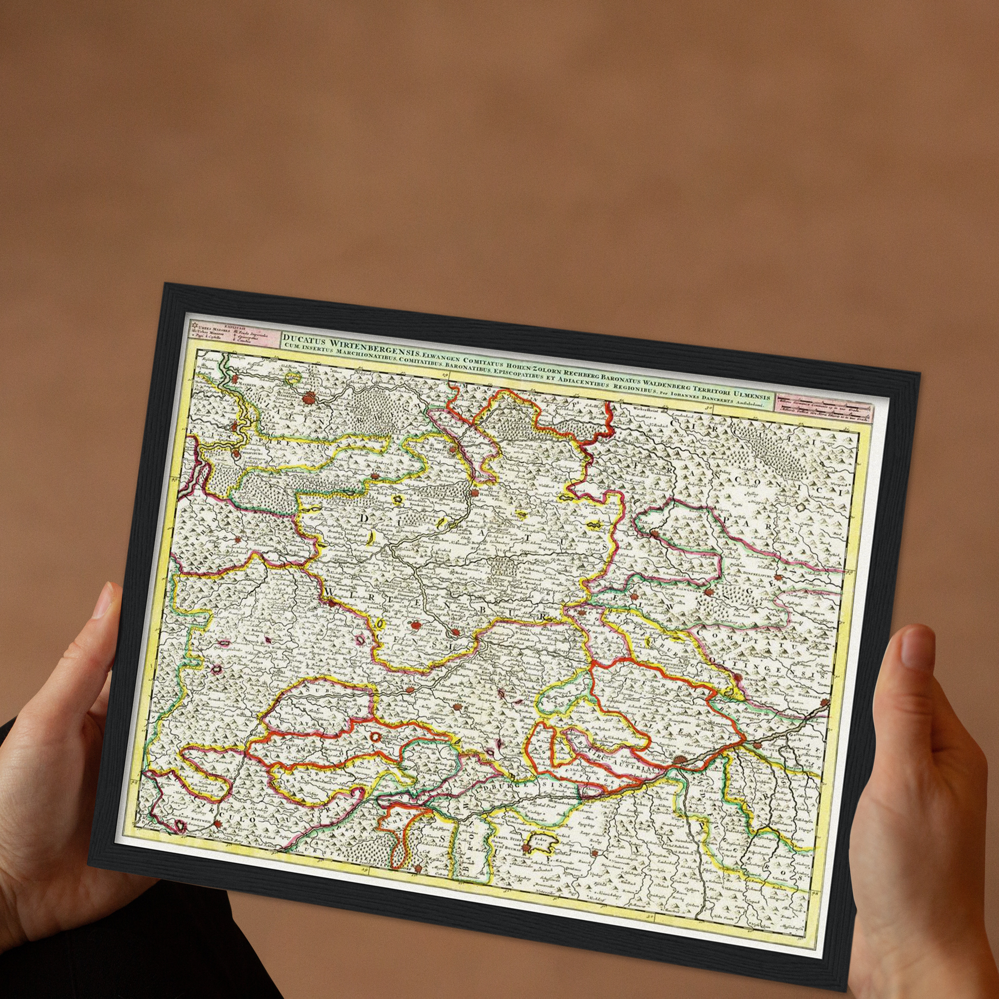Diese Karte ist mehr als nur ein historischer Nachdruck — sie ist ein Stück Heimat und Erinnerung. Viele Kunden wählen diese Darstellung von Württemberg als Geschenk für Menschen, die mit der Region verbunden sind, sei es durch ihre Wurzeln oder durch die Liebe zur heimischen Geschichte. Ein Blick auf diese Karte weckt Emotionen und verbindet Generationen über die Jahrhunderte hinweg. Sie ist nicht nur ein dekoratives Element, sondern auch ein persönlicher Anker in der Geschichte.