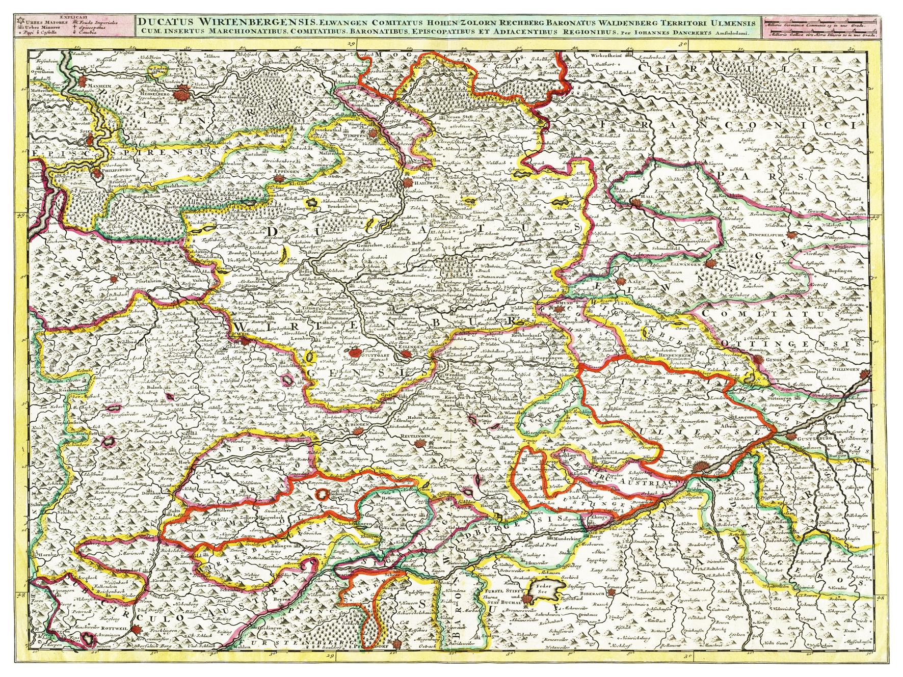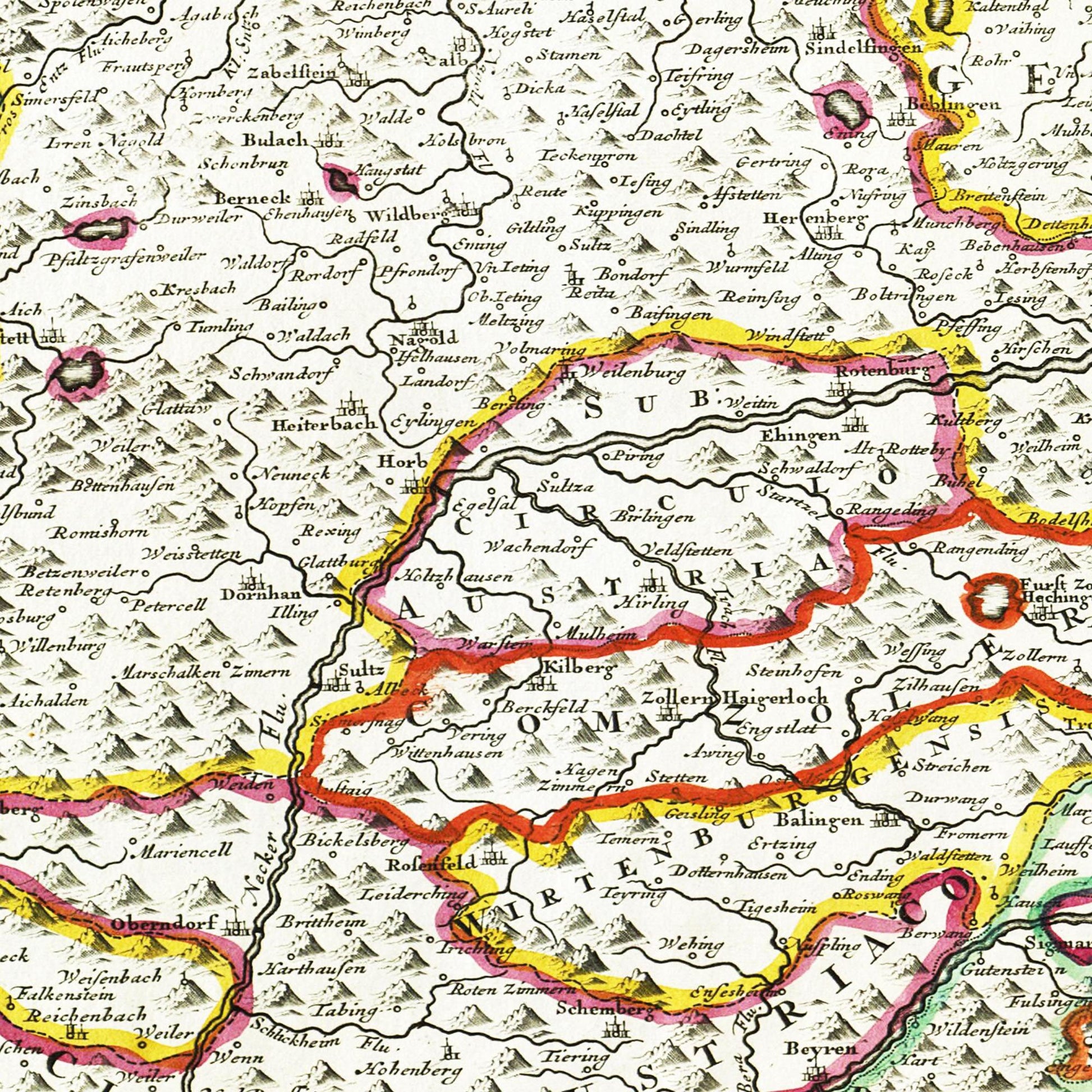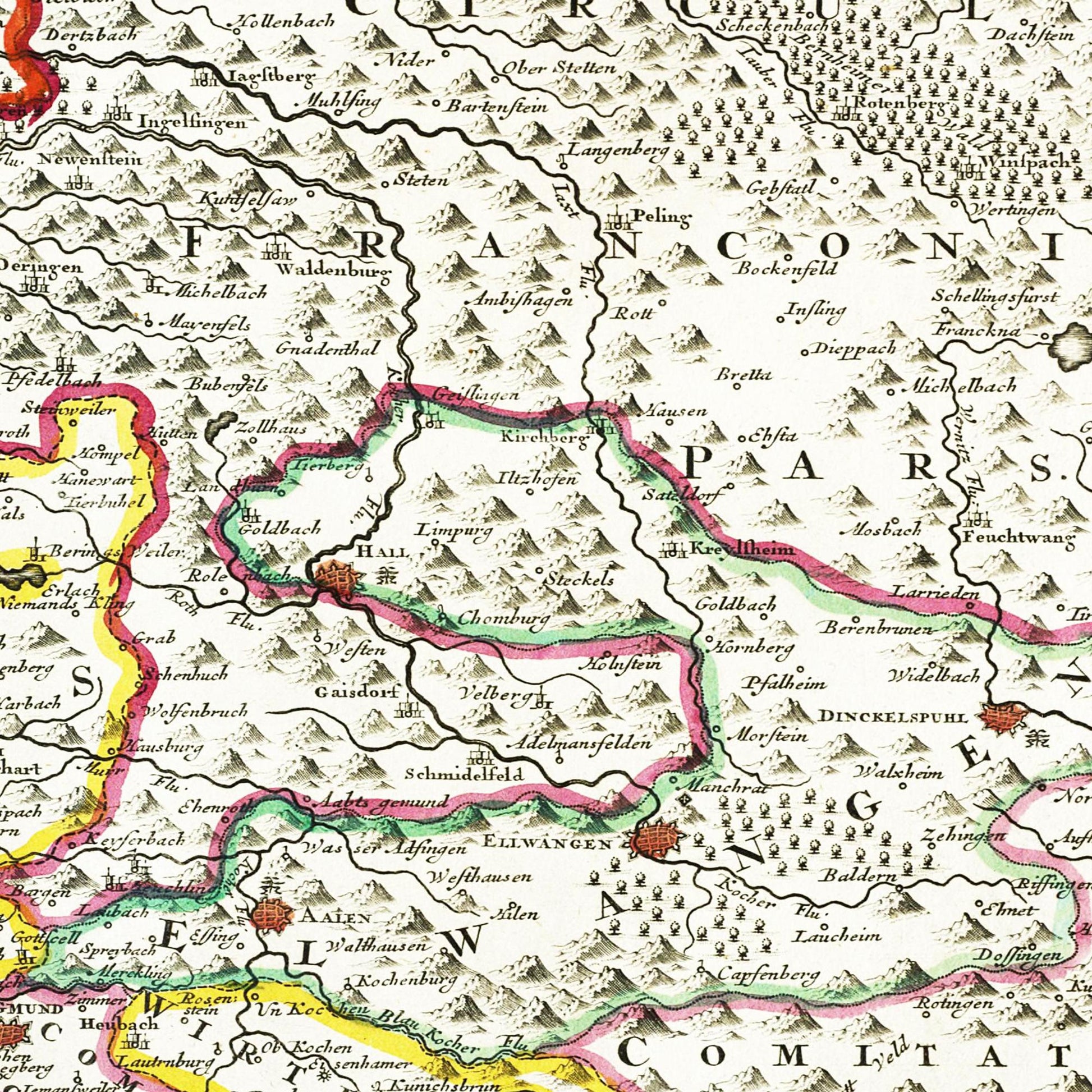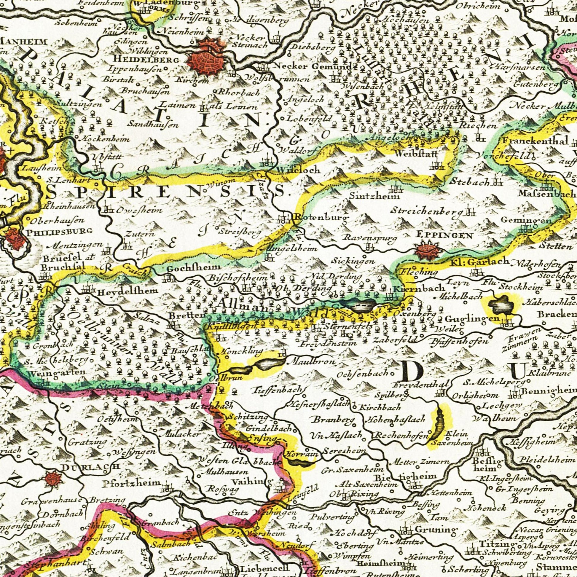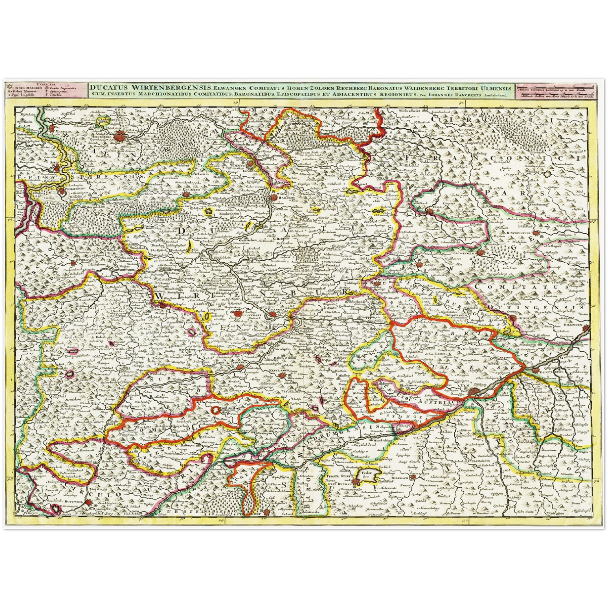 Die Karte von Württemberg aus dem Jahr 1680 entstammt einer Zeit des Wandels und der Entdeckungen. Als Teil eines Atlanten, der die Welt jener Epoche dokumentiert, vervollständigt sie das Bild von Europa im ausgehenden 17. Jahrhundert. Der Kartograph, ein Meister seines Fachs, vereinte wissenschaftliche Präzision mit künstlerischem Ausdruck. Charakteristisch für diese Karte sind die detailgetreuen Darstellungen von Landschaftsformen und Siedlungen, die heute wertvolle kulturelle Zeugnisse darstellen. Die Karte öffnet dem Betrachter ein Fenster in eine Zeit, in der Karten nicht nur Wegweiser, sondern auch kunstvolle Schöpfungen waren.